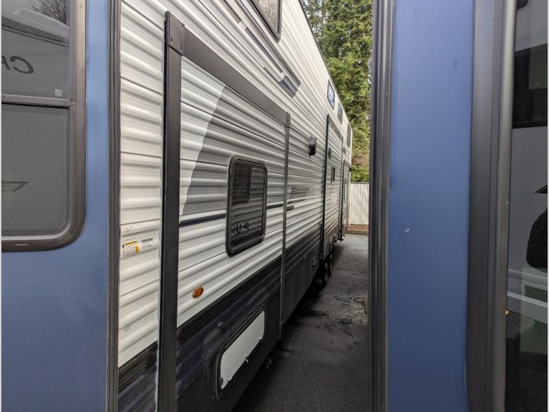 You won't believe the amount of comfort found in this destination trailer! There are two separate loft areas; one up front with a ladder, two bunk mats, storage space, and an optional fireplace, and one in the back with a ladder, two bunk mats, storage space, and a nightstand! On the main level, you'll find your own space in the front private bedroom, complete with a king bed slide, a countertop, dresser, and even washer and dryer prep. And a full bath is right next to the bedroom for easy nighttime use. Head to the full kitchen where you'll find all the appliances to cook meals, a kitchen island with an extension for more prep space, plus two pantries, one being hidden behind the TV! The comfort continues on in the rear master bedroom, complete with a queen bed slide, a desk with a chair, and a wardrobe for clothes. And the second full bath is found in the very back for added convenience!