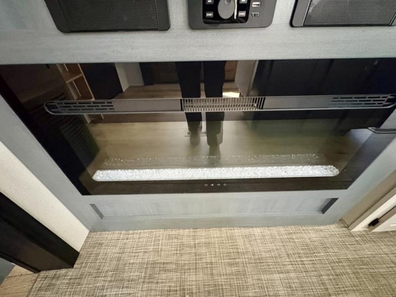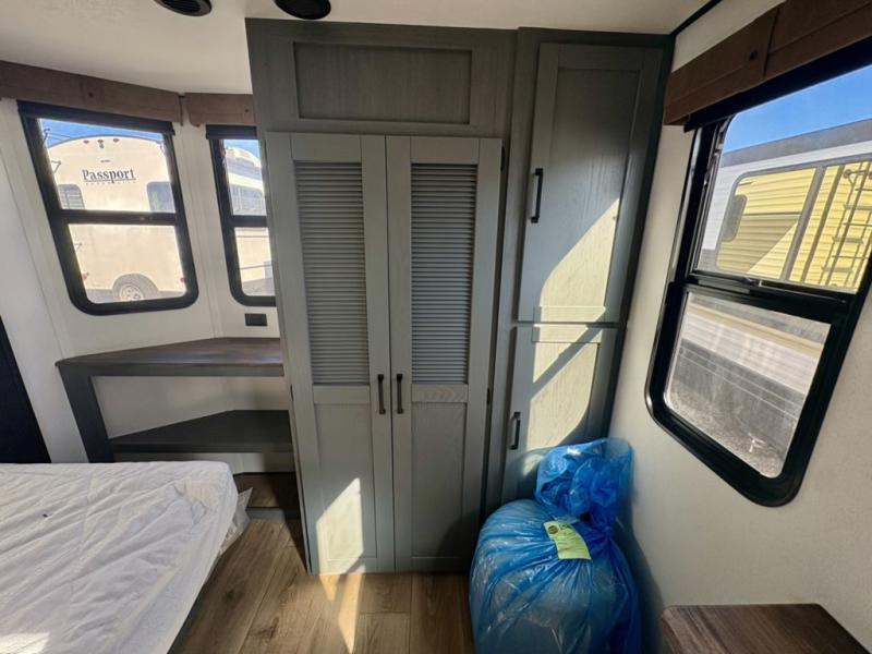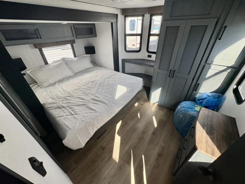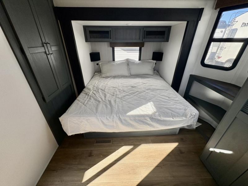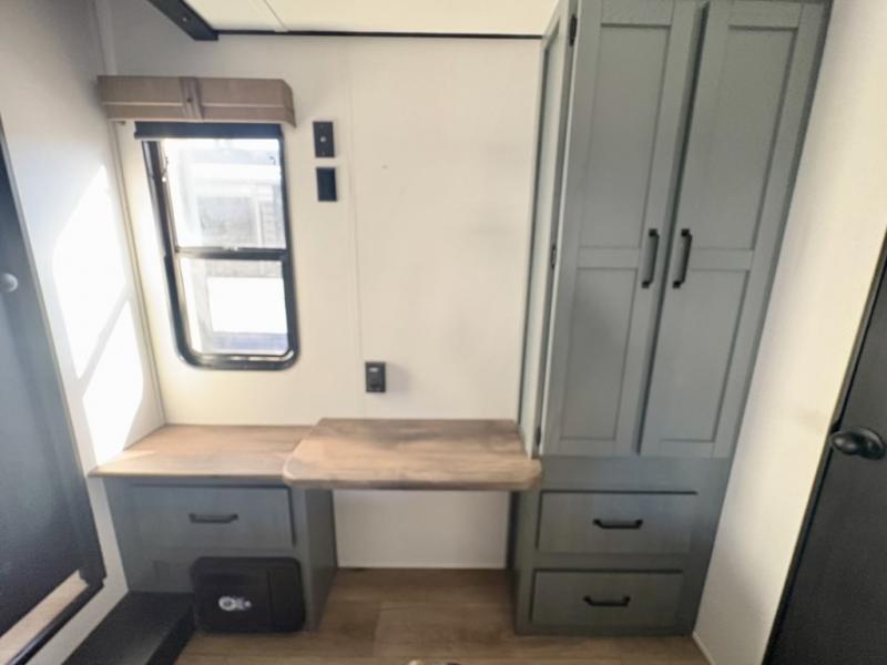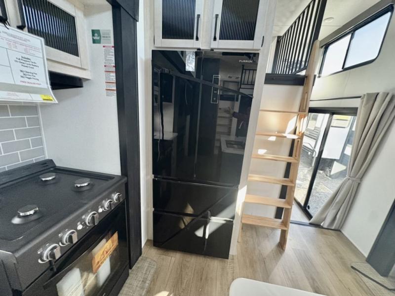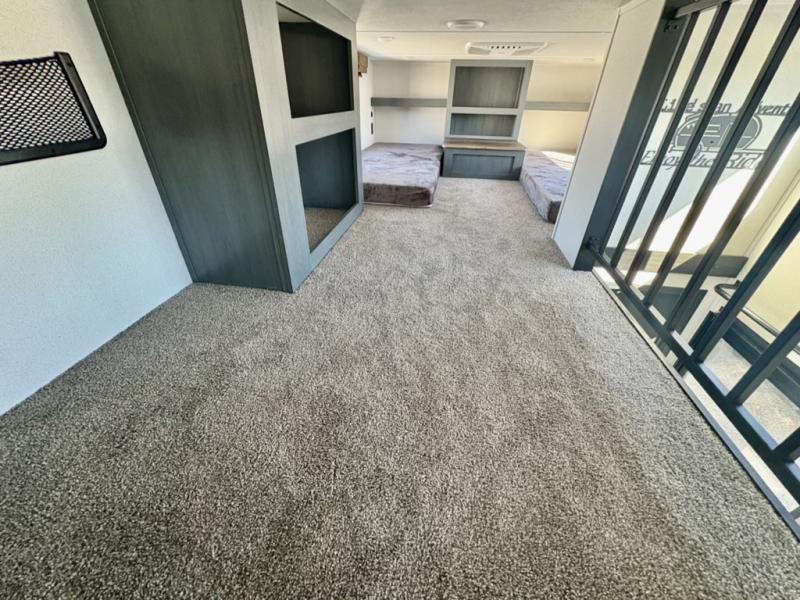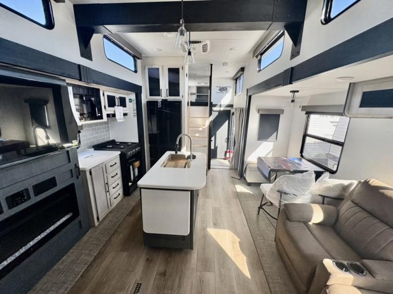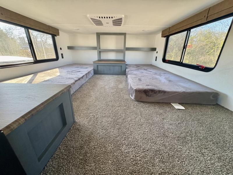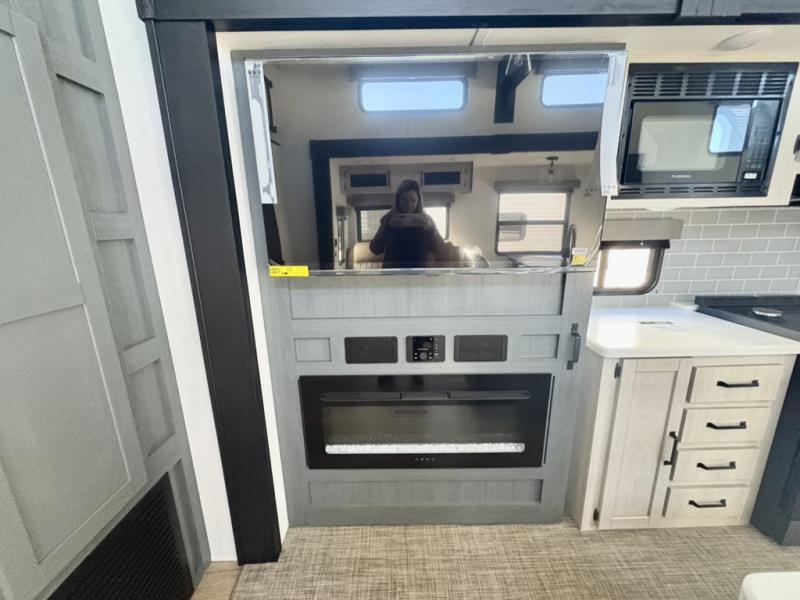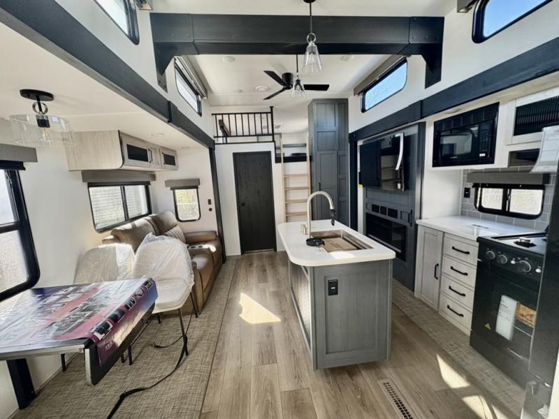 You won't believe the amount of comfort found in this destination trailer! There are two separate loft areas; one up front with a ladder, two bunk mats, storage space, and an optional fireplace, and one in the back with a ladder, two bunk mats, storage space, and a nightstand! On the main level, you'll find your own space in the front private bedroom, complete with a king bed slide, a countertop, dresser, and even washer and dryer prep. And a full bath is right next to the bedroom for easy nighttime use. Head to the full kitchen where you'll find all the appliances to cook meals, a kitchen island with an extension for more prep space, plus two pantries, one being hidden behind the TV! The comfort continues on in the rear master bedroom, complete with a queen bed slide, a desk with a chair, and a wardrobe for clothes. And the second full bath is found in the very back for added convenience!