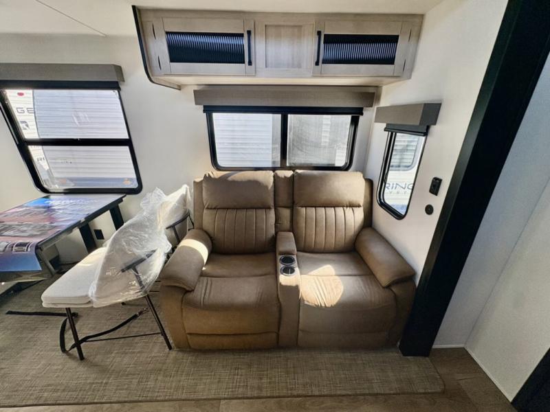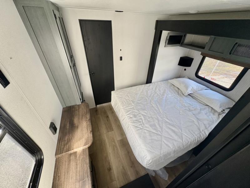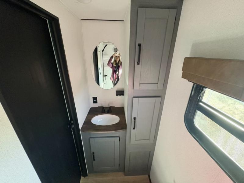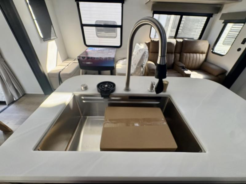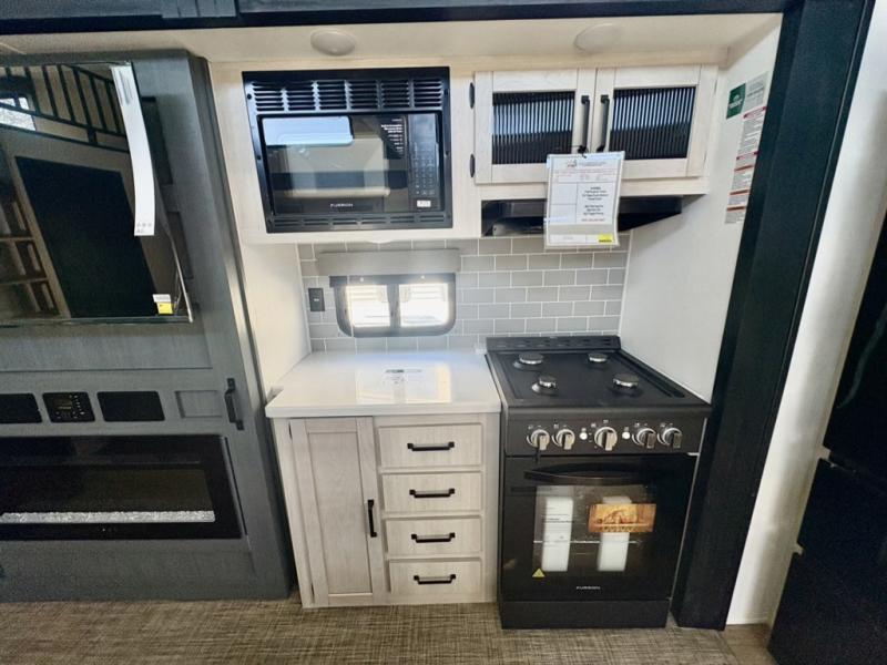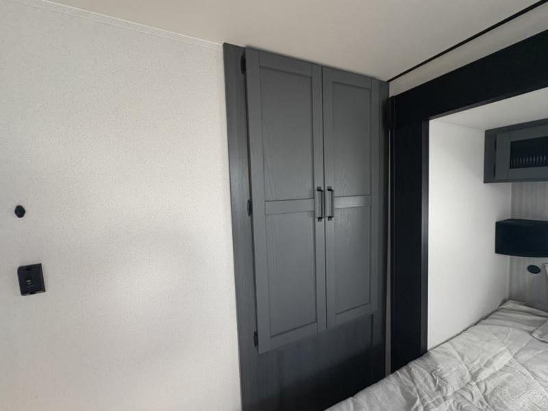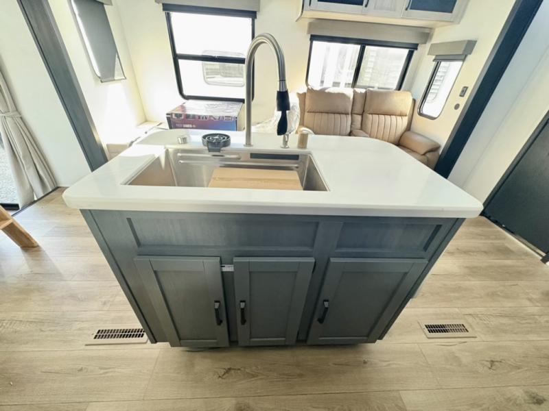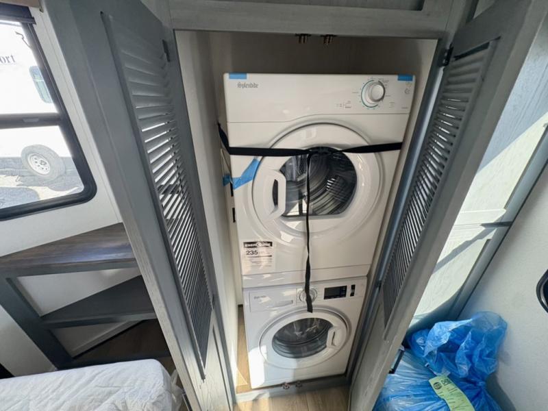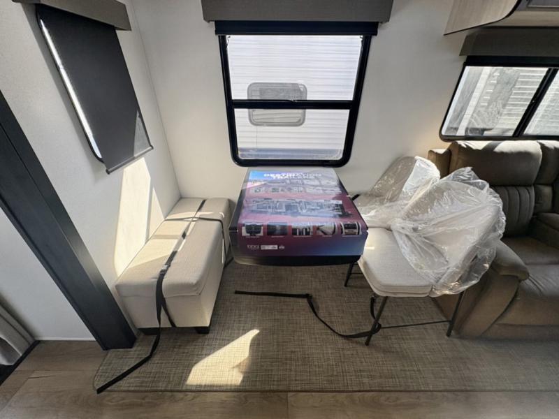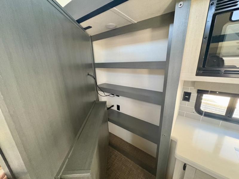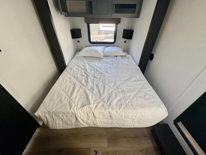 You won't believe the amount of comfort found in this destination trailer! There are two separate loft areas; one up front with a ladder, two bunk mats, storage space, and an optional fireplace, and one in the back with a ladder, two bunk mats, storage space, and a nightstand! On the main level, you'll find your own space in the front private bedroom, complete with a king bed slide, a countertop, dresser, and even washer and dryer prep. And a full bath is right next to the bedroom for easy nighttime use. Head to the full kitchen where you'll find all the appliances to cook meals, a kitchen island with an extension for more prep space, plus two pantries, one being hidden behind the TV! The comfort continues on in the rear master bedroom, complete with a queen bed slide, a desk with a chair, and a wardrobe for clothes. And the second full bath is found in the very back for added convenience!