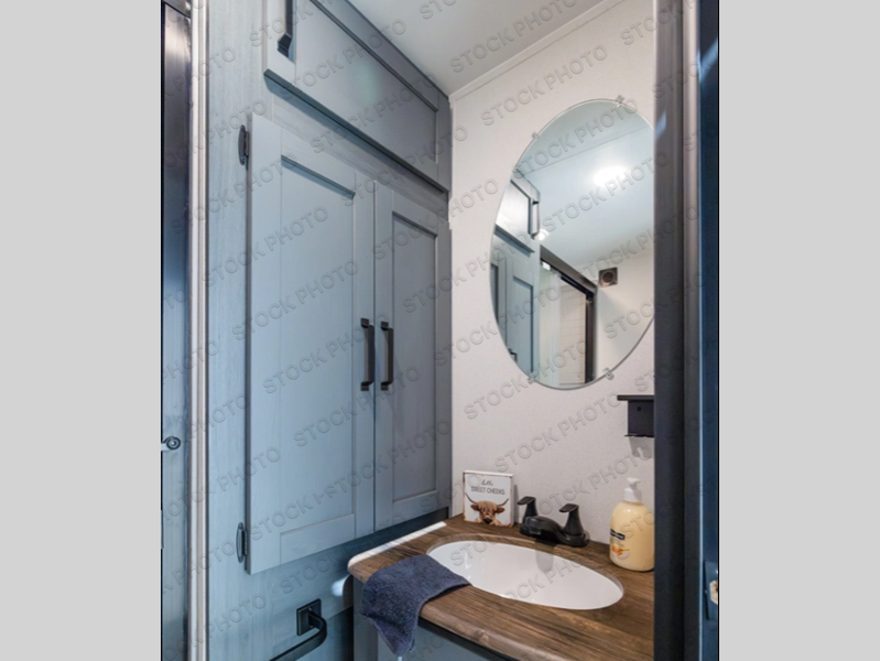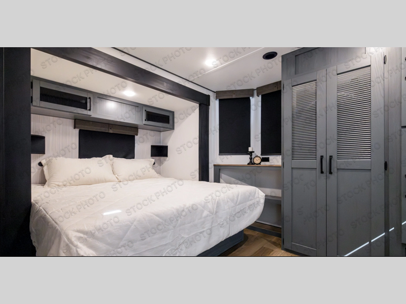 You won't believe the amount of comfort found in this destination trailer! There are two separate loft areas; one up front with a ladder, two bunk mats, storage space, and an optional fireplace, and one in the back with a ladder, two bunk mats, storage space, and a nightstand! On the main level, you'll find your own space in the front private bedroom, complete with a king bed slide, a countertop, dresser, and even washer and dryer prep. And a full bath is right next to the bedroom for easy nighttime use. Head to the full kitchen where you'll find all the appliances to cook meals, a kitchen island with an extension for more prep space, plus two pantries, one being hidden behind the TV! The comfort continues on in the rear master bedroom, complete with a queen bed slide, a desk with a chair, and a wardrobe for clothes. And the second full bath is found in the very back for added convenience!
