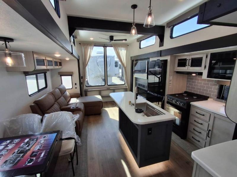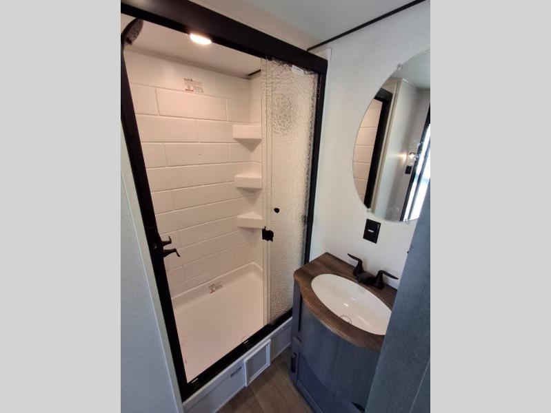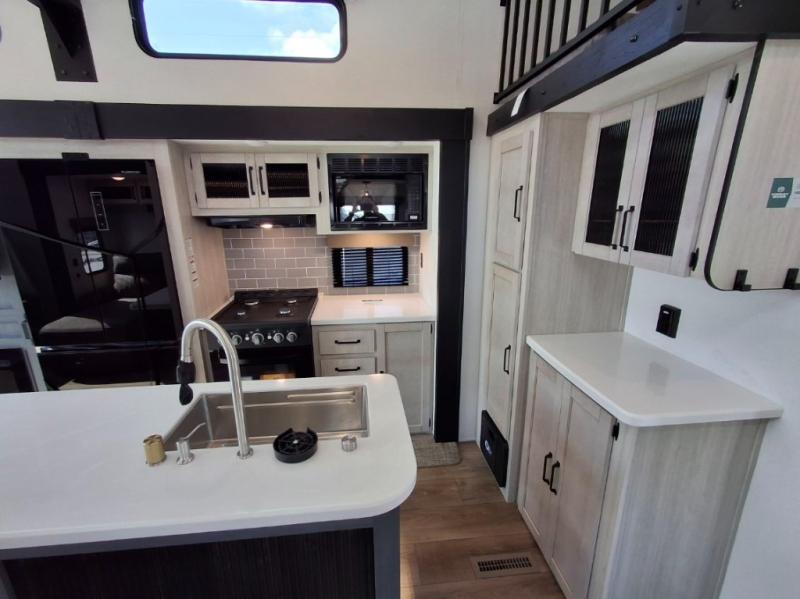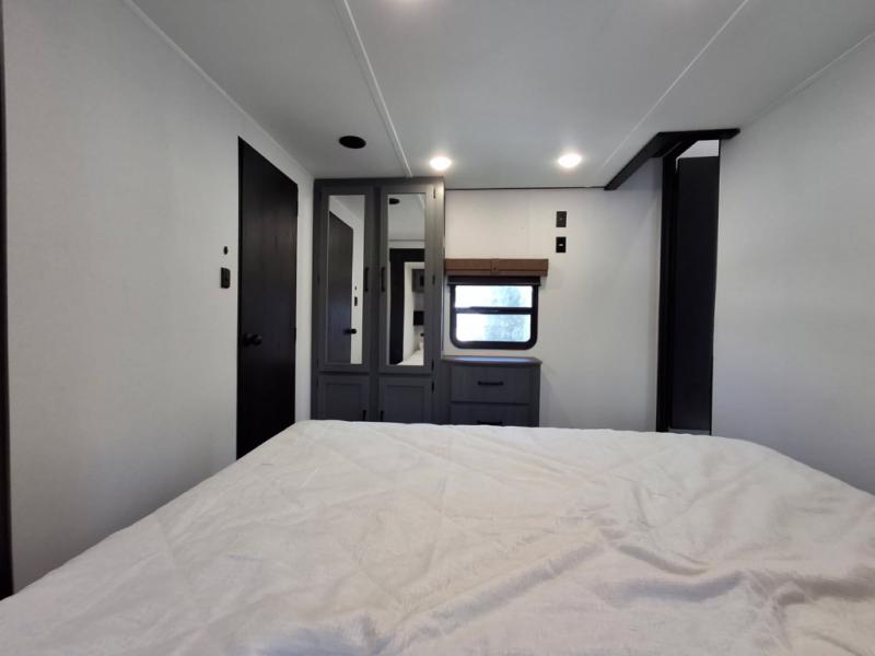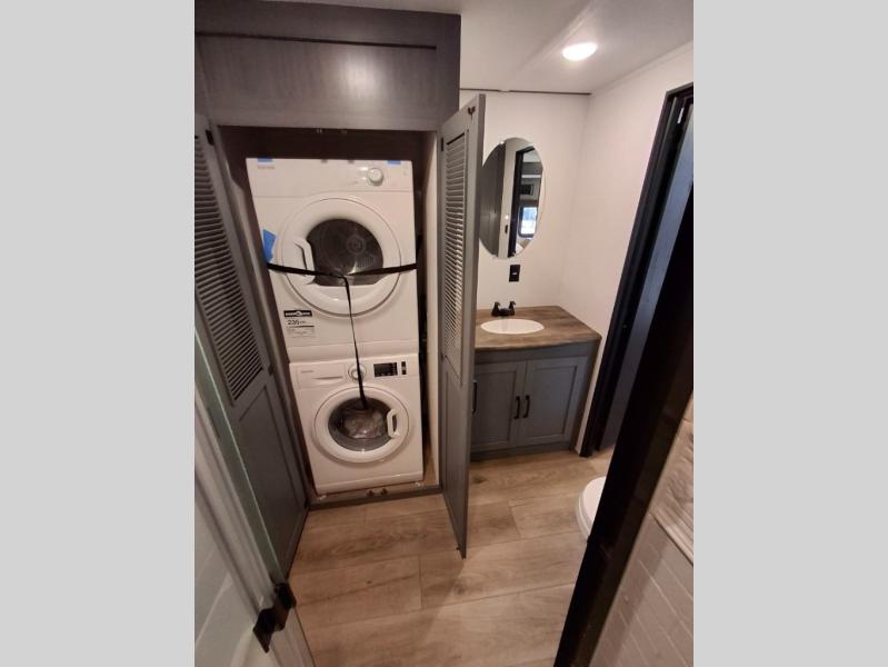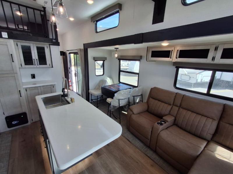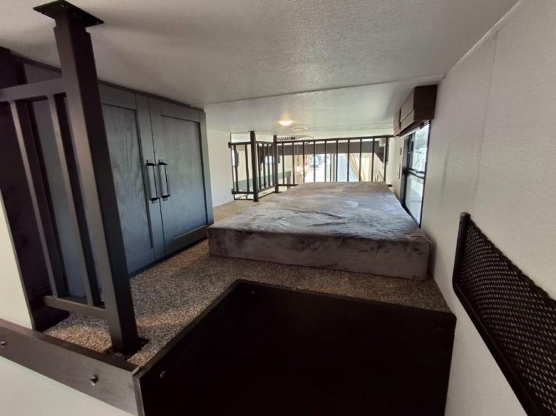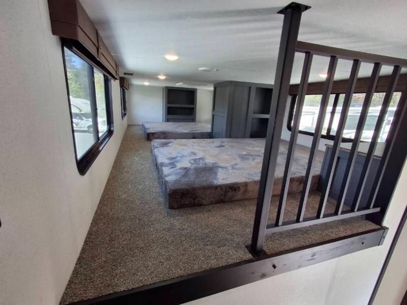 Your crew of eight will love extended stays in this spacious destination trailer. With dual opposing slides in the combined kitchen and living area, everyone can relax comfortably on the L-shaped sofa with recliners at the end or dine at the table and chairs. There is a spacious kitchen island with two chairs, a pantry for dry goods, and even a second, hidden pantry behind the TV for games, movies and more. A full bath is located right as you enter the unit for added convenience, and you'll find the second full bath up front in the master bedroom. You're sure to enjoy the king bed slide out here, along with a dresser and a wardrobe/closet to keep your things tidy. There is even washer and dryer prep in the front bath if you choose to add these appliances. Your guests or little ones will love the loft that includes two 54" x 74" bunk mats and storage on one side, plus a third bunk mat (32" x 74") and storage on the other!