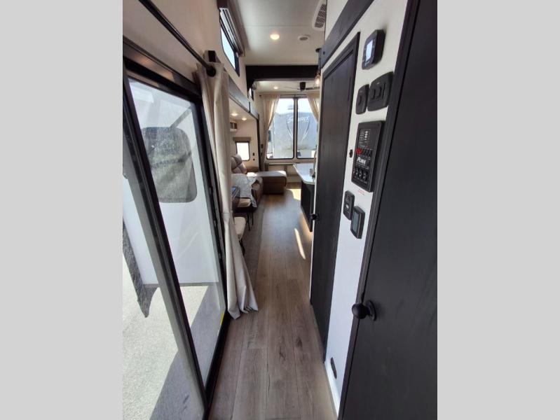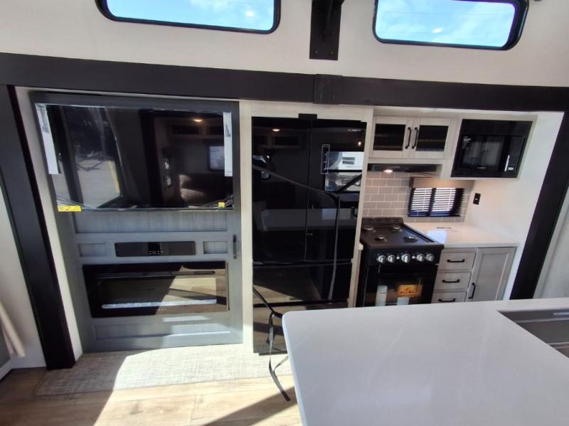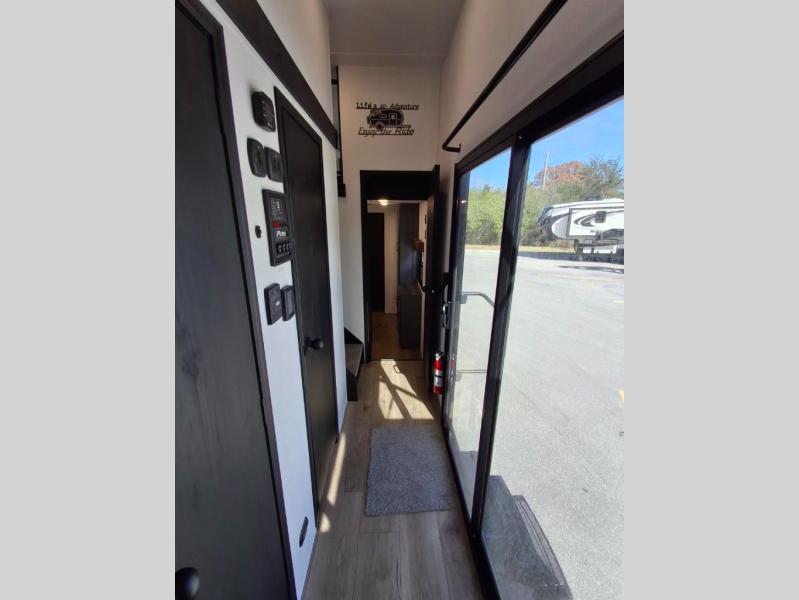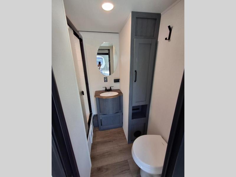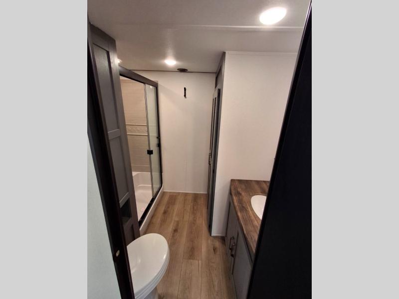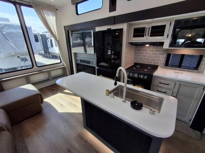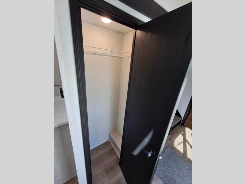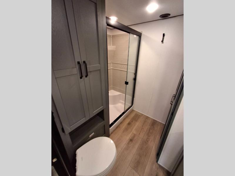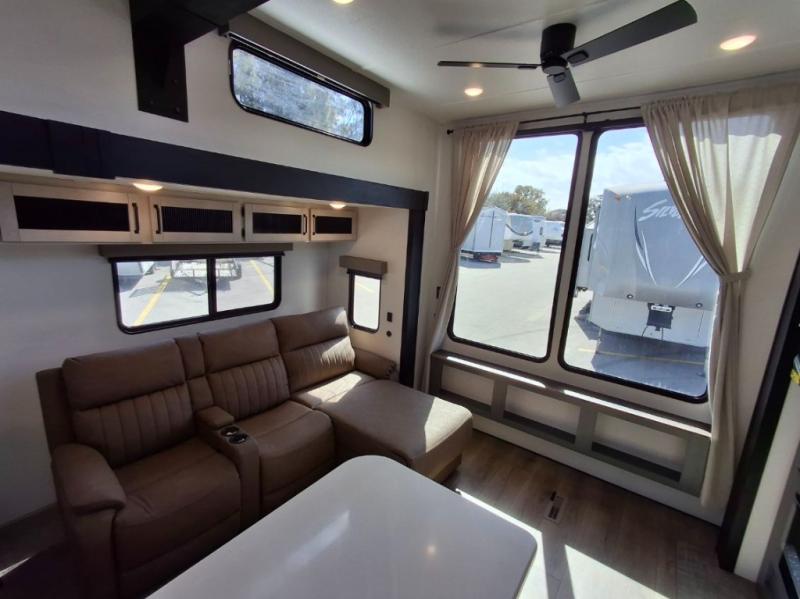 Your crew of eight will love extended stays in this spacious destination trailer. With dual opposing slides in the combined kitchen and living area, everyone can relax comfortably on the L-shaped sofa with recliners at the end or dine at the table and chairs. There is a spacious kitchen island with two chairs, a pantry for dry goods, and even a second, hidden pantry behind the TV for games, movies and more. A full bath is located right as you enter the unit for added convenience, and you'll find the second full bath up front in the master bedroom. You're sure to enjoy the king bed slide out here, along with a dresser and a wardrobe/closet to keep your things tidy. There is even washer and dryer prep in the front bath if you choose to add these appliances. Your guests or little ones will love the loft that includes two 54" x 74" bunk mats and storage on one side, plus a third bunk mat (32" x 74") and storage on the other!