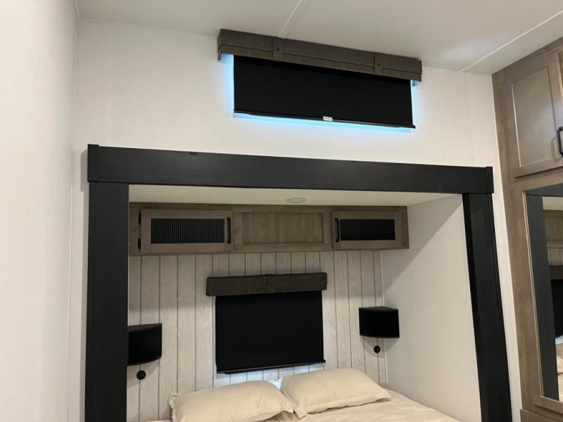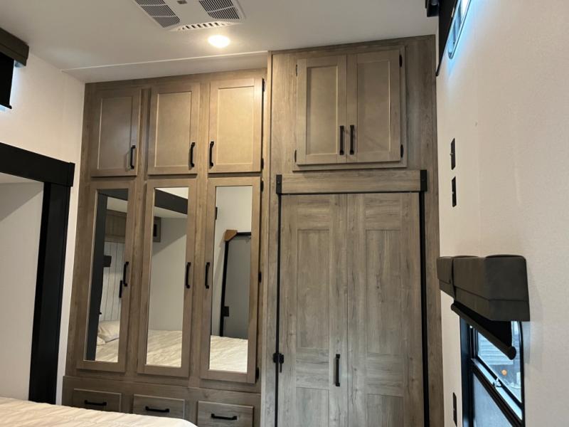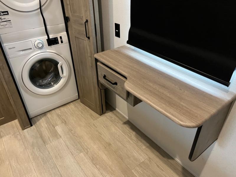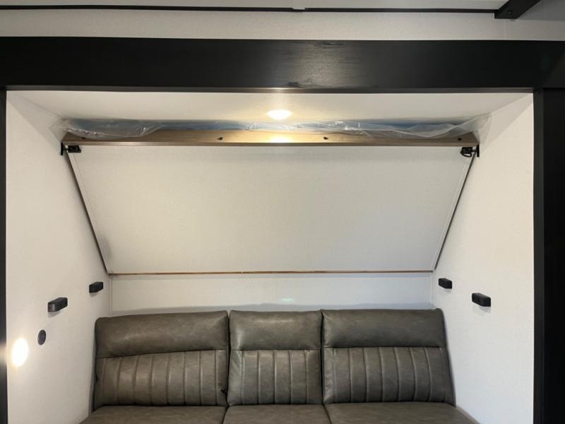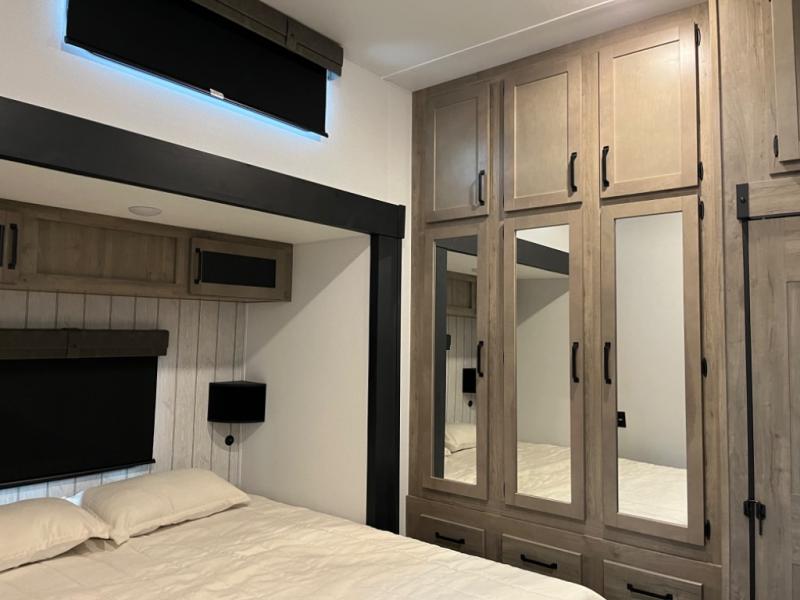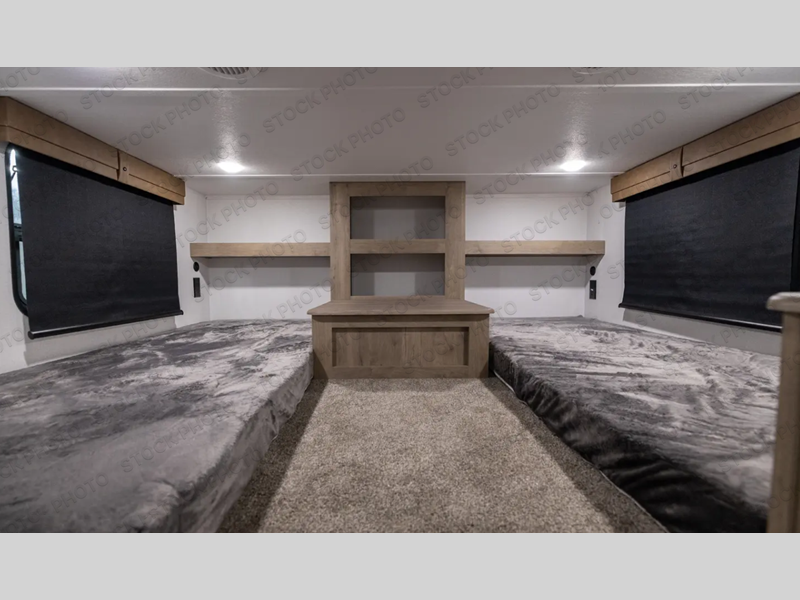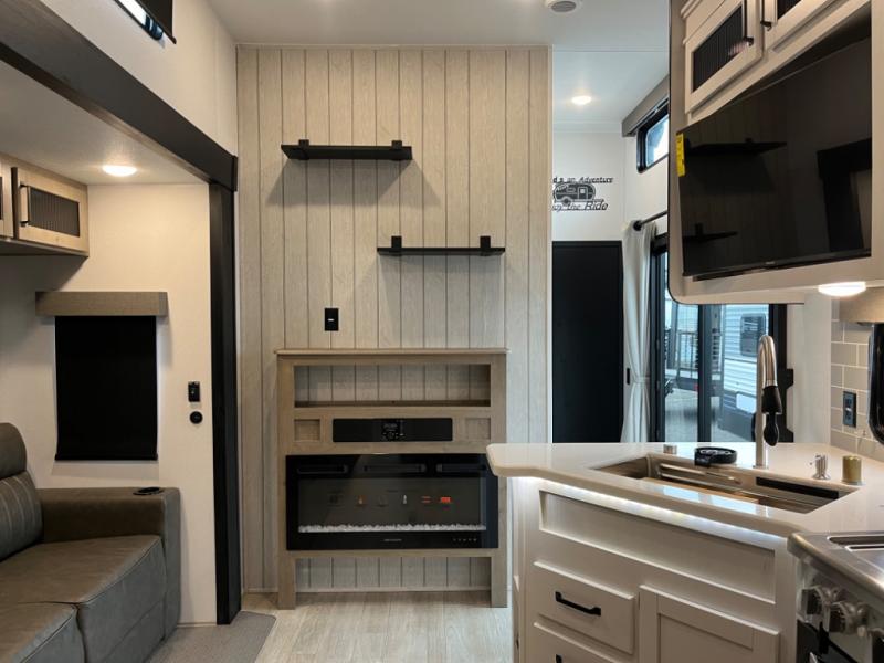 If you're planning to camp with a larger group or your family, this destination trailer will provide everything you're looking for! Your guests can take the rear bunkhouse suite that includes a slide out with a jiffy sofa and bunk bed, an entertainment center, and a full bath. You'll also find one of the dual entry doors here for added convenience. There are steps just outside the bunkhouse that lead to the loft with two bunk mats and storage space to keep this space tidy! The front private bedroom will be perfect for you with its king bed slide out, wardrobe/closet, and bedroom desk if you're needing to work from home. There is even a closet with the option to add washer and dryer prep. In the morning, everyone can meet in the combined middle living area and kitchen. A large slide out here houses the free-standing table and sofa, and the fireplace is close by to make it feel a little more like home!