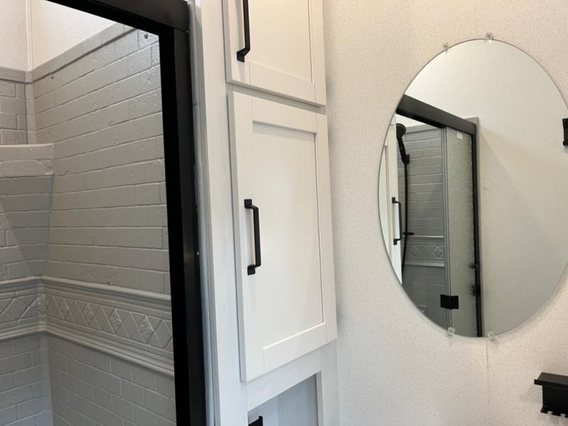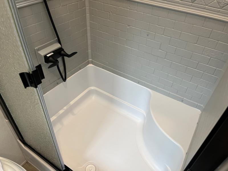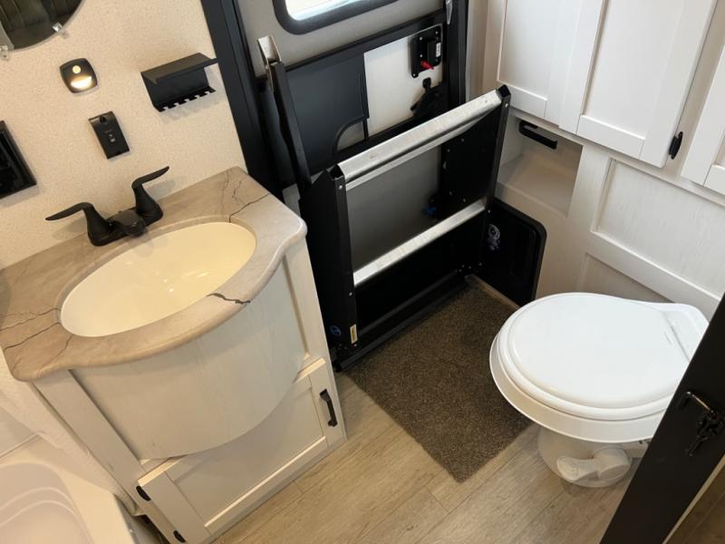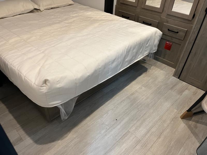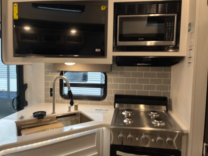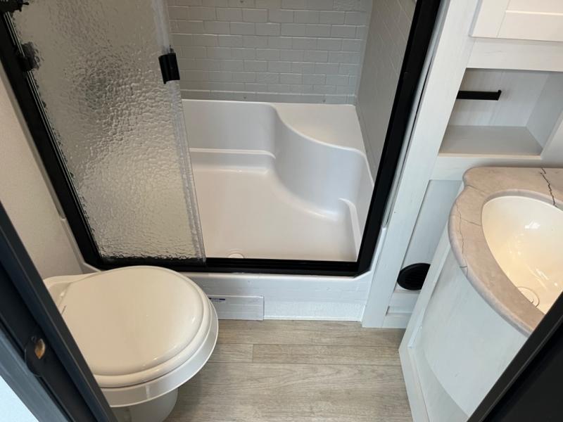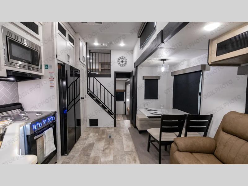 If you're planning to camp with a larger group or your family, this destination trailer will provide everything you're looking for! Your guests can take the rear bunkhouse suite that includes a slide out with a jiffy sofa and bunk bed, an entertainment center, and a full bath. You'll also find one of the dual entry doors here for added convenience. There are steps just outside the bunkhouse that lead to the loft with two bunk mats and storage space to keep this space tidy! The front private bedroom will be perfect for you with its king bed slide out, wardrobe/closet, and bedroom desk if you're needing to work from home. There is even a closet with the option to add washer and dryer prep. In the morning, everyone can meet in the combined middle living area and kitchen. A large slide out here houses the free-standing table and sofa, and the fireplace is close by to make it feel a little more like home!