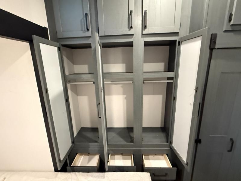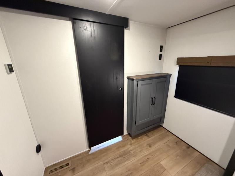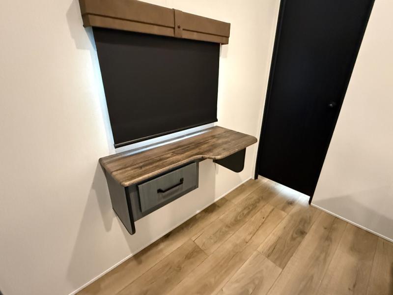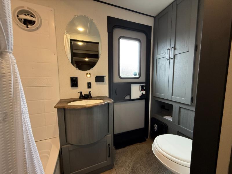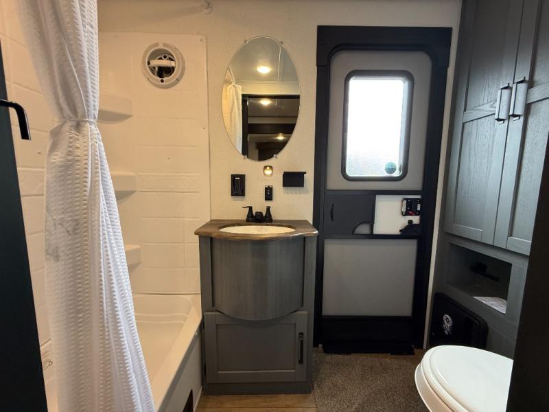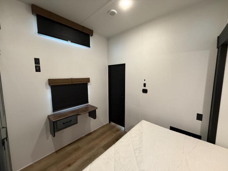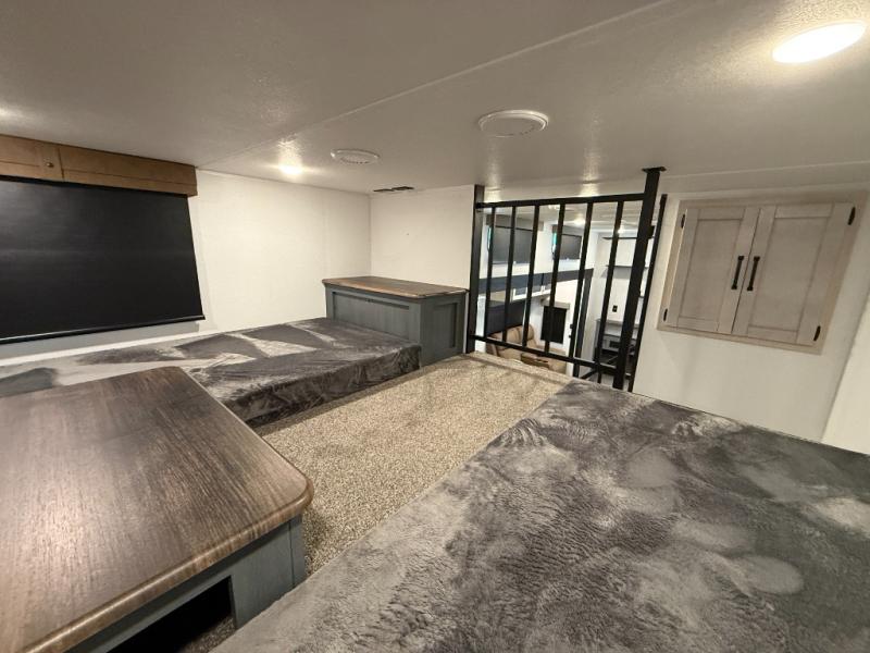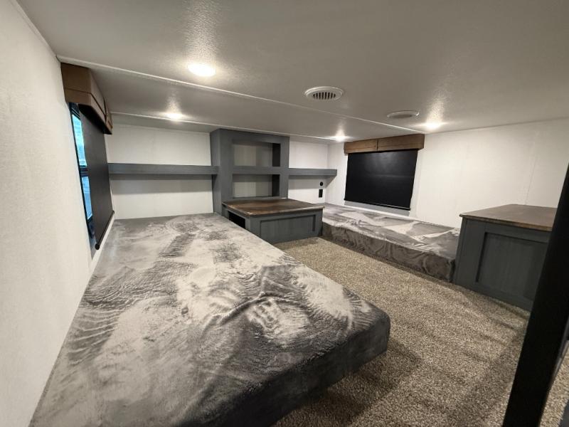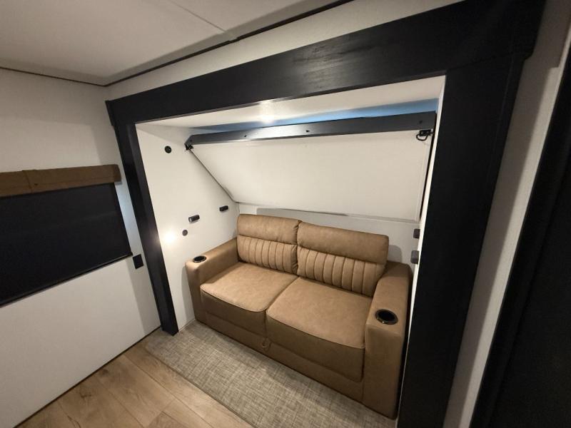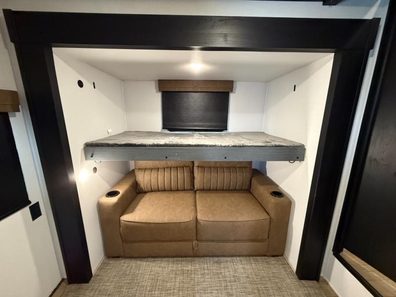 A rear bunkhouse suite: It features a slide-out with a sofa, bunk bed, entertainment center, full bath, and a dedicated entry door.