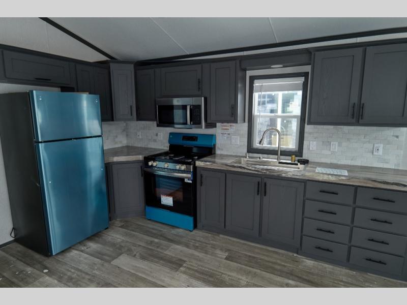 There's something for everyone in this park model! The front living area has a front entertainment center that will remind you of home with its stone surrounding the fireplace and you can relax on either the hide-a-bed sofa with a coffee table in front of it or in one of the two recliners with a table in between them. The fully equipped kitchen offers all of the conveniences from home, as well as a raised bar area with three bar stools for others to socialize with the chef as they prepare their best meals. One of the bedrooms has a set of bunk beds and a wardrobe, and the rear private bedroom has a queen Serta mattress across from a Chest-O-Drawers with his and hers lighted wardrobes on either side of it. Everyone will stay squeaky clean with the one-piece fiberglass tub/shower in the full bathroom too!