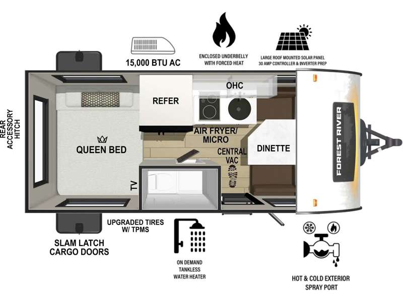 The RP-171 is an ultra-lite travel trailer offering serious features in compact form. With a well-appointed wet bath, efficient kitchen space, and a rear bedroom for restful nights, it delivers comfortable camping without excess bulk. Ample storage, modern finishes, and the thoughtful r•pod design make it ideal for couples or small families seeking lightweight, no-compromise adventures.