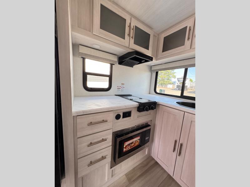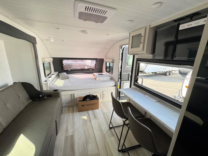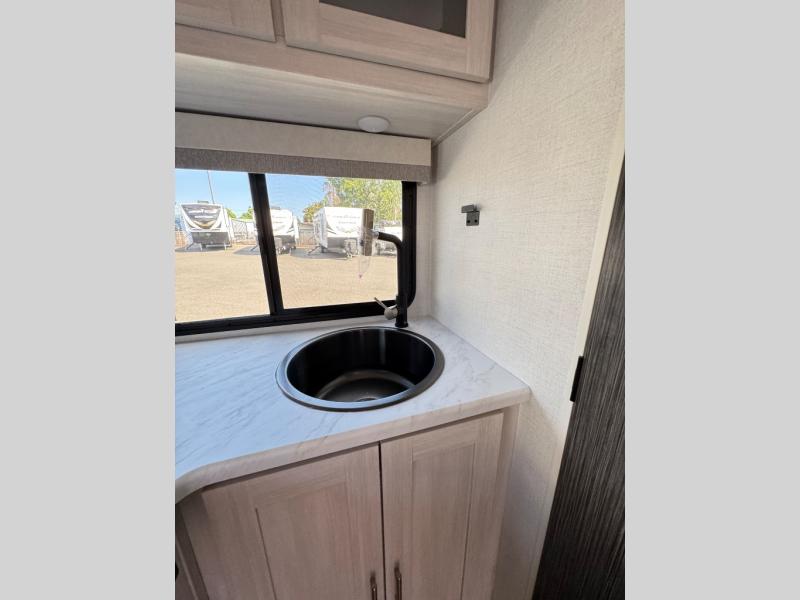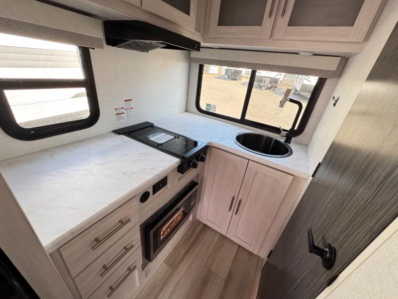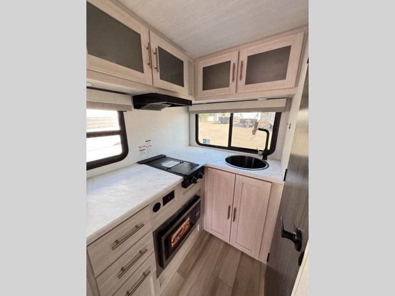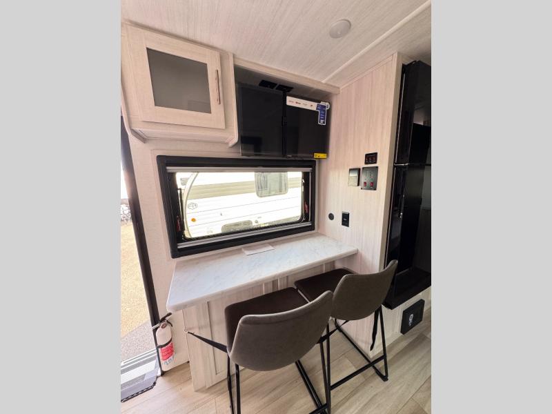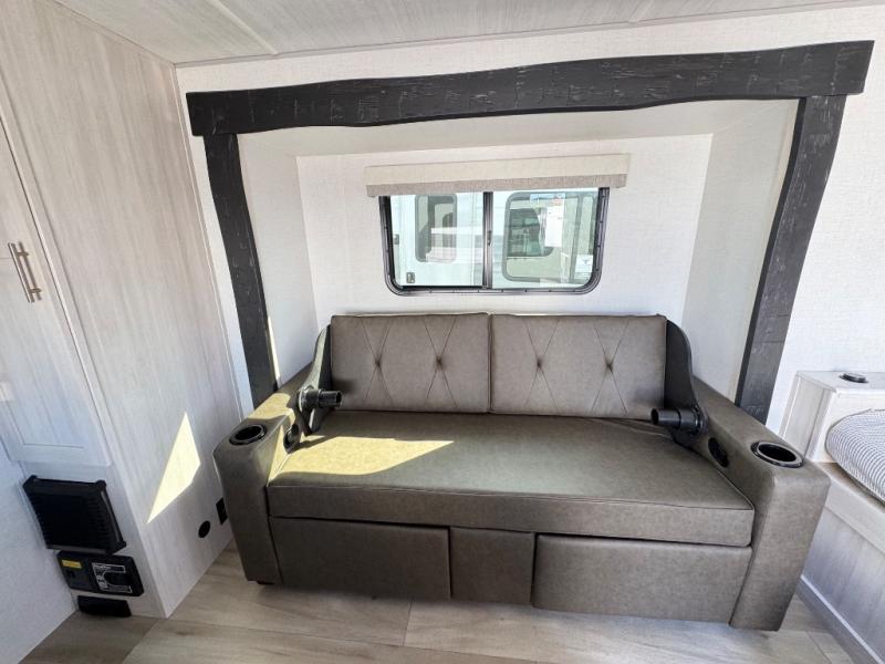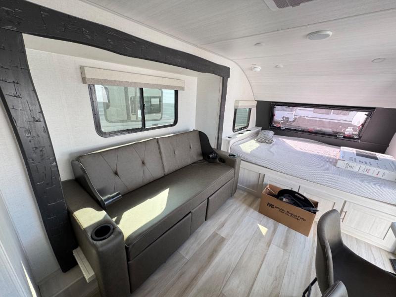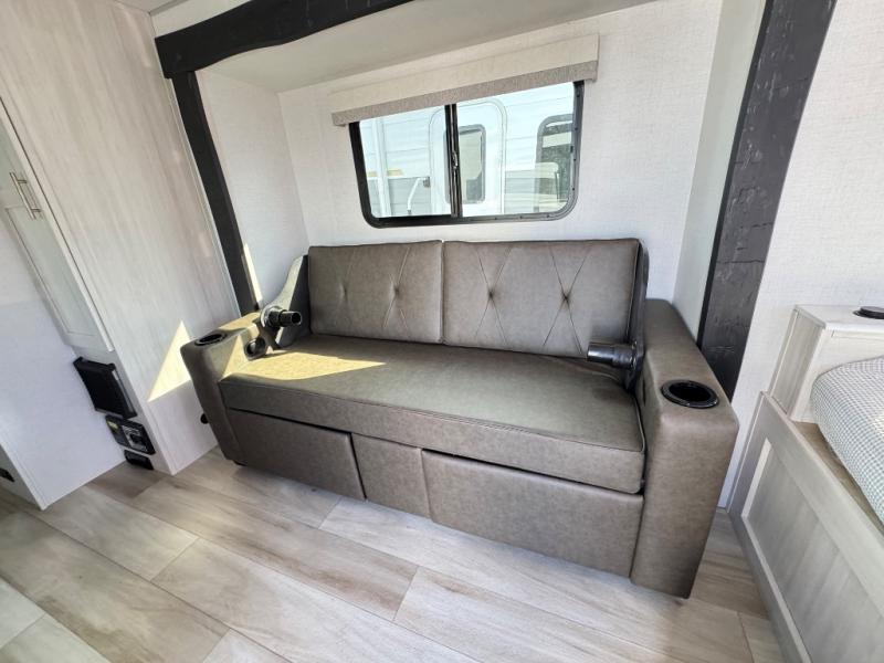 This travel trailer makes time at the campground easier than ever. Once you arrive at your site, you can put out the 14' awning, unload the exterior storage, then stretch your legs on a trail. The rear corner kitchen will let you make lunch when you return, and there is a bar top with two chairs where you can dine at. The jackknife sofa with leg rests is within a slide out so you can enjoy more floor space, and the front queen bed is sure to make you feel right at home.