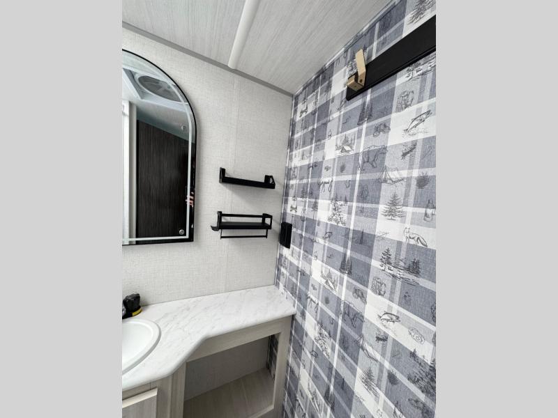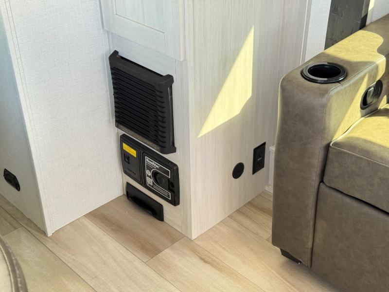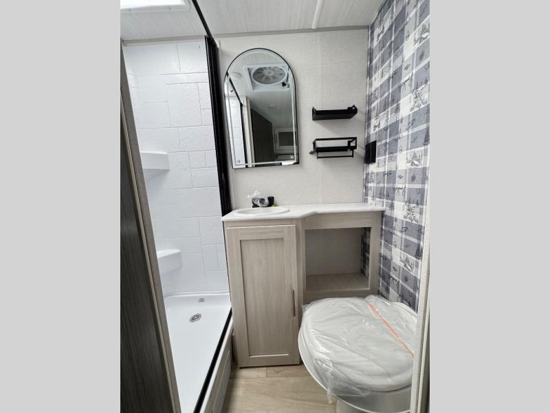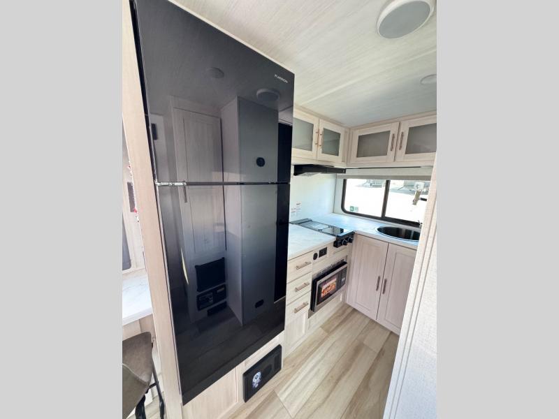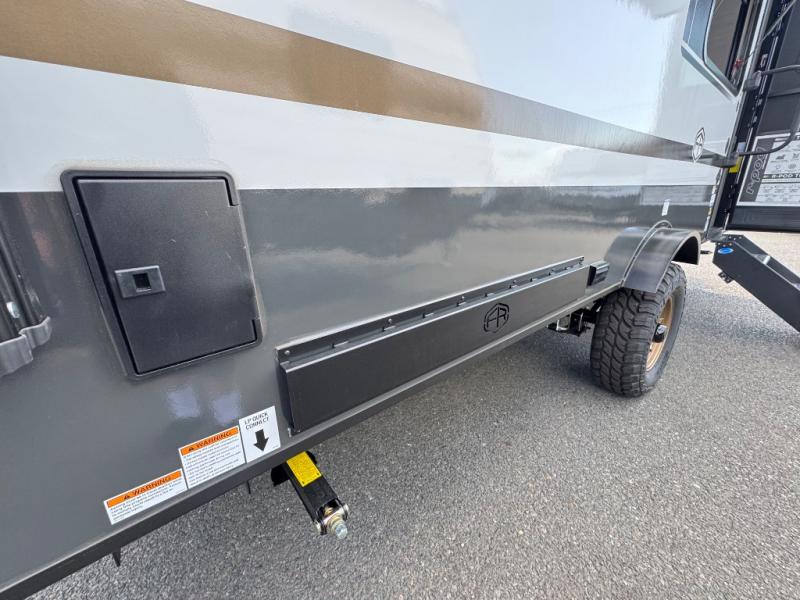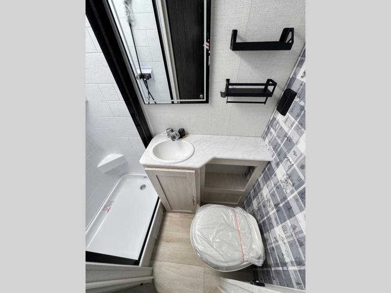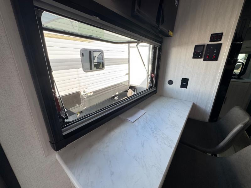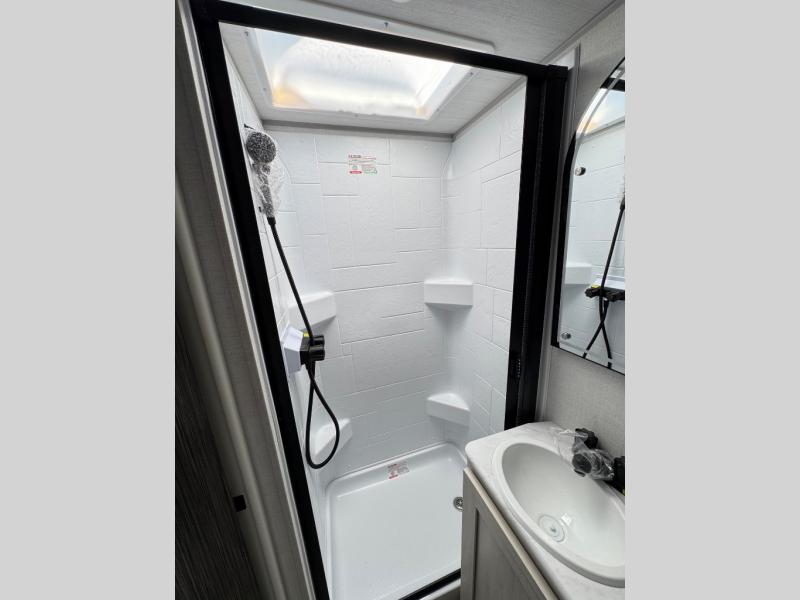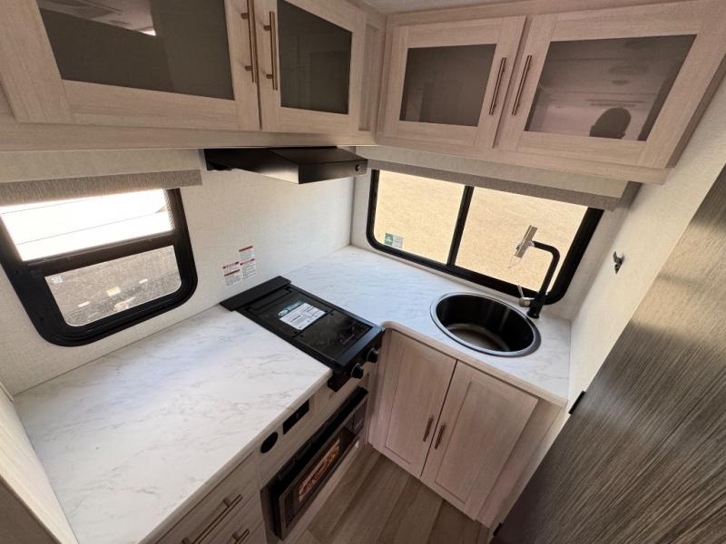 This travel trailer makes time at the campground easier than ever. Once you arrive at your site, you can put out the 14' awning, unload the exterior storage, then stretch your legs on a trail. The rear corner kitchen will let you make lunch when you return, and there is a bar top with two chairs where you can dine at. The jackknife sofa with leg rests is within a slide out so you can enjoy more floor space, and the front queen bed is sure to make you feel right at home.