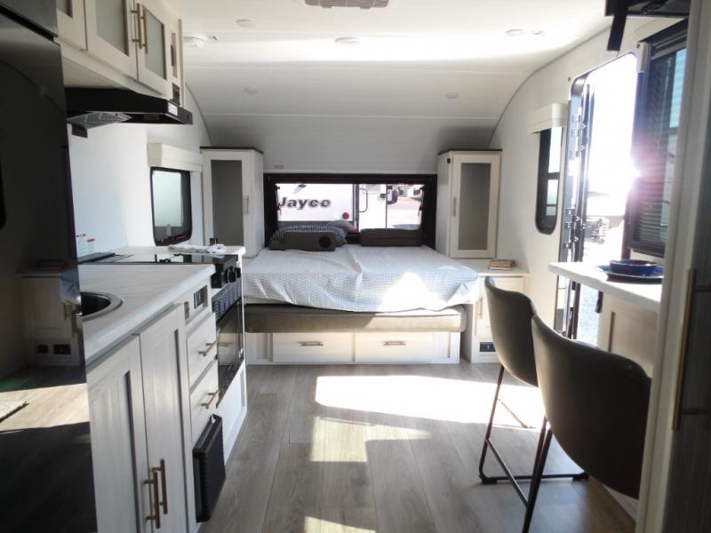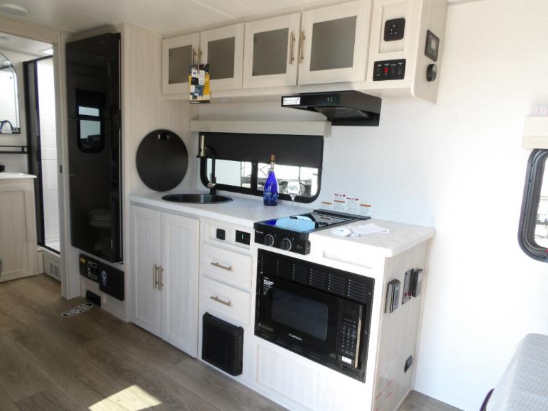 This versatile travel trailer is perfect for two adventure-seeking campers! You will love having a queen-size Murphy bed up front since you can fold it away during the day and relax on the sofa. There are also dual wardrobes to keep your clothes out of the way plus dual end end tables to set your coffee or book on. A full kitchen includes a convection microwave, 12V black glass refrigerator, and a counter with two chairs where you can dine each day. You will also love the flip-up window above the table, along with a 12V TV to keep you entertained, plus a pantry to keep food stocked. Head to the full rear bath that includes a large linen closet, a shower, and a night light for added convenience. The exterior is just as accommodating with its large roof mounted solar panel, rear accessory hitch, slam latch cargo doors, and more!