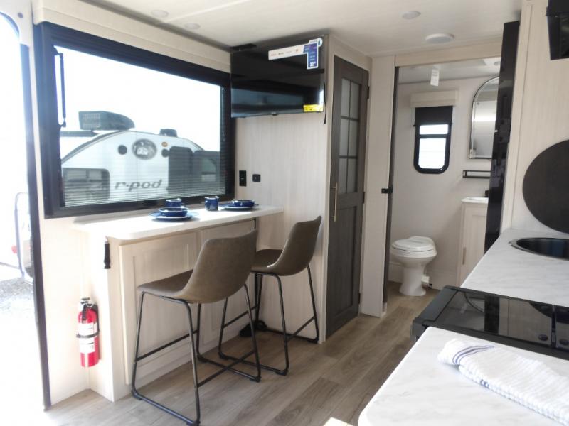 With any R-Pod travel trailer by Forest River, you will enjoy affordable luxury at the lowest tow weight in its class! There is a sealed underbelly with forced heat, a curved dual-pane acrylic front window with a bug screen and night shade, plus a large roof mounted solar panel for off-grid capabilities. The 15K A/C unit will keep you comfortable during the summer camping months, and the tankless water heater will provide endless hot showers after hiking, biking, swimming and more! Each model also includes a black glass friction hinge entrance door, roof ladder prep, exterior motion lighting, plus a hot and cold exterior spray port to wash off sand from the beach. Inside, you'll enjoy seamless Surf-X kitchen countertops, blackout roller shades, and a central vacuum system for hassle-free cleaning!