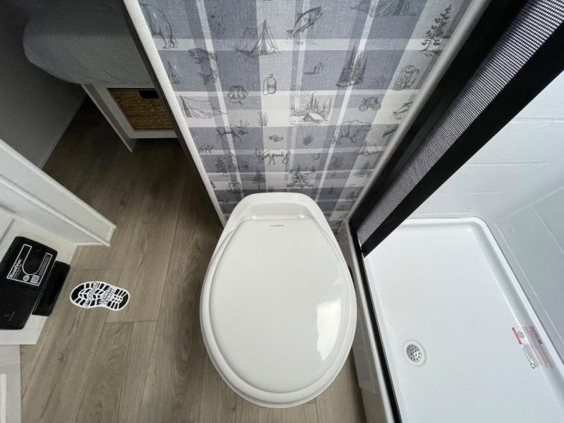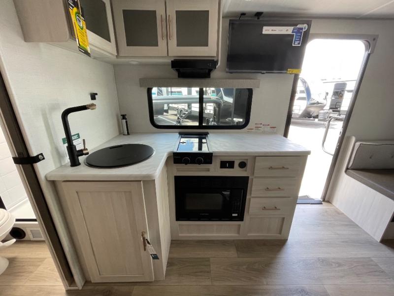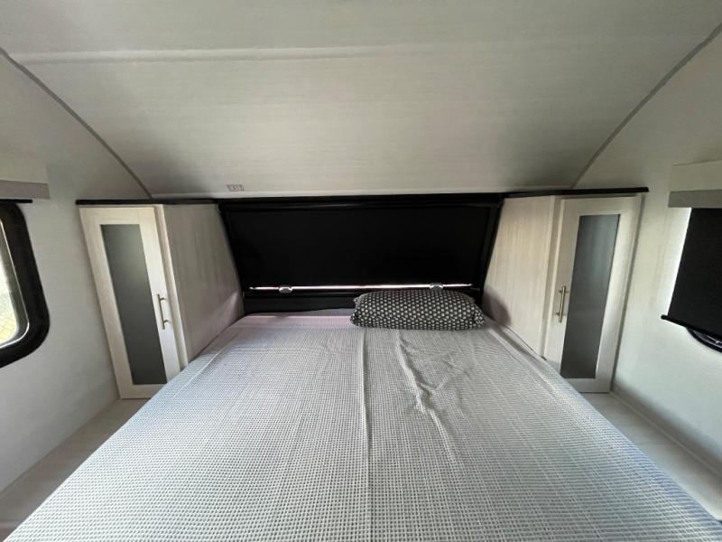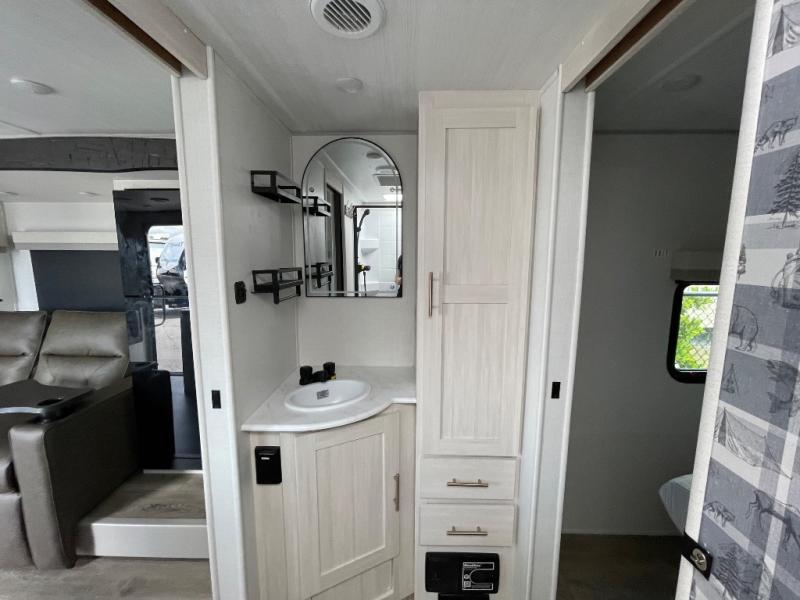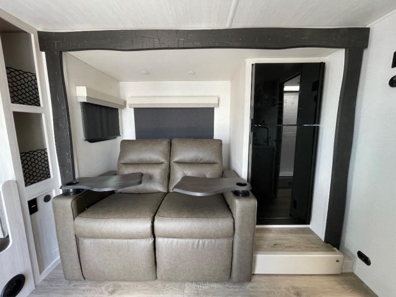 Whether you spend your days at the lake or in the woods, you'll be met with comfort in this spacious travel trailer. There is a rear dinette where you can enjoy your meals together, a 56" theater seat across from a 12V TV, and a slide out for added space. The walk-through bath includes a night light for easy nighttime use, and the front master bedroom includes a queen bed just like at home. There are also dual wardrobes and end tables plus an entertainment center if you want to add a TV. Outside, you'll find a rear accessory hitch, upgraded tires with TPMS, a 14' awning, and a slam latch cargo doors to keep your gear secure.