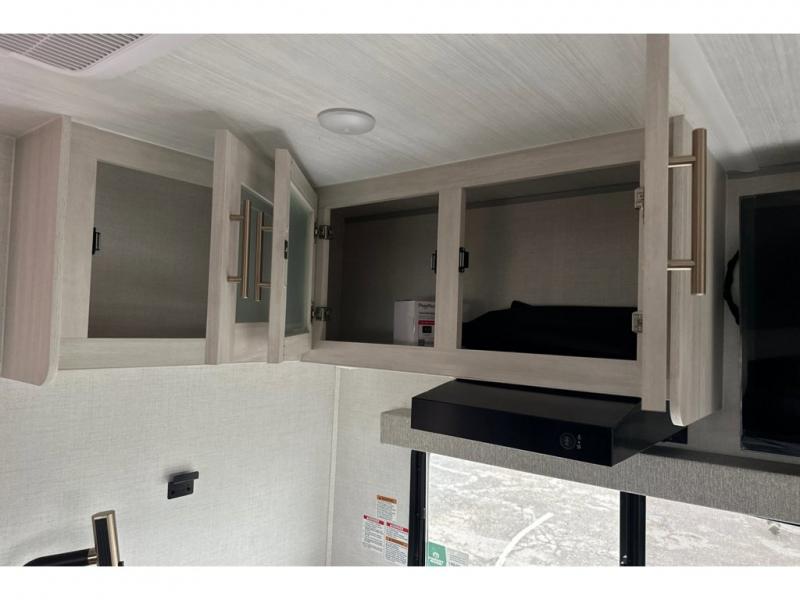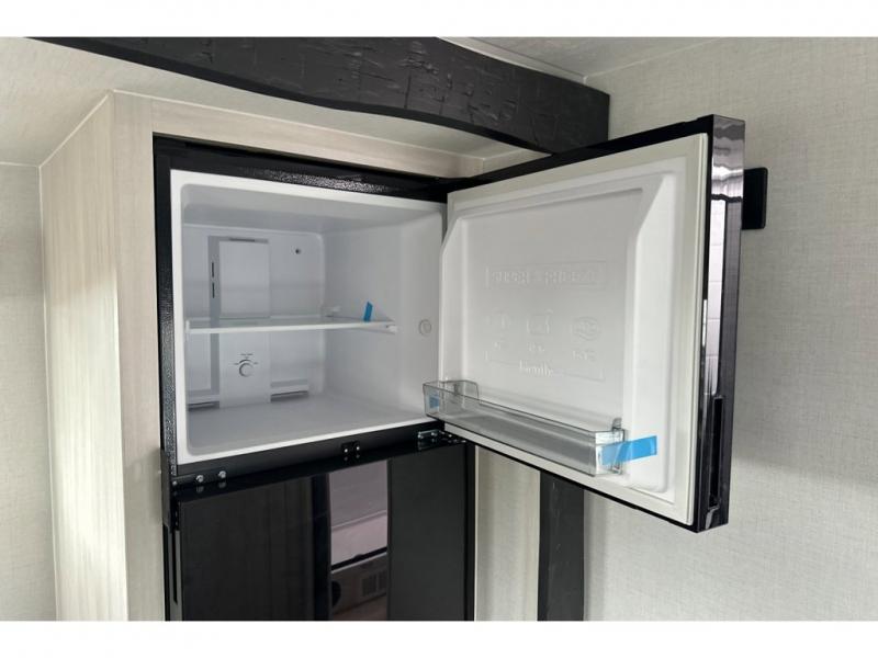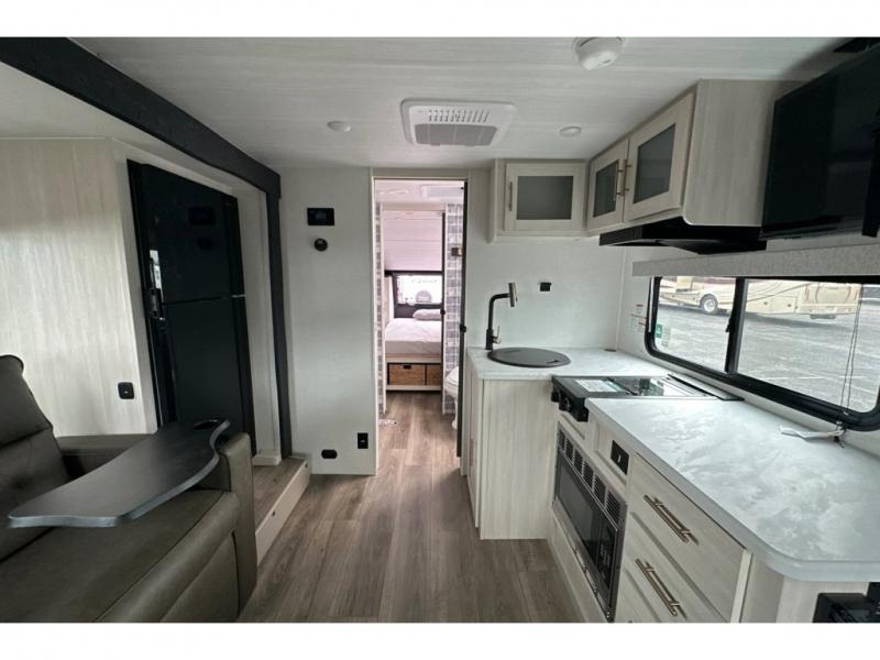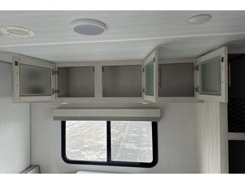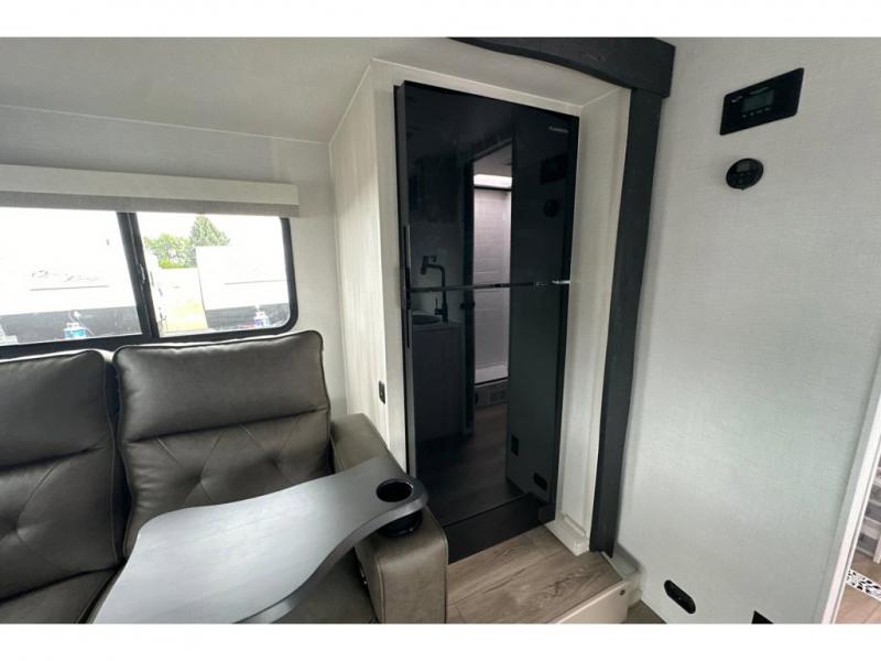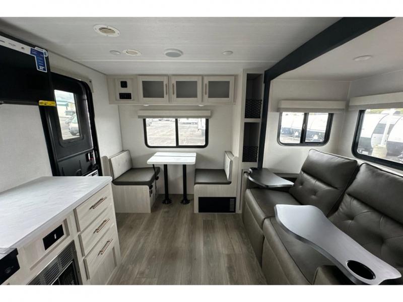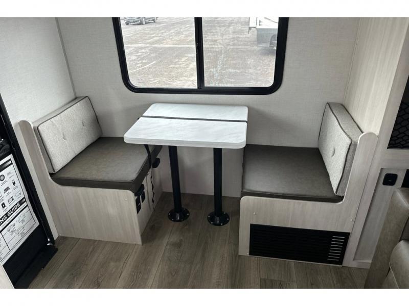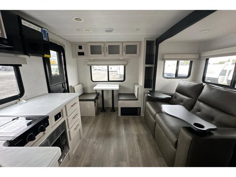 Whether you spend your days at the lake or in the woods, you'll be met with comfort in this spacious travel trailer. There is a rear dinette where you can enjoy your meals together, a 56" theater seat across from a 12V TV, and a slide out for added space. The walk-thru bath includes a night light for easy nighttime use, and the front master bedroom includes a queen bed just like at home. There are also dual wardrobes and end tables plus an entertainment center if you want to add a TV. Outside, you'll find a rear accessory hitch, a 14' awning, and a slam latch cargo doors to keep your gear secure. This model also includes the Hood River Edition that comes with Mud Legend all terrain tires with TPMS, a MaxxAir vent cover, and 12V tank heaters!