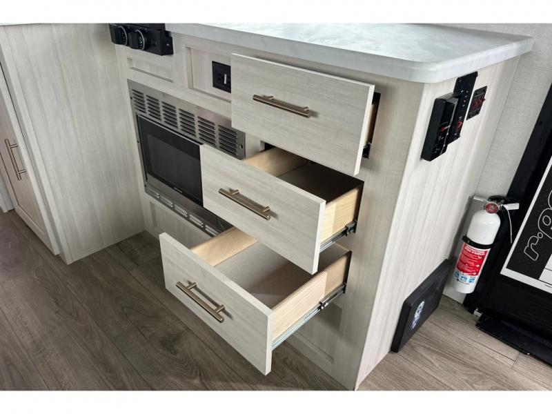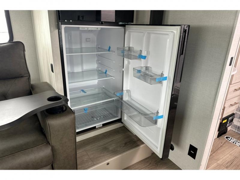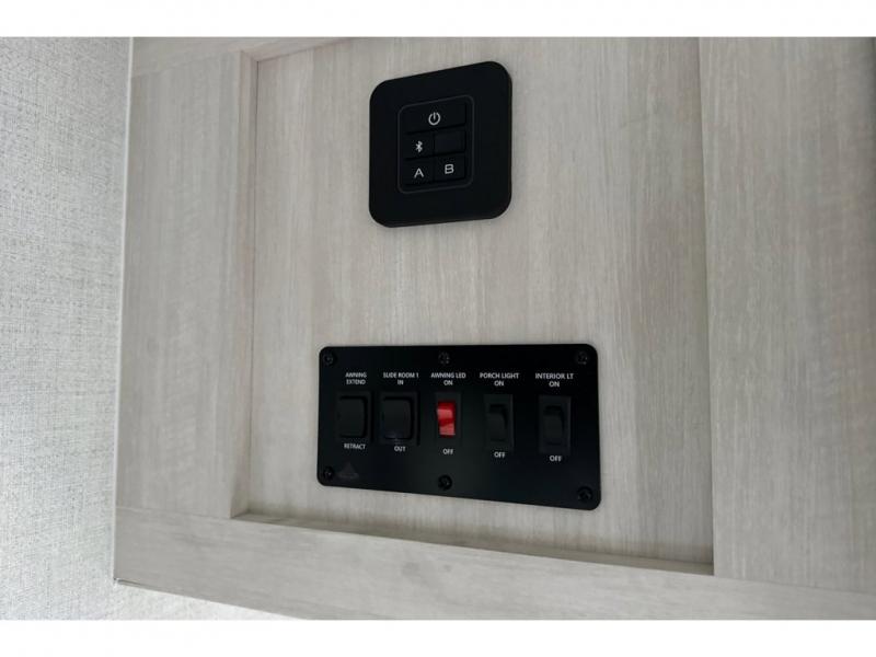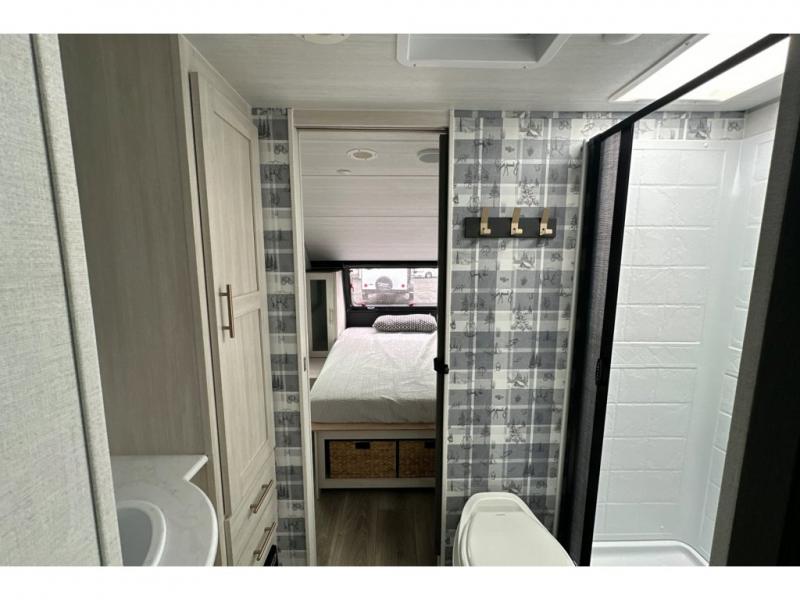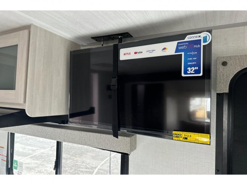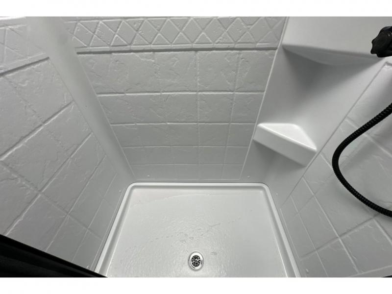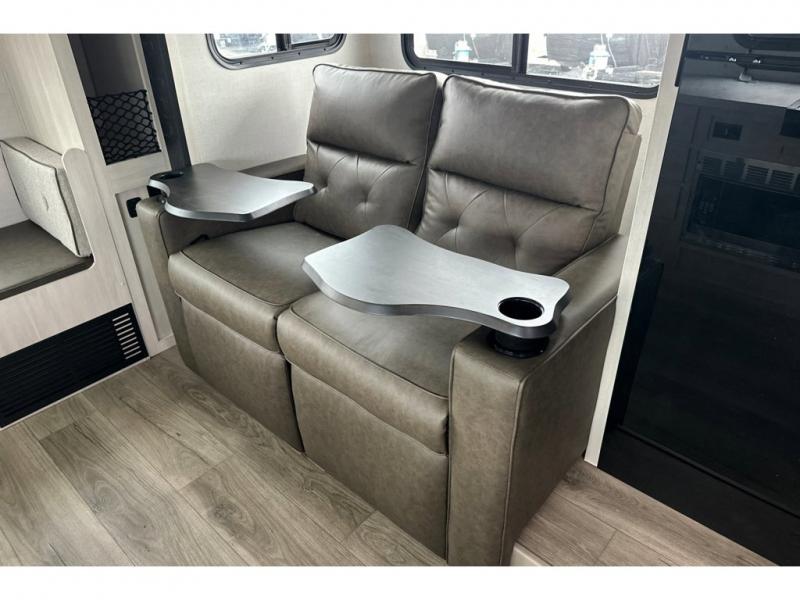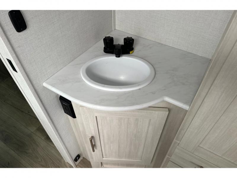 Whether you spend your days at the lake or in the woods, you'll be met with comfort in this spacious travel trailer. There is a rear dinette where you can enjoy your meals together, a 56" theater seat across from a 12V TV, and a slide out for added space. The walk-thru bath includes a night light for easy nighttime use, and the front master bedroom includes a queen bed just like at home. There are also dual wardrobes and end tables plus an entertainment center if you want to add a TV. Outside, you'll find a rear accessory hitch, a 14' awning, and a slam latch cargo doors to keep your gear secure. This model also includes the Hood River Edition that comes with Mud Legend all terrain tires with TPMS, a MaxxAir vent cover, and 12V tank heaters!
