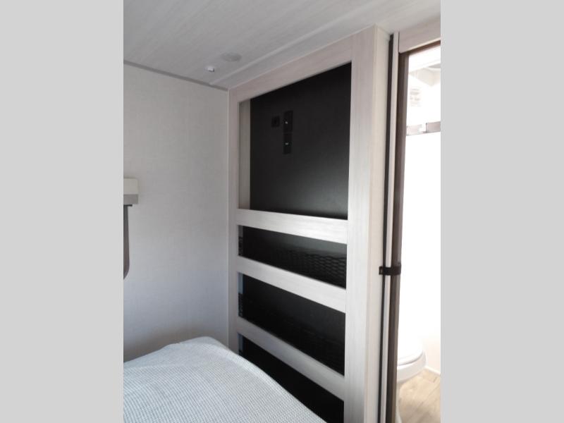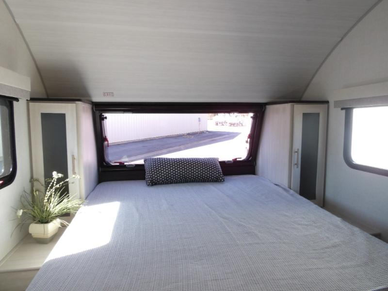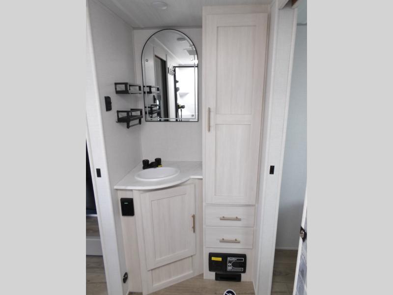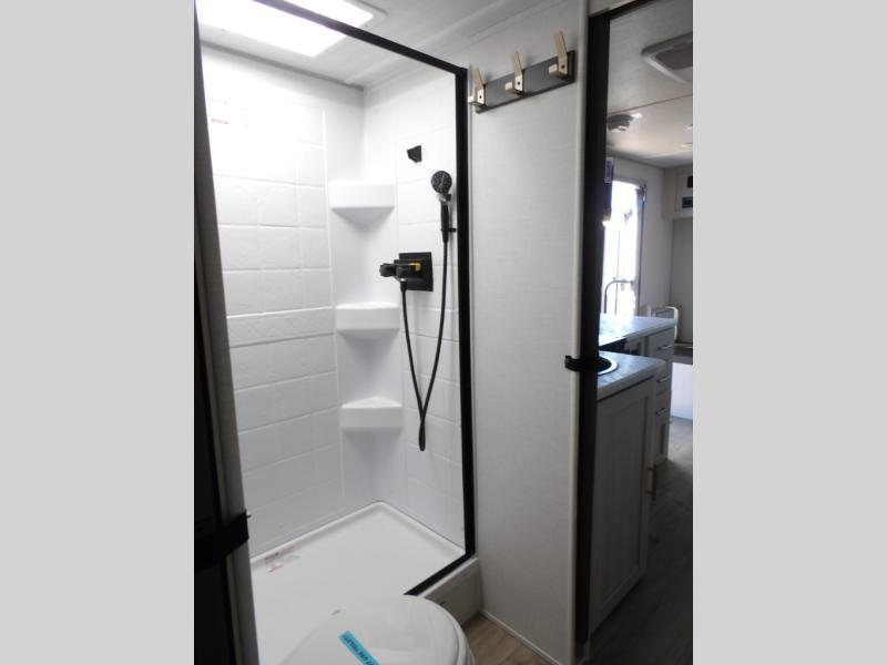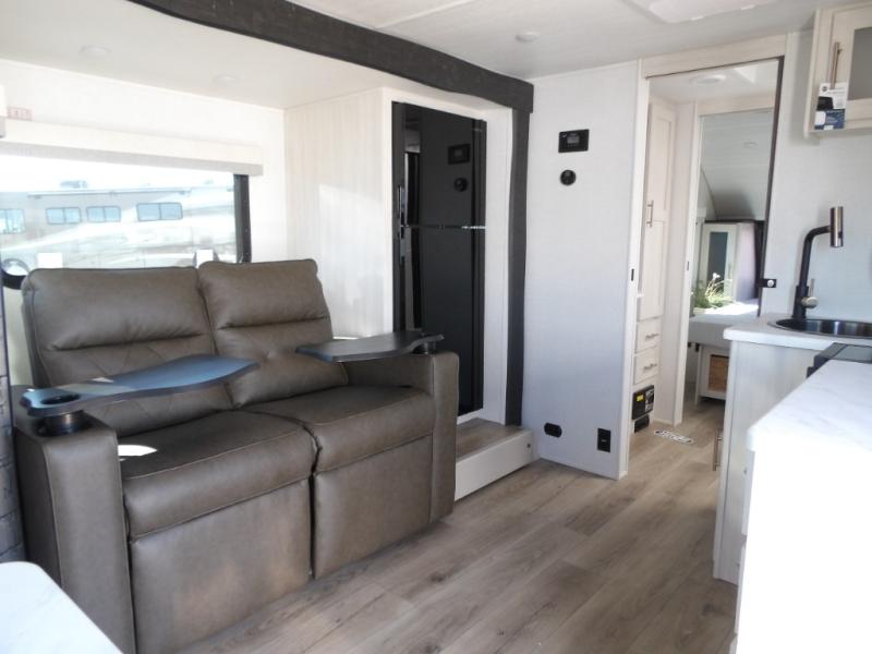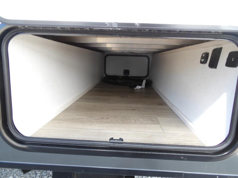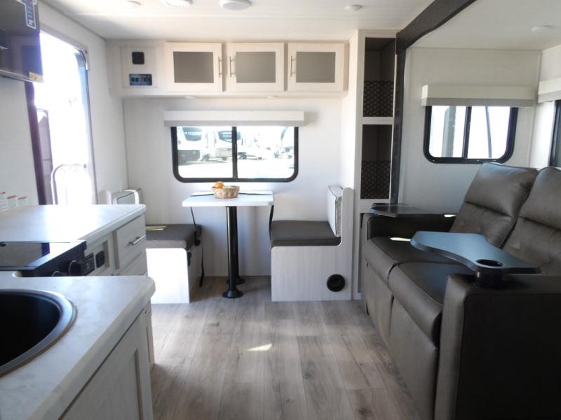 Whether you spend your days at the lake or in the woods, you'll be met with comfort in this spacious travel trailer. There is a rear dinette where you can enjoy your meals together, a 56" theater seat across from a 12V TV, and a slide out for added space. The walk-through bath includes a night light for easy nighttime use, and the front master bedroom includes a queen bed just like at home. There are also dual wardrobes and end tables plus an entertainment center if you want to add a TV. Outside, you'll find a rear accessory hitch, upgraded tires with TPMS, a 14' awning, and a slam latch cargo doors to keep your gear secure.