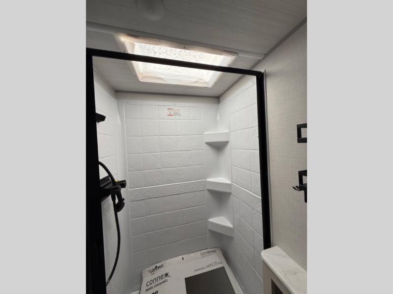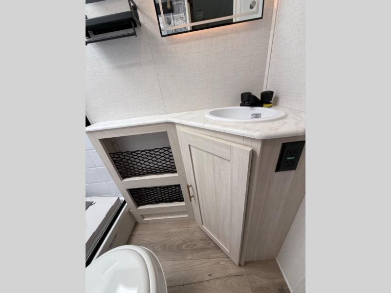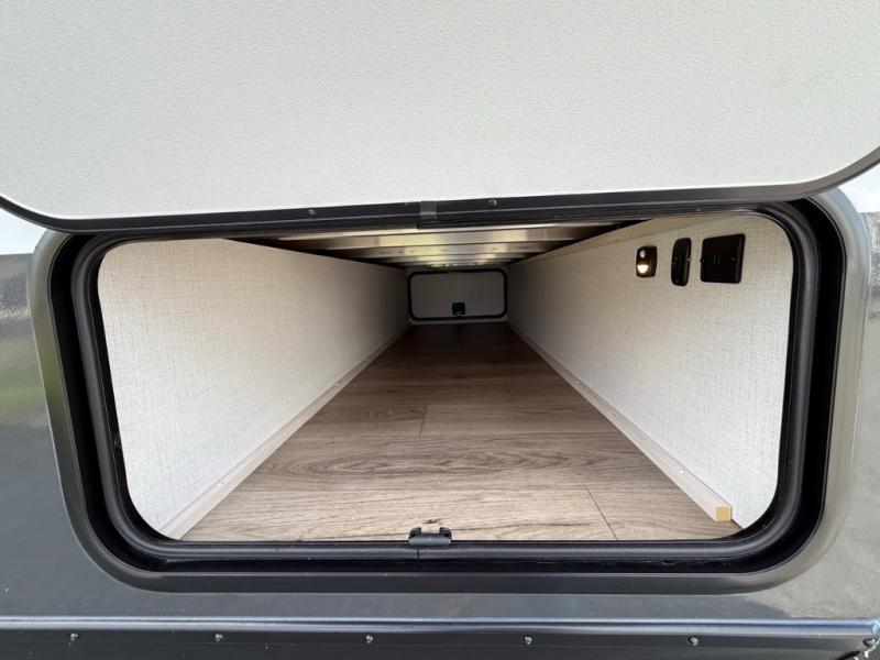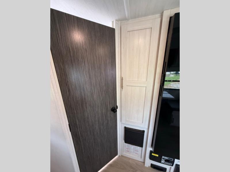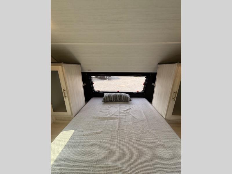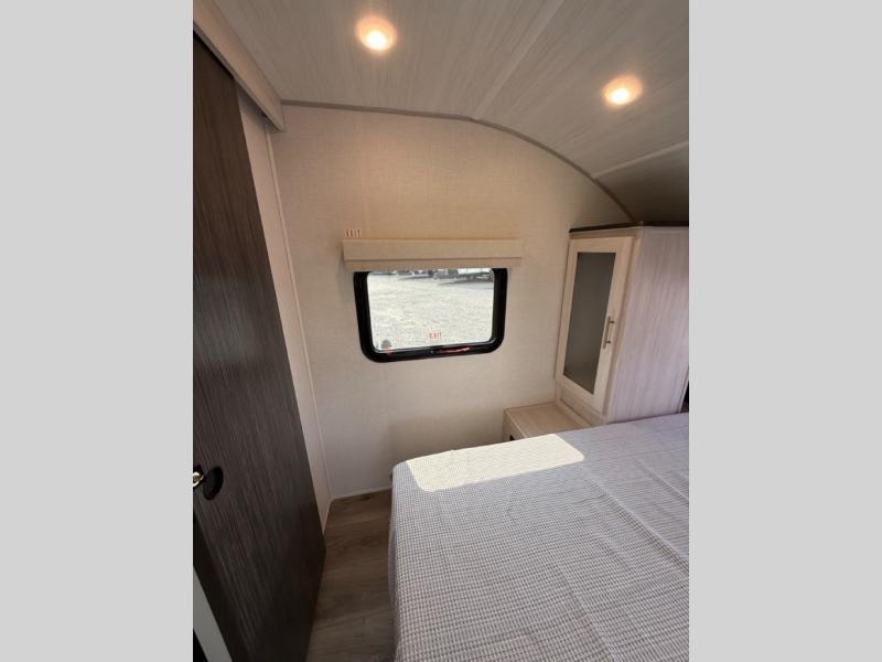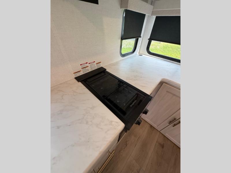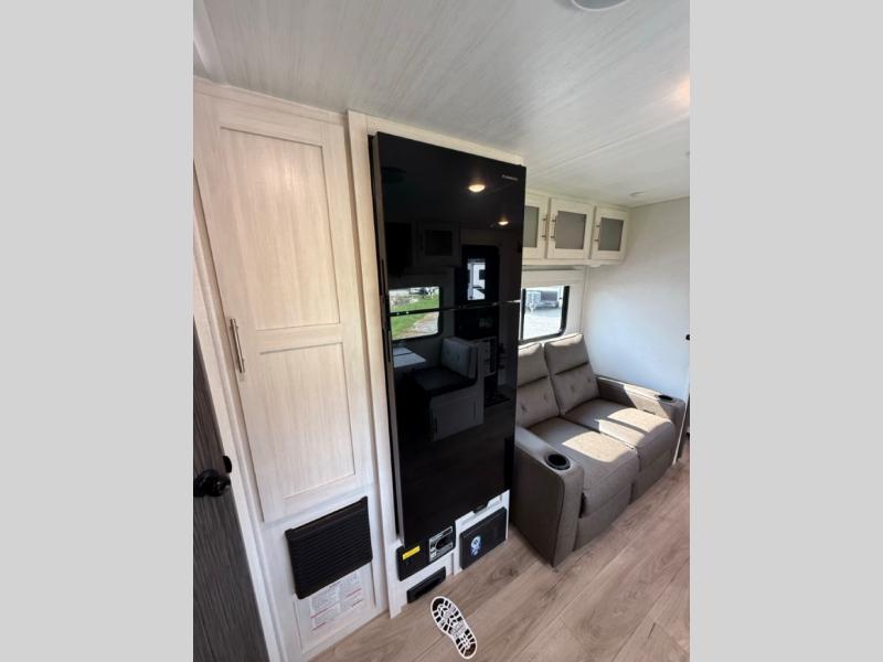 A private bedroom with a walk-around queen bed, a full bath, and sleeping space for guests are a few of the features that you are sure to want in your next RV! You can rest comfortably each night, plus all your clothing can be stored in the dual wardrobes to keep everything tidy. The chef of your group can make meals on the two burner cooktop or in the convection microwave, and there is a 12V black glass refrigerator for perishables. You can relax on the theater seat each evening, and if you're needing additional sleeping space, just choose the optional tri-fold sofa!