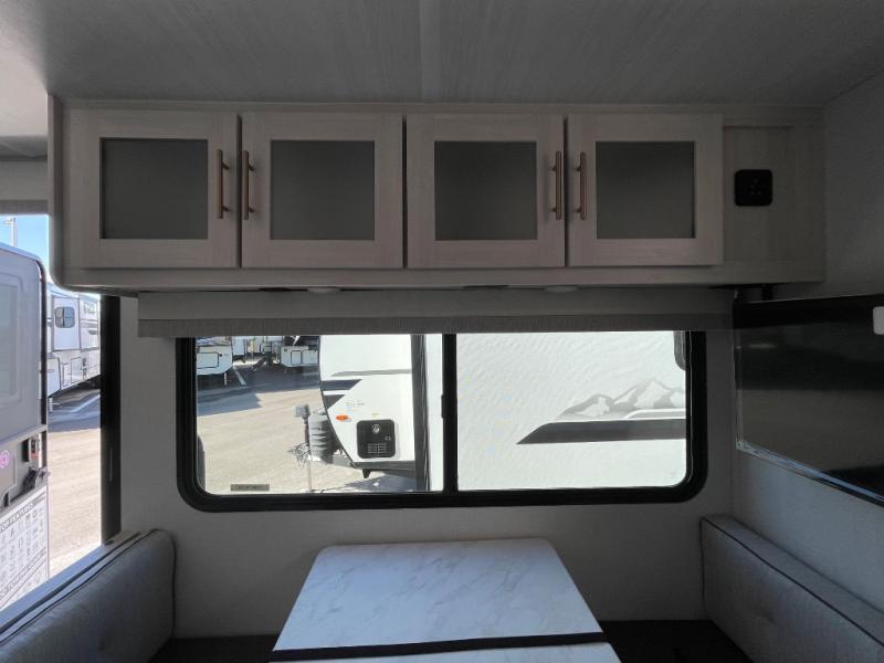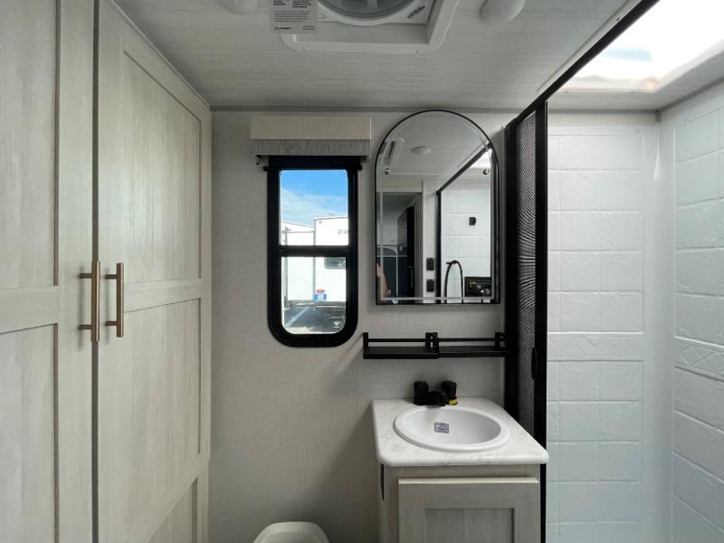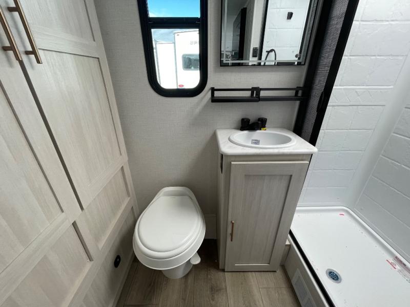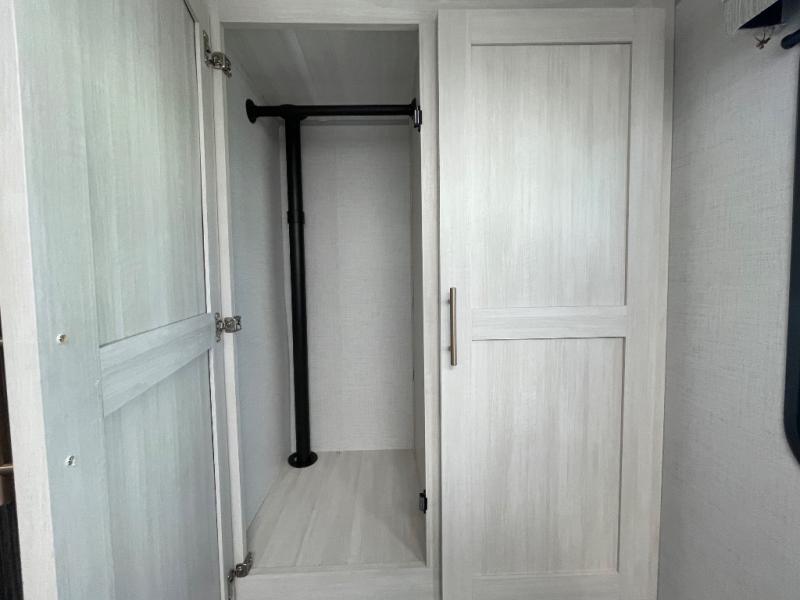 A private bedroom with a walk-around queen bed, a full bath, and sleeping space for guests are a few of the features that you are sure to want in your next RV! You can rest comfortably each night, plus all your clothing can be stored in the dual wardrobes to keep everything tidy. The chef of your group can make meals on the two burner cooktop or in the convection microwave, and there is a 12V black glass refrigerator for perishables. You can relax on the theater seat each evening, and if you're needing additional sleeping space, just choose the optional tri-fold sofa!