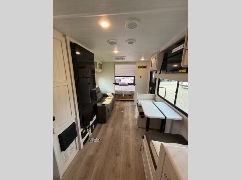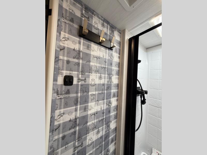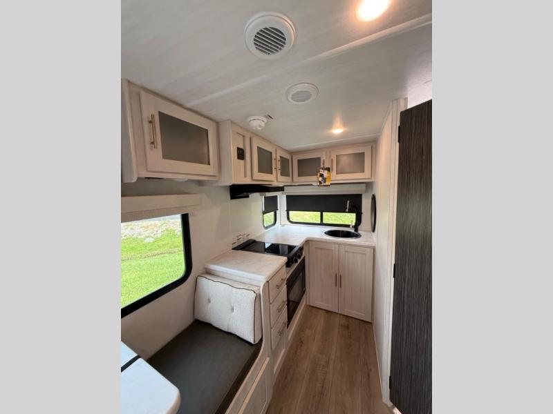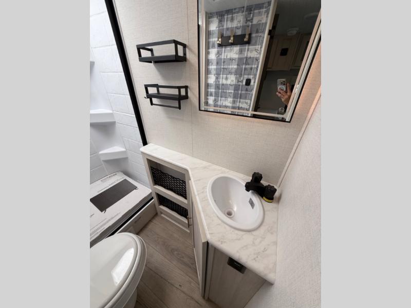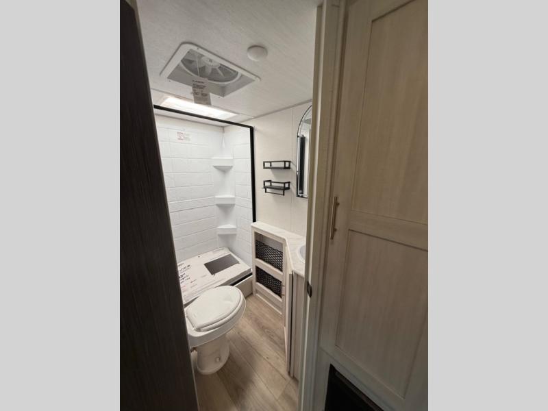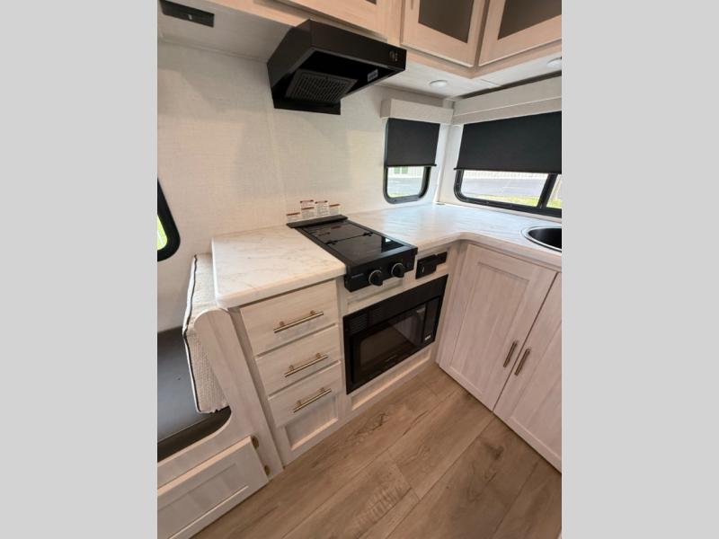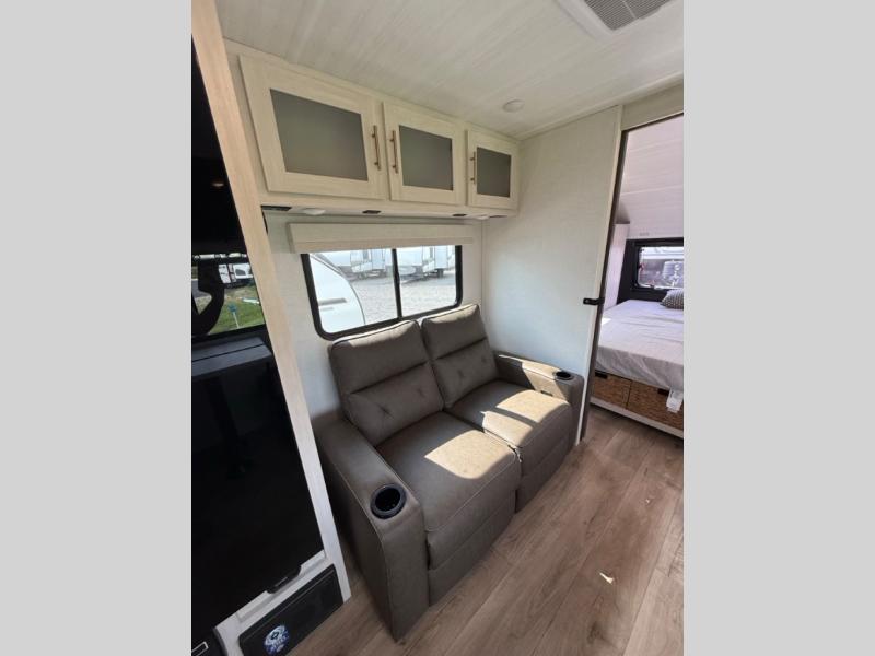 A private bedroom with a walk-around queen bed, a full bath, and sleeping space for guests are a few of the features that you are sure to want in your next RV! You can rest comfortably each night, plus all your clothing can be stored in the dual wardrobes to keep everything tidy. The chef of your group can make meals on the two burner cooktop or in the convection microwave, and there is a 12V black glass refrigerator for perishables. You can relax on the theater seat each evening, and if you're needing additional sleeping space, just choose the optional tri-fold sofa!