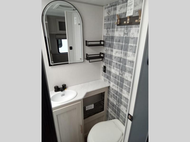 Weekends at the lake just got sweeter in this cozy travel trailer. You can prepare your meals each day on the two burner cooktop, or in the convection microwave. There is a sofa to relax on with a good book, plus a booth dinette up front that features a Murphy bed you can fold down at night. This model also includes a 12V black glass refrigerator to keep your perishables fresh, and a pantry to store snacks and dry goods.