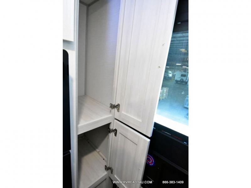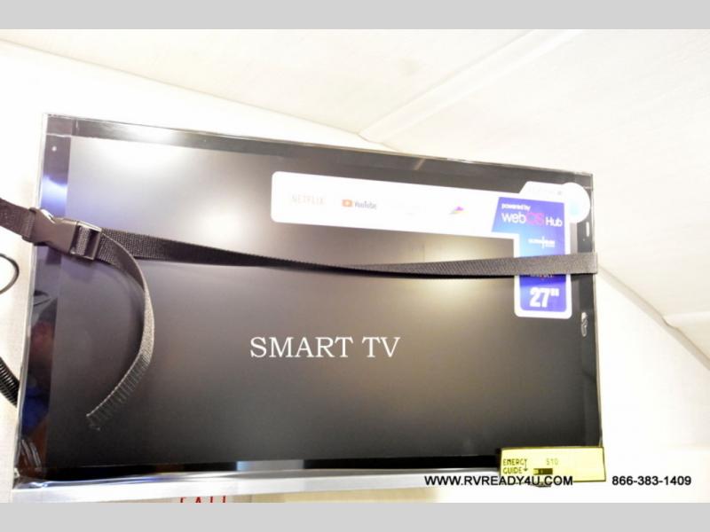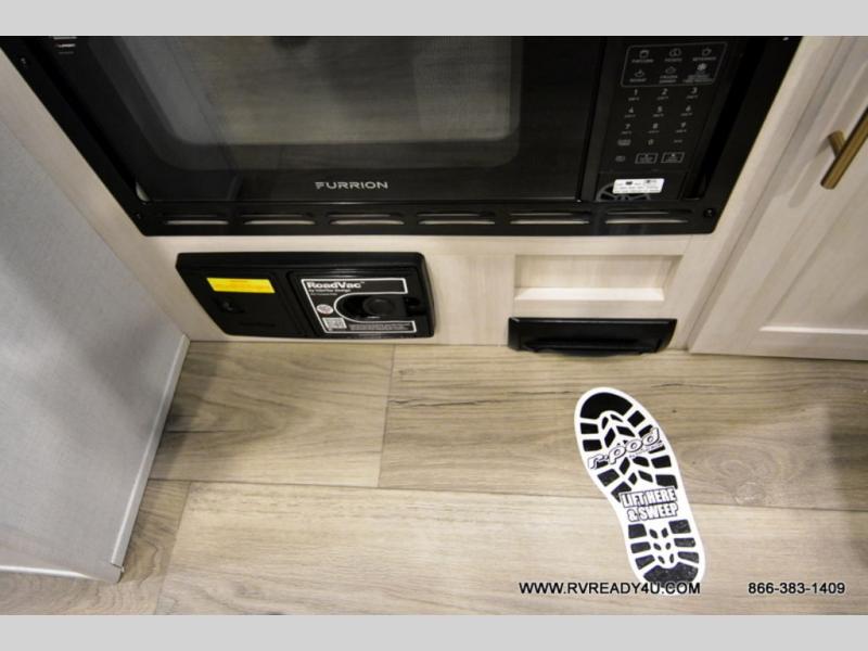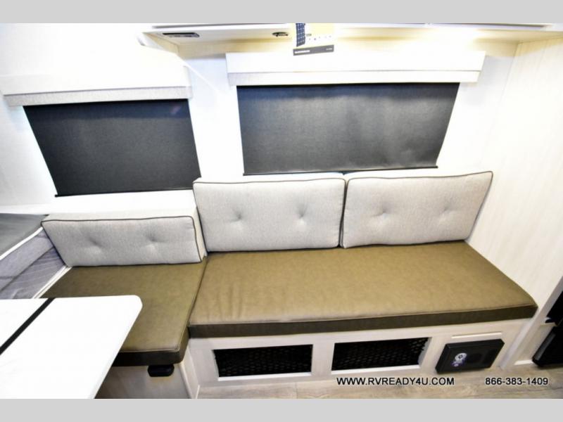Weekends at the lake just got sweeter in this cozy travel trailer. You can prepare your meals each day on the two burner cooktop, or in the convection microwave. There is a sofa to relax on with a good book, plus a booth dinette up front that features a Murphy bed you can fold down at night. This model also includes a 12V black glass refrigerator to keep your perishables fresh, and a pantry to store snacks and dry goods.