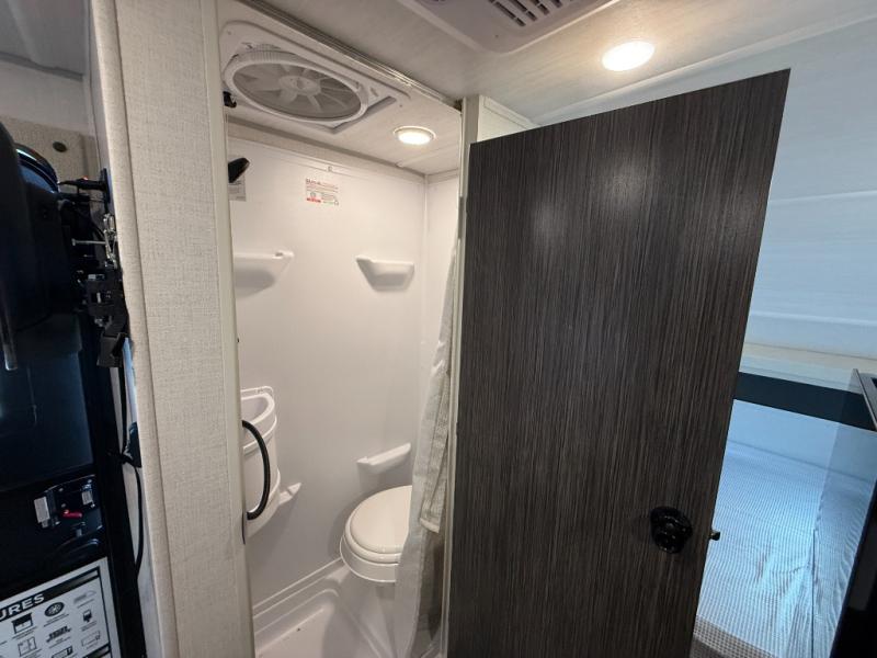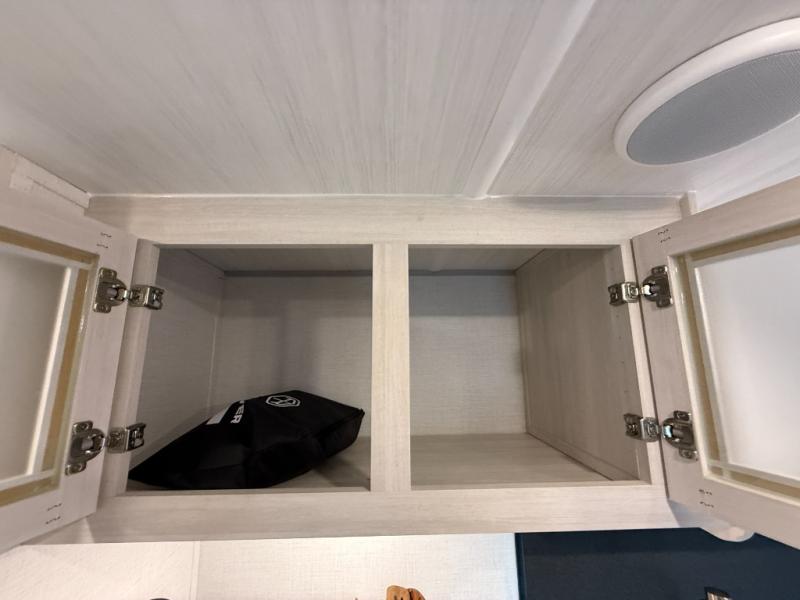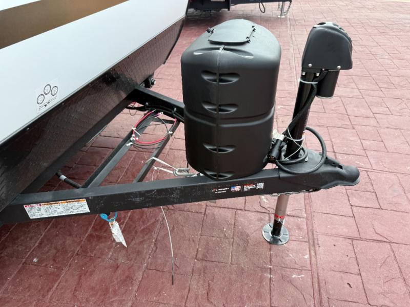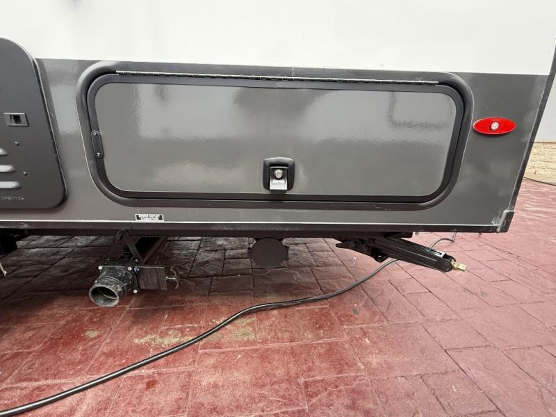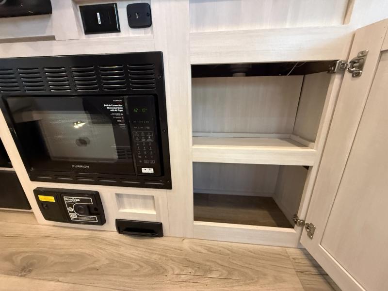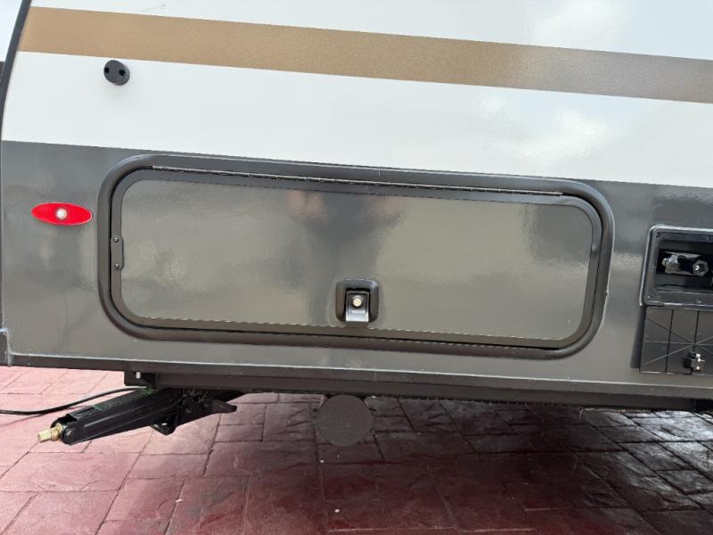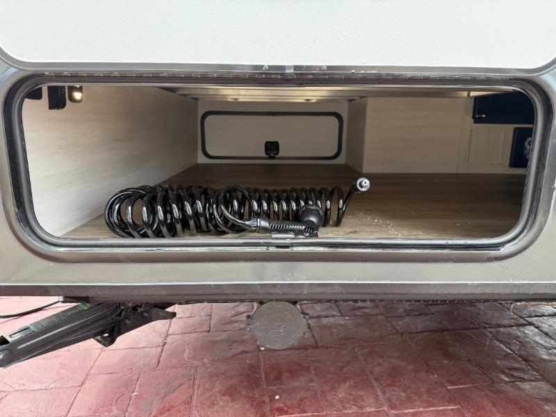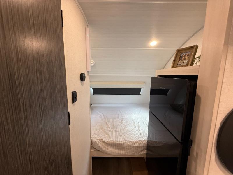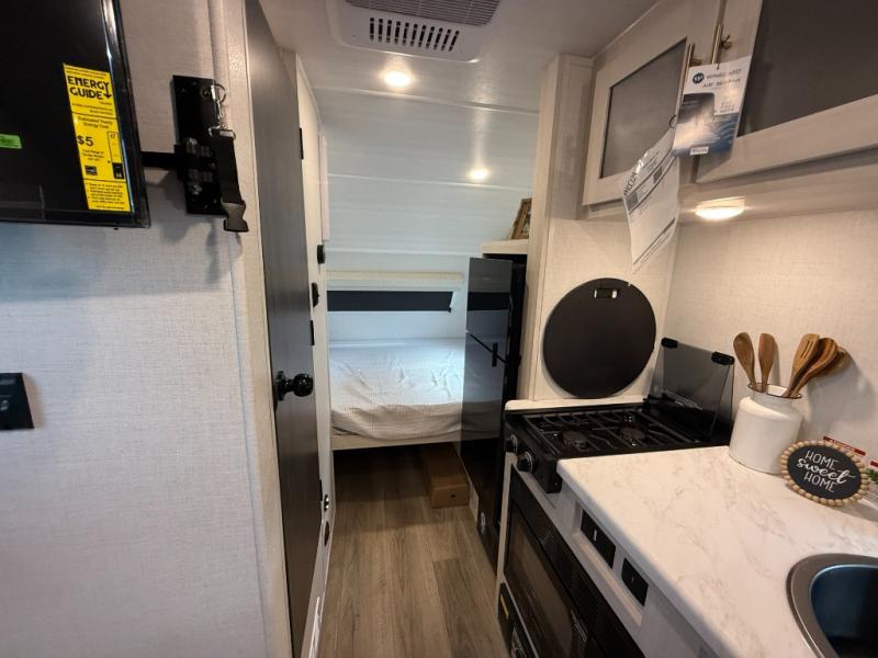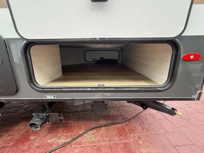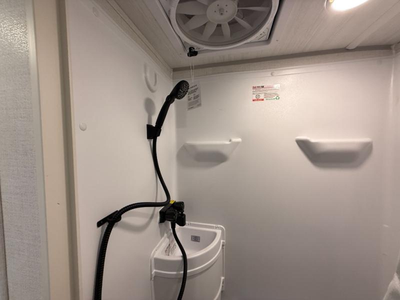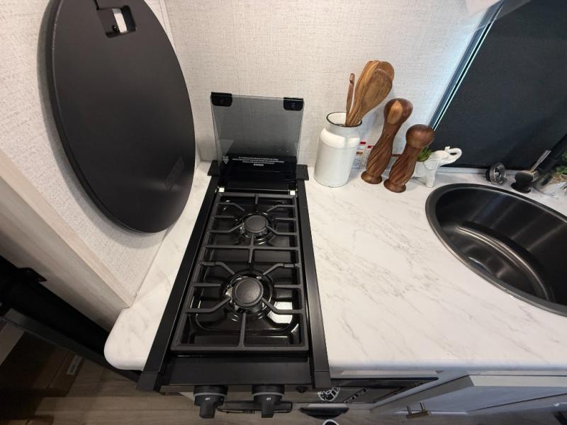 This travel trailer is perfect for weekend trips or month-long vacations to enjoy the great outdoors with conveniences of home. You can easily sleep three people with a rear queen bed and a front dinette folded down for the little ones. This unit also includes a two-burner cooktop and convection microwave to make meals inside. You will also find a convenient wet bath where you can easily get ready for bed each night, and the night light will help you not stumble over the sleeping dog!