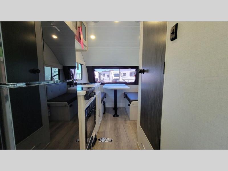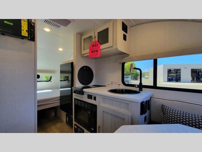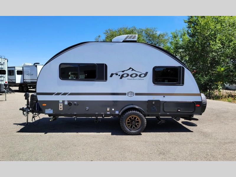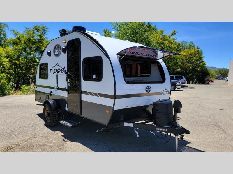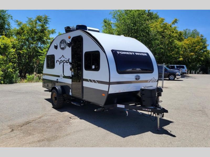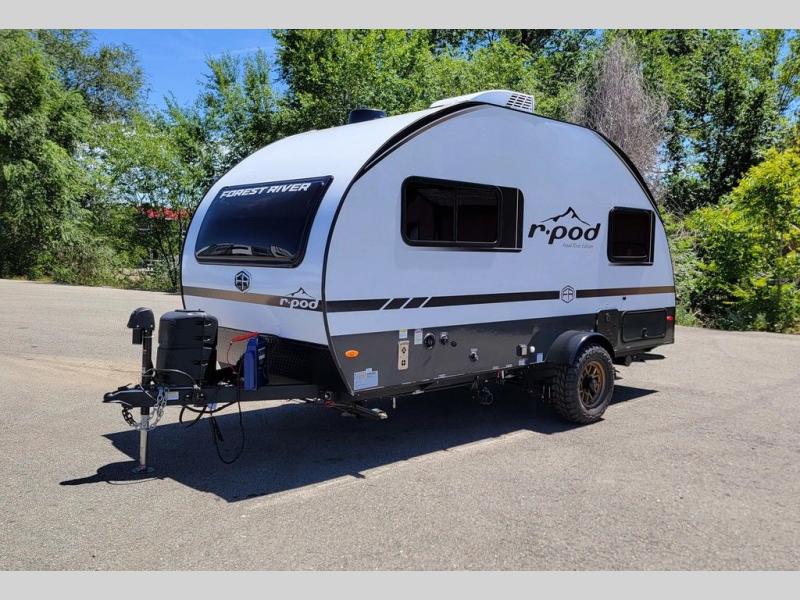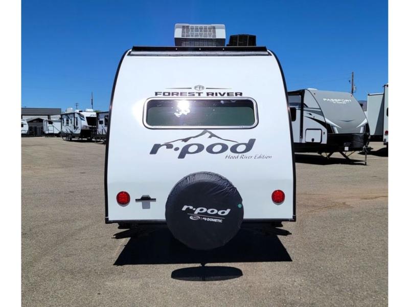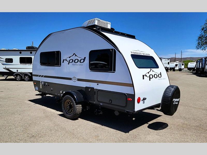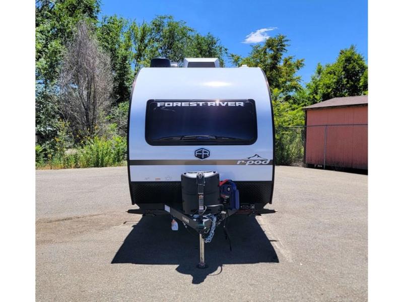 With any R-Pod travel trailer by Forest River, you will enjoy affordable luxury at the lowest tow weight in its class! There is a sealed underbelly with forced heat, a curved dual-pane acrylic front window with a bug screen and night shade, plus a large roof mounted solar panel for off-grid capabilities. The 15K A/C unit will keep you comfortable during the summer camping months, and the tankless water heater will provide endless hot showers after hiking, biking, swimming and more! Each model also includes a black glass friction hinge entrance door, roof ladder prep, exterior motion lighting, plus a hot and cold exterior spray port to wash off sand from the beach. Inside, you'll enjoy seamless Surf-X kitchen countertops, blackout roller shades, and a central vacuum system for hassle-free cleaning!