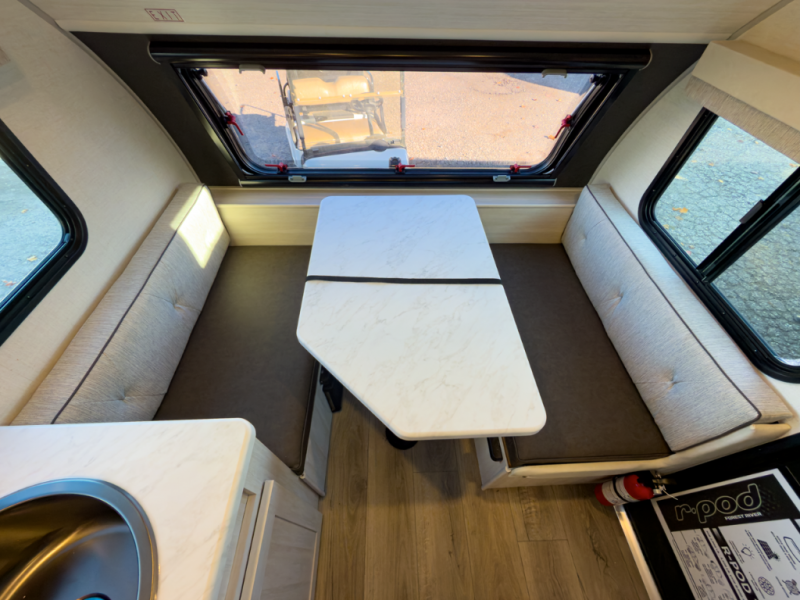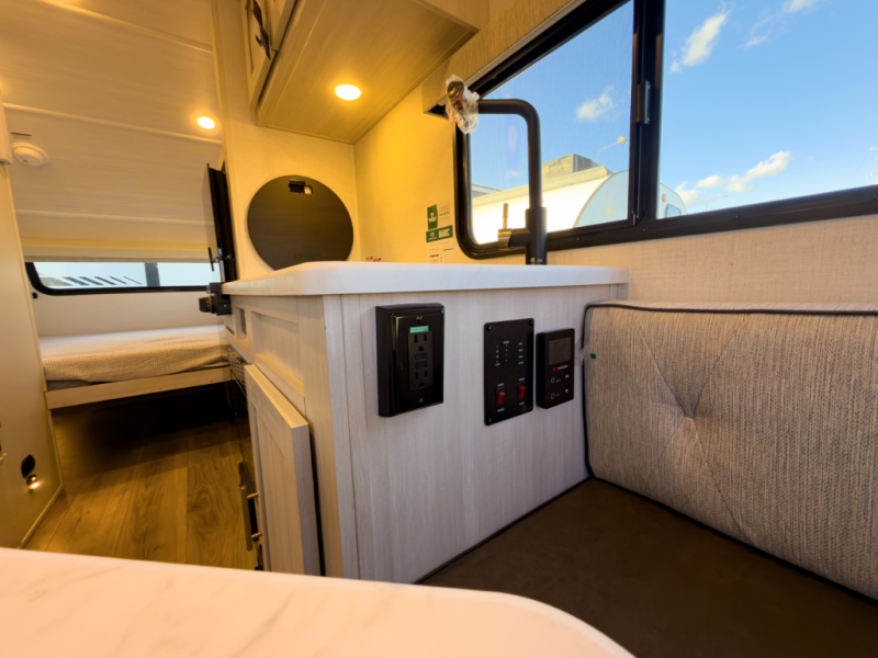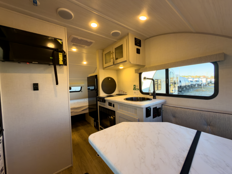 - Sleeping: 3-person layout with queen bed and convertible dinette