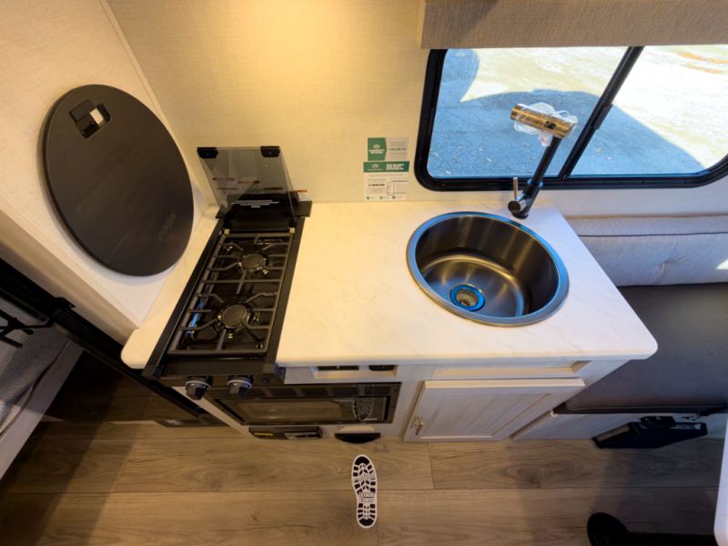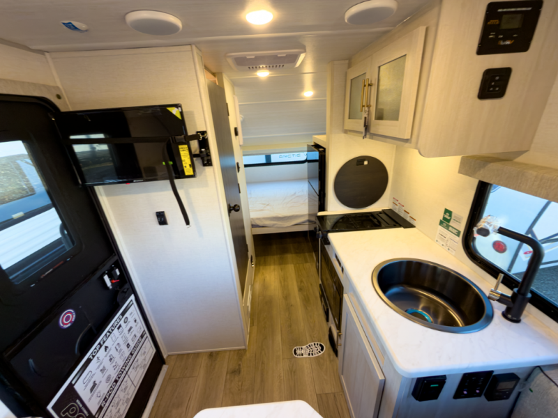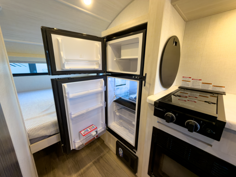 - Kitchen: Compact galley with 2-burner cooktop, microwave, fridge