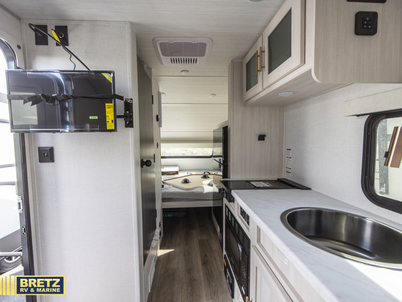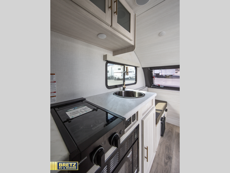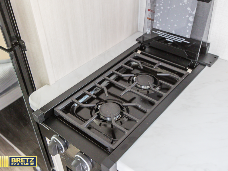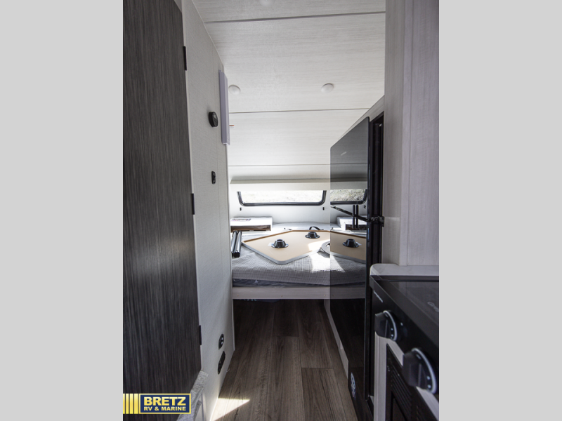 This travel trailer is perfect for weekend trips or month-long vacations to enjoy the great outdoors with conveniences of home. You can easily sleep three people with a rear queen bed and a front dinette folded down for the little ones. This unit also includes a two-burner cooktop and convection microwave to make meals inside. You will also find a convenient wet bath where you can easily get ready for bed each night, and the night light will help you not stumble over the sleeping dog!