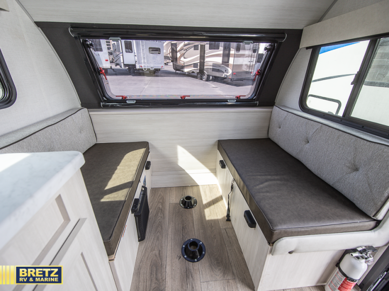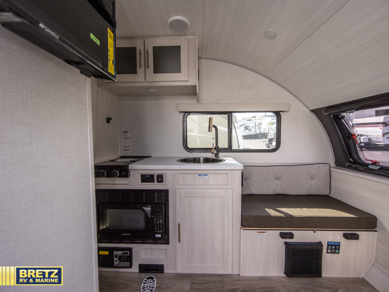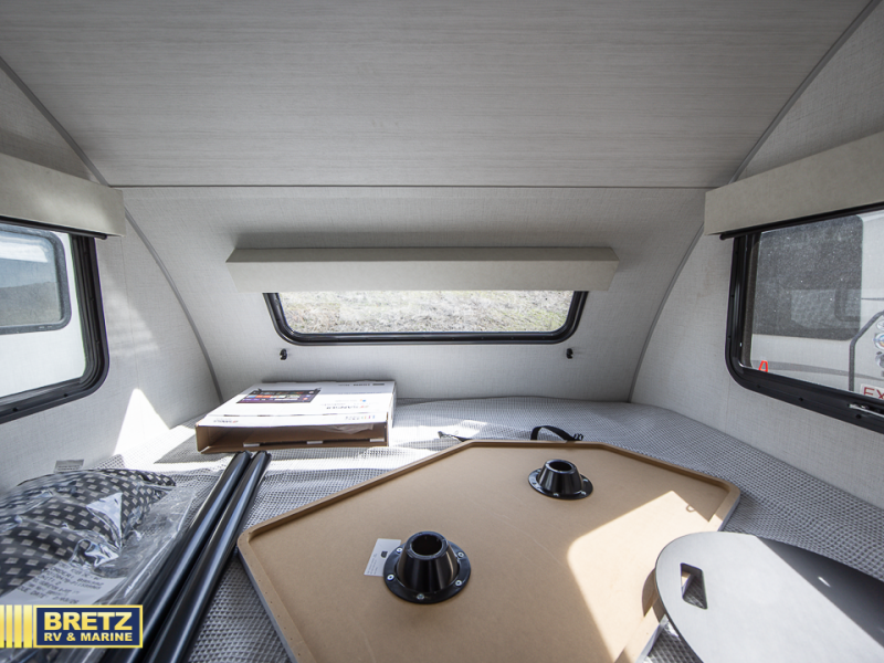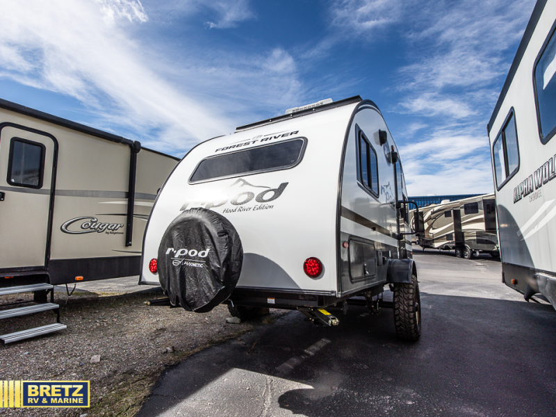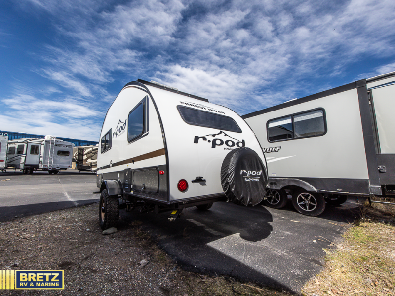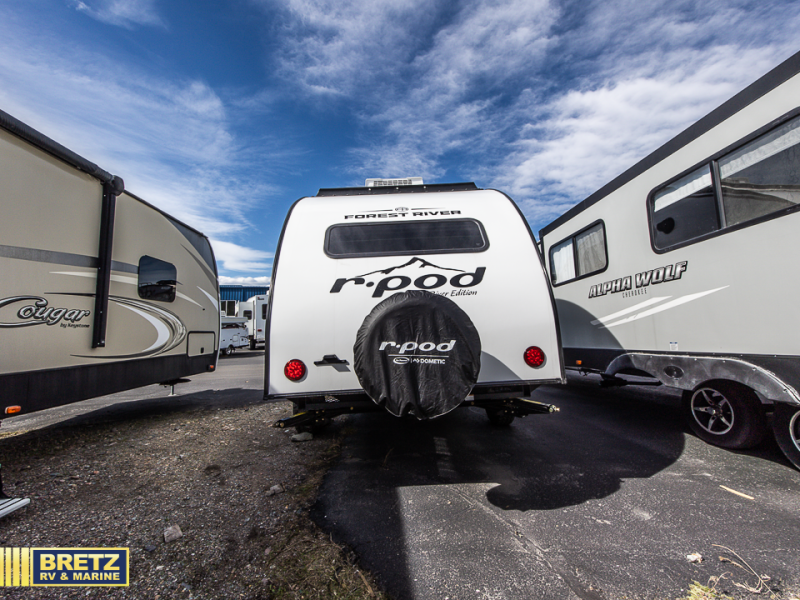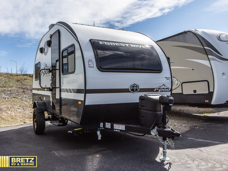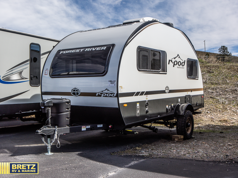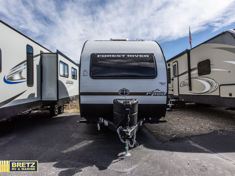 With any R-Pod travel trailer by Forest River, you will enjoy affordable luxury at the lowest tow weight in its class! There is a sealed underbelly with forced heat, a curved dual-pane acrylic front window with a bug screen and night shade, plus a large roof mounted solar panel for off-grid capabilities. The 15K A/C unit will keep you comfortable during the summer camping months, and the tankless water heater will provide endless hot showers after hiking, biking, swimming and more! Each model also includes a black glass friction hinge entrance door, roof ladder prep, exterior motion lighting, plus a hot and cold exterior spray port to wash off sand from the beach. Inside, you'll enjoy seamless Surf-X kitchen countertops, blackout roller shades, and a central vacuum system for hassle-free cleaning!
