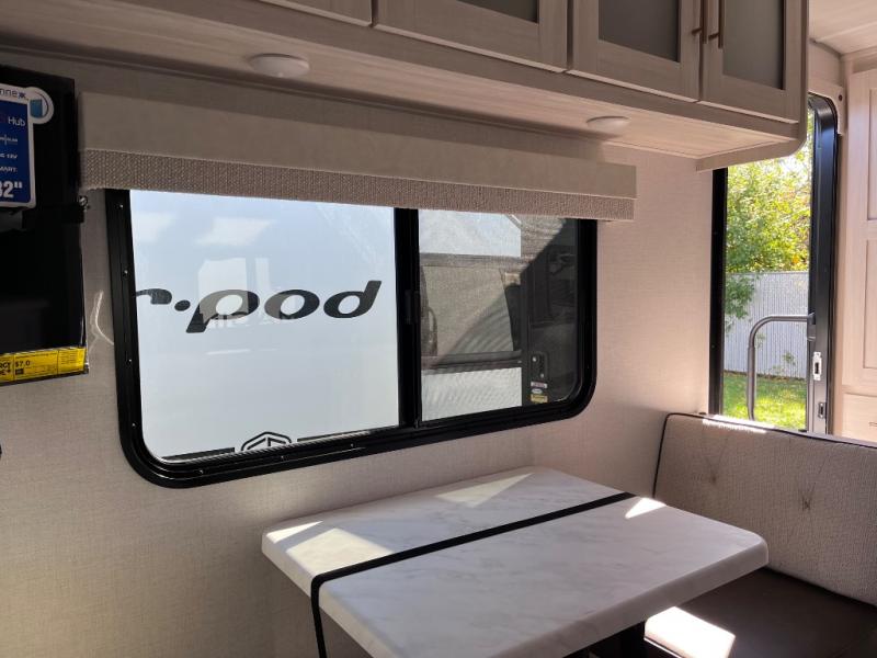 With any R-Pod travel trailer by Forest River, you will enjoy affordable luxury at the lowest tow weight in its class! There is a sealed underbelly with forced heat, a curved dual-pane acrylic front window with a bug screen and night shade, plus a large roof mounted solar panel for off-grid capabilities. The 15K A/C unit will keep you comfortable during the summer camping months, and the tankless water heater will provide endless hot showers after hiking, biking, swimming and more! Each model also includes a black glass friction hinge entrance door, roof ladder prep, exterior motion lighting, plus a hot and cold exterior spray port to wash off sand from the beach. Inside, you'll enjoy seamless Surf-X kitchen countertops, blackout roller shades, and a central vacuum system for hassle-free cleaning!