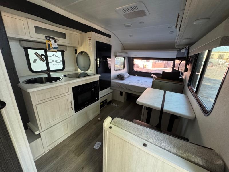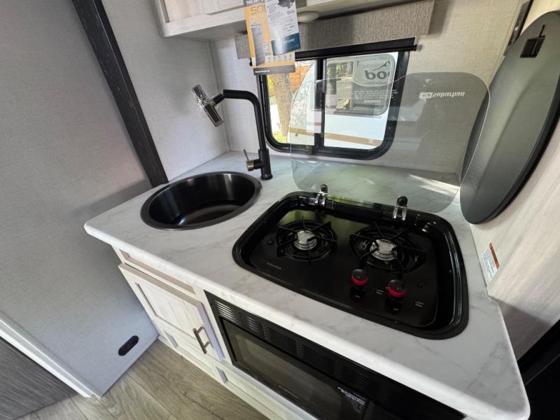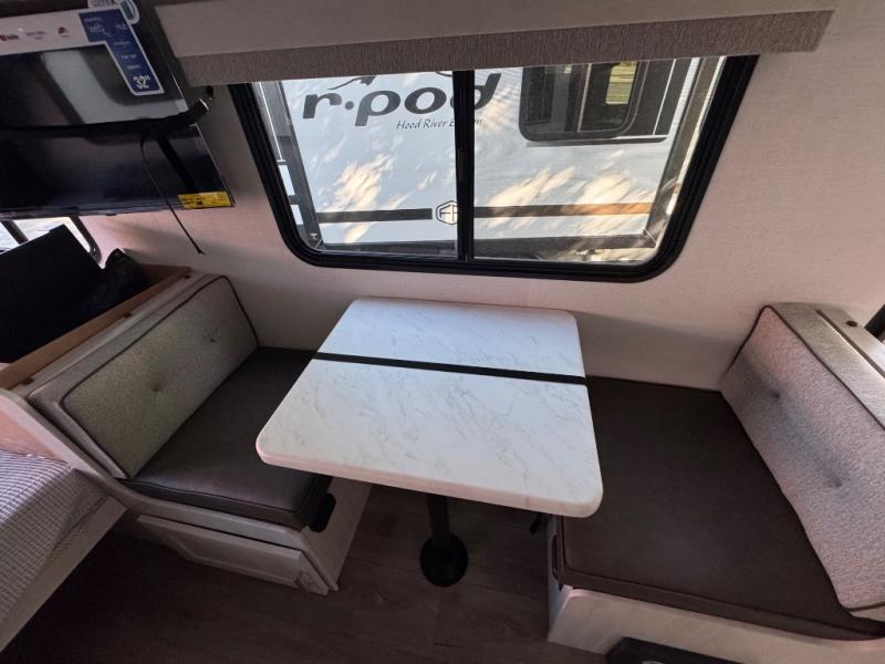 With any R-Pod travel trailer by Forest River, you will enjoy affordable luxury at the lowest tow weight in its class! There is a sealed underbelly with forced heat, a curved dual-pane acrylic front window with a bug screen and night shade, plus a large roof mounted solar panel for off-grid capabilities. The 15K A/C unit will keep you comfortable during the summer camping months, and the tankless water heater will provide endless hot showers after hiking, biking, swimming and more! Each model also includes a black glass friction hinge entrance door, roof ladder prep, exterior motion lighting, plus a hot and cold exterior spray port to wash off sand from the beach. Inside, you'll enjoy seamless Surf-X kitchen countertops, blackout roller shades, and a central vacuum system for hassle-free cleaning!