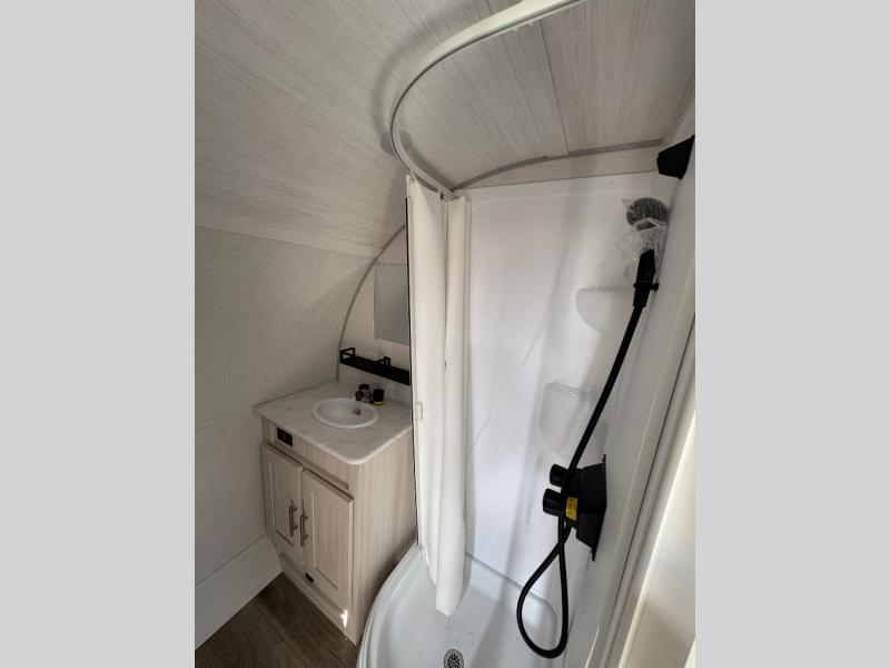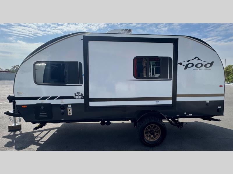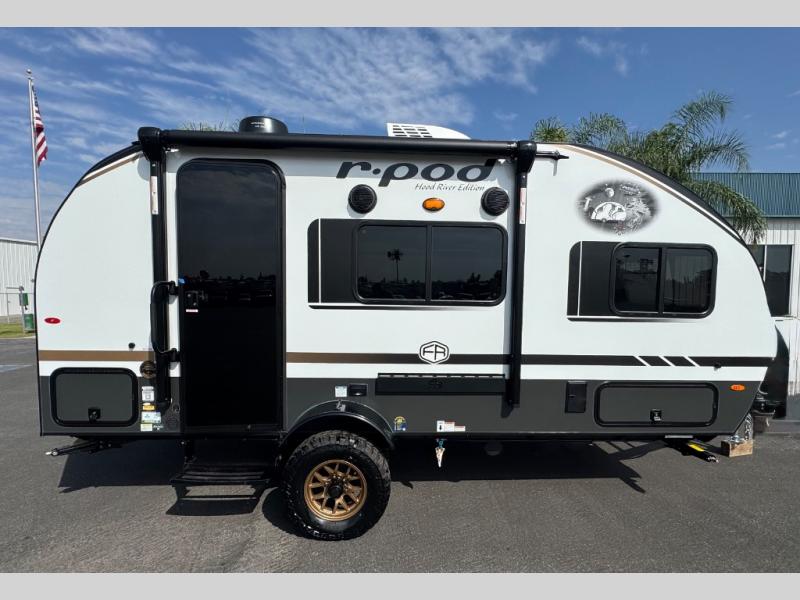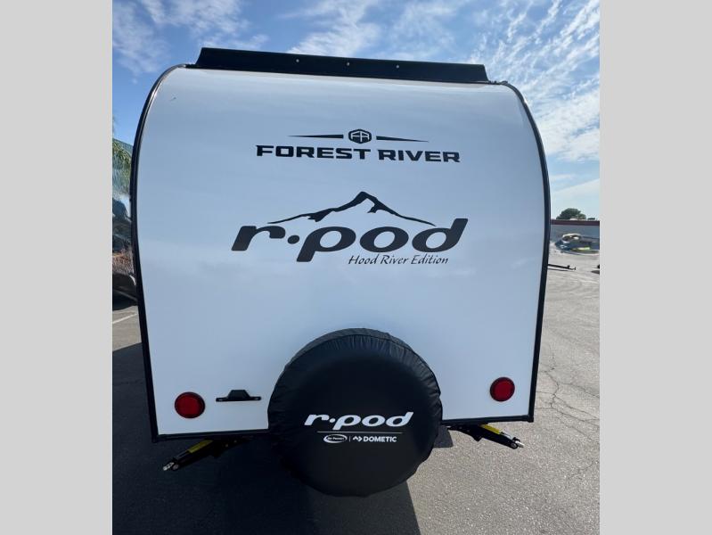 With any R-Pod travel trailer by Forest River, you will enjoy affordable luxury at the lowest tow weight in its class! There is a sealed underbelly with forced heat, a curved dual-pane acrylic front window with a bug screen and night shade, plus a large roof mounted solar panel for off-grid capabilities. The 15K A/C unit will keep you comfortable during the summer camping months, and the tankless water heater will provide endless hot showers after hiking, biking, swimming and more! Each model also includes a black glass friction hinge entrance door, roof ladder prep, exterior motion lighting, plus a hot and cold exterior spray port to wash off sand from the beach. Inside, you'll enjoy seamless Surf-X kitchen countertops, blackout roller shades, and a central vacuum system for hassle-free cleaning!
