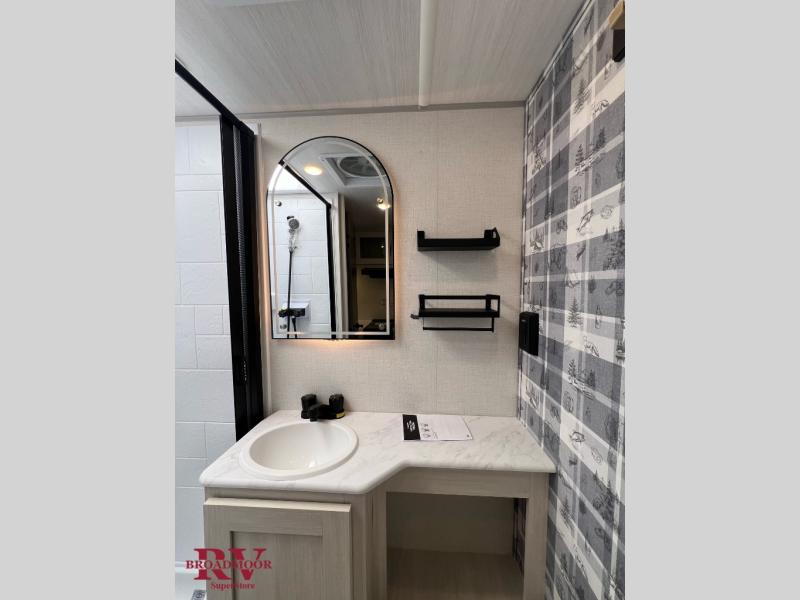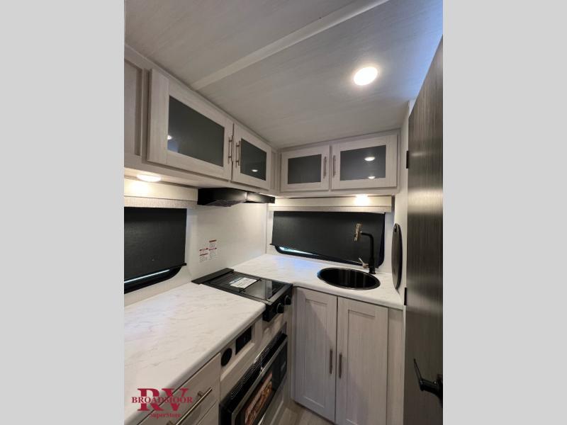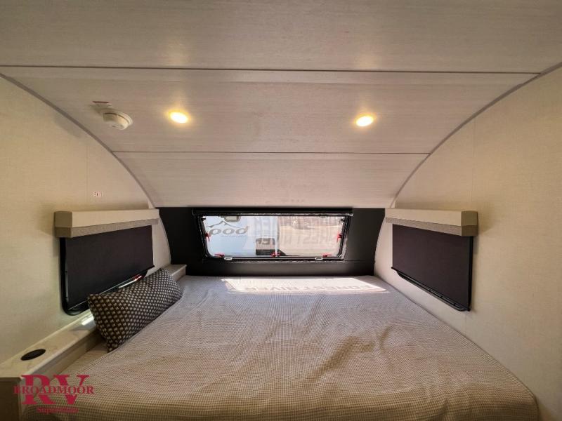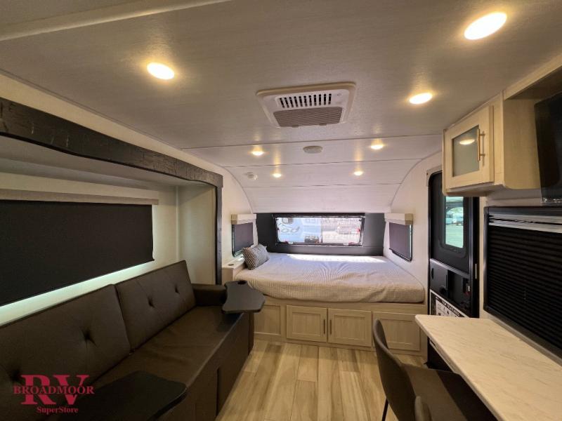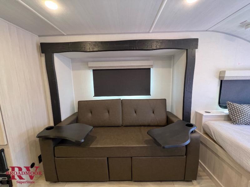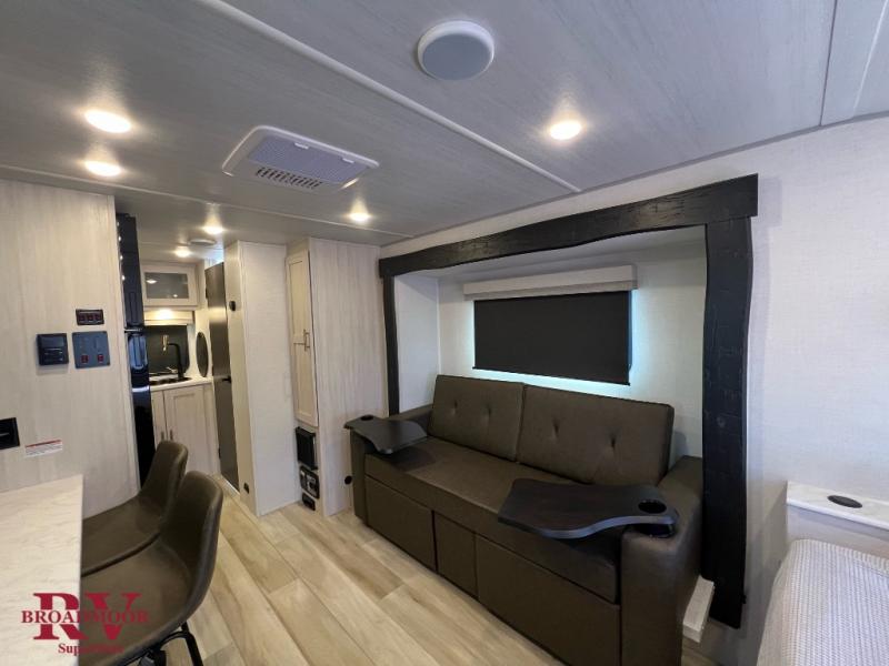 This travel trailer makes time at the campground easier than ever. Once you arrive at your site, you can put out the 14' awning, unload the exterior storage, then stretch your legs on a trail. The rear corner kitchen will let you make lunch when you return, and there is a bar top with two chairs where you can dine at. The jackknife sofa with leg rests is within a slide out so you can enjoy more floor space, and the front queen bed is sure to make you feel right at home.