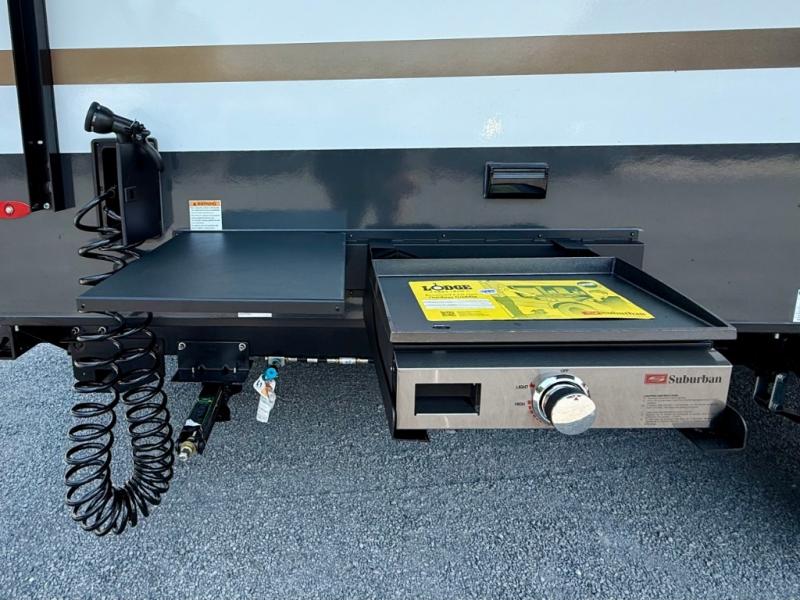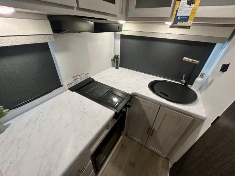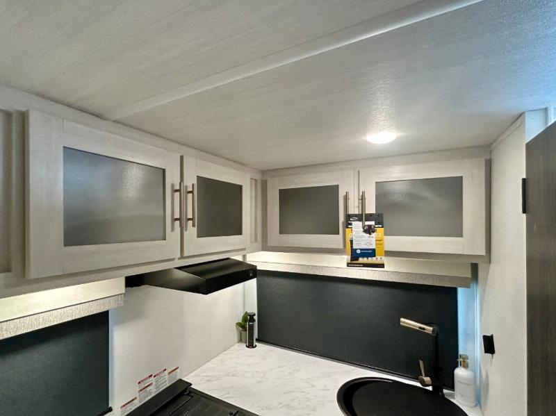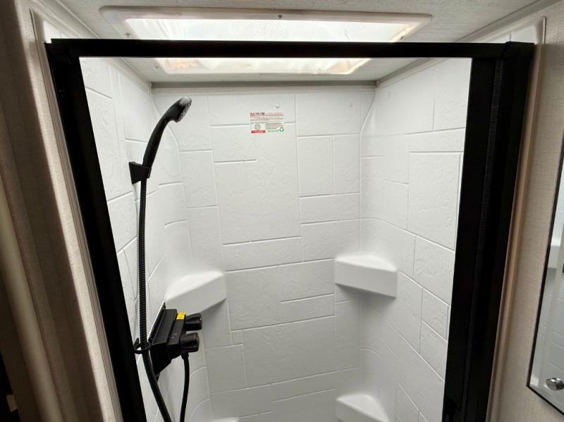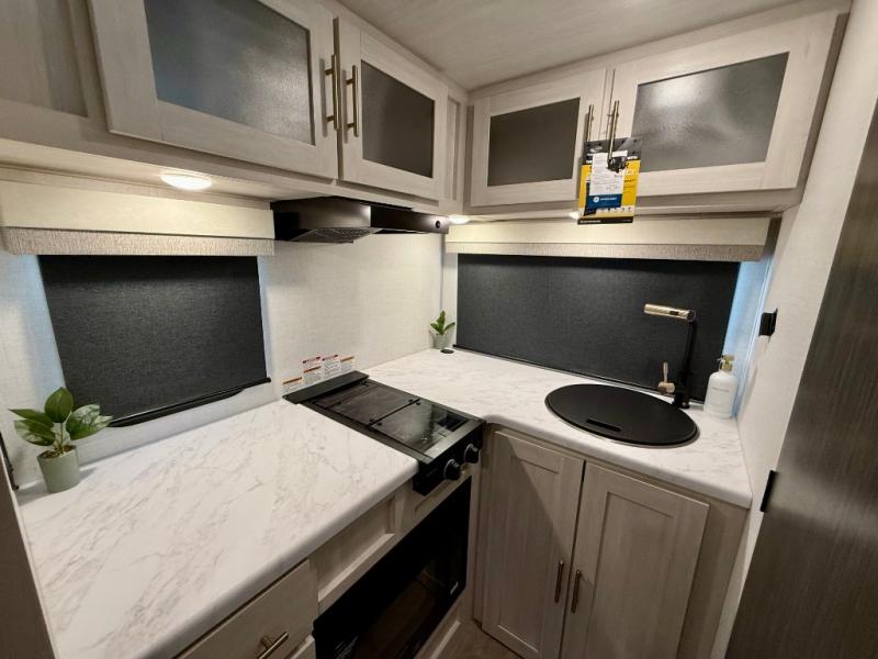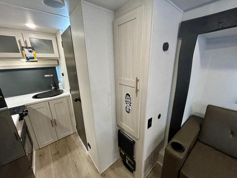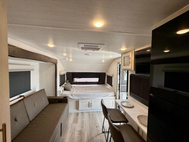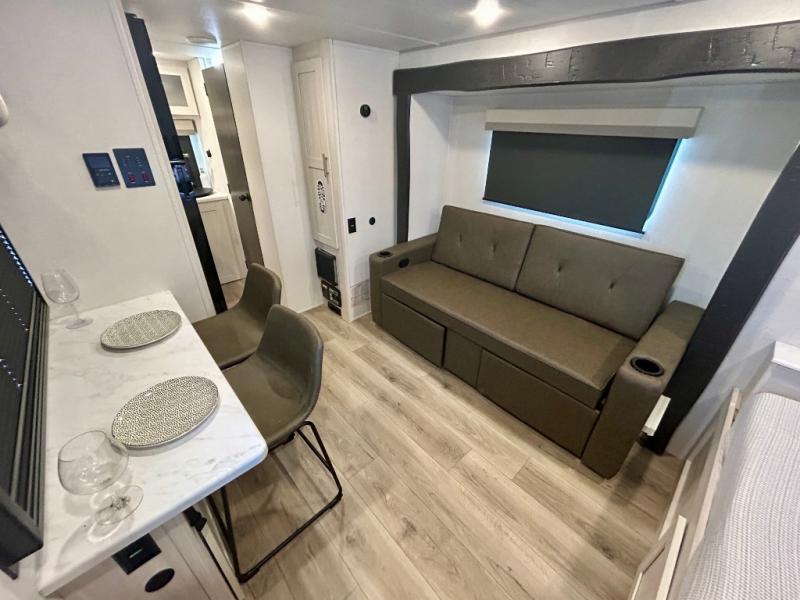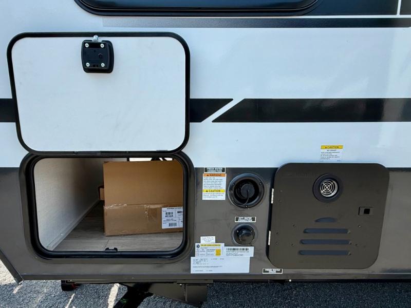 This travel trailer makes time at the campground easier than ever. Once you arrive at your site, you can put out the 14' awning, unload the exterior storage, then stretch your legs on a trail. The rear corner kitchen will let you make lunch when you return, and there is a bar top with two chairs where you can dine at. The jackknife sofa with leg rests is within a slide out so you can enjoy more floor space, and the front queen bed is sure to make you feel right at home.