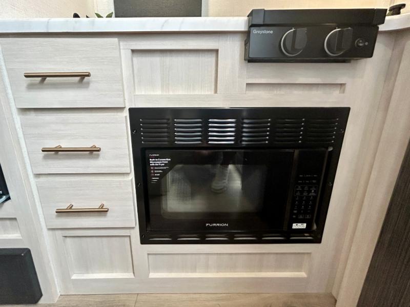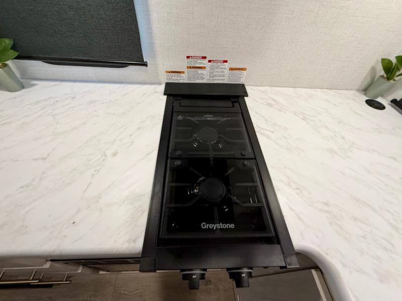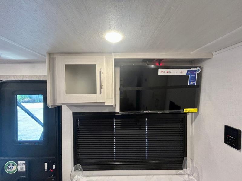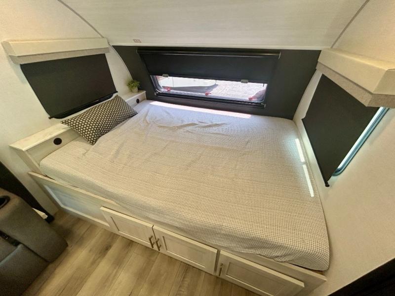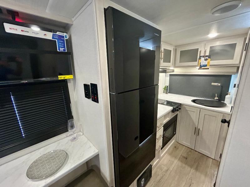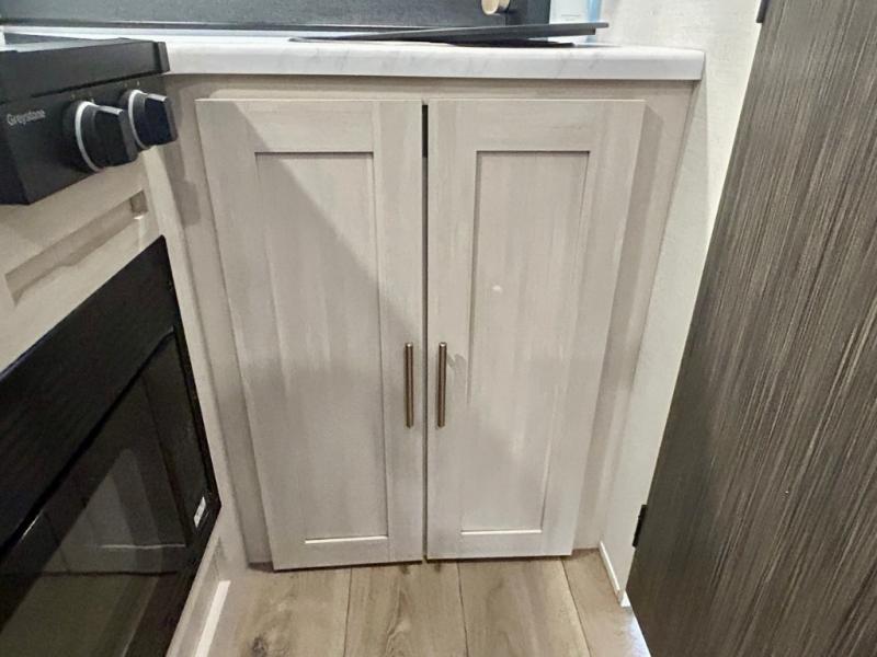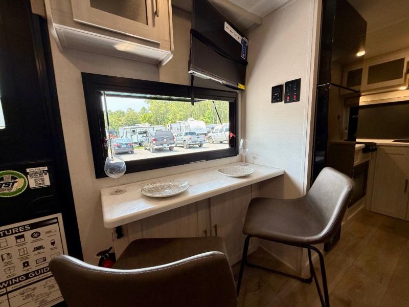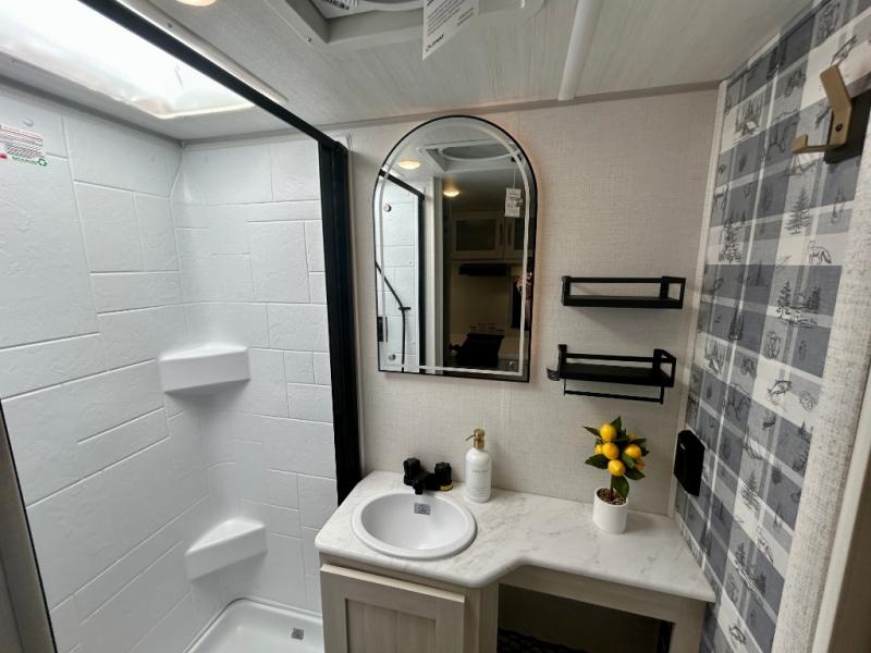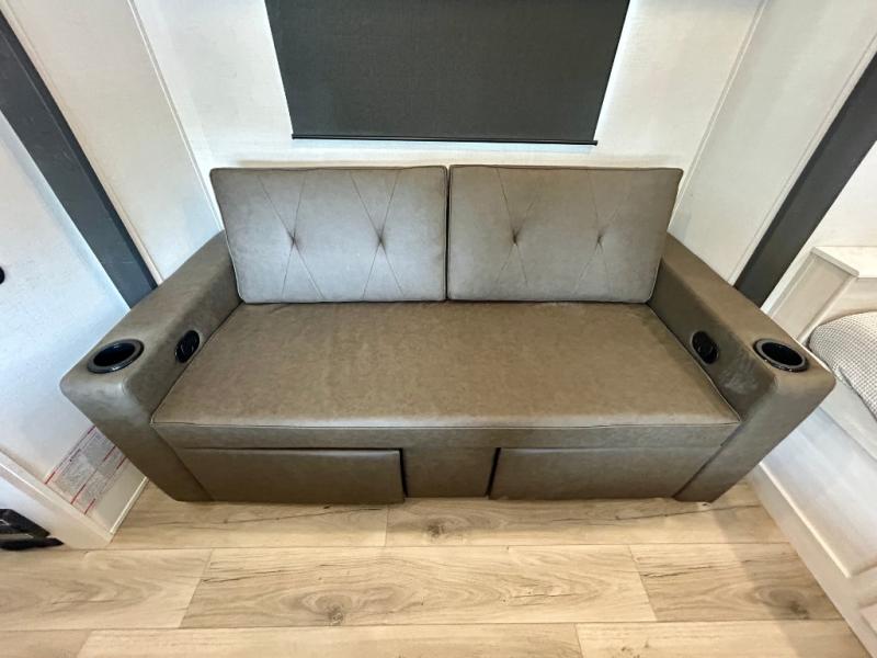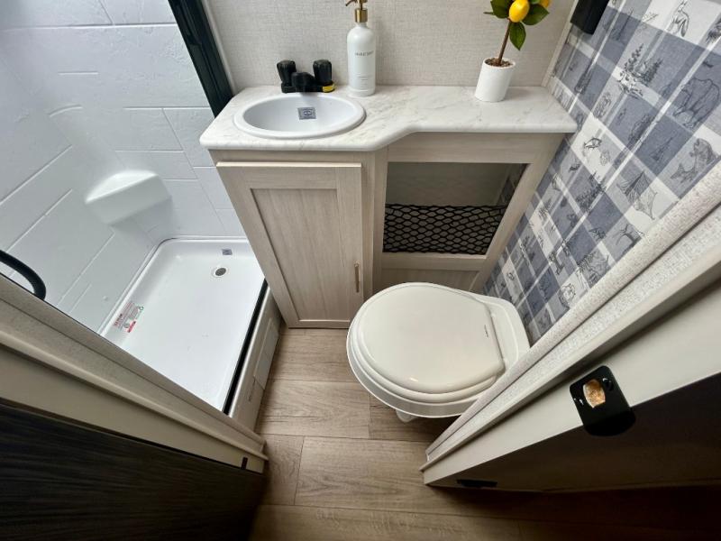 This travel trailer makes time at the campground easier than ever. Once you arrive at your site, you can put out the 14' awning, unload the exterior storage, then stretch your legs on a trail. The rear corner kitchen will let you make lunch when you return, and there is a bar top with two chairs where you can dine at. The jackknife sofa with leg rests is within a slide out so you can enjoy more floor space, and the front queen bed is sure to make you feel right at home.