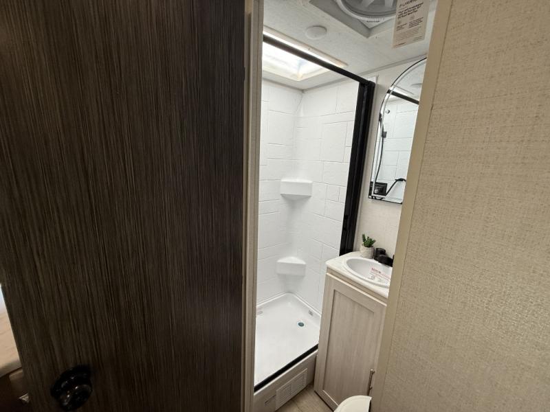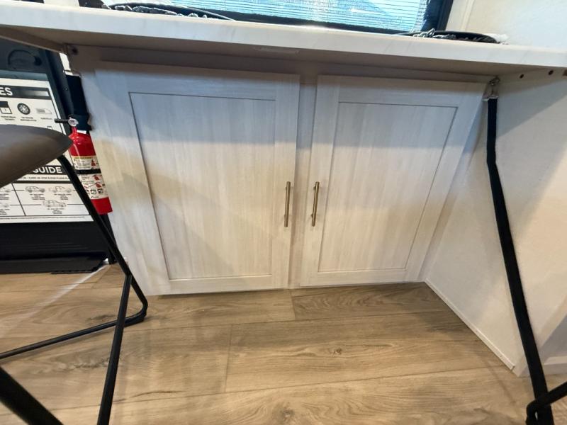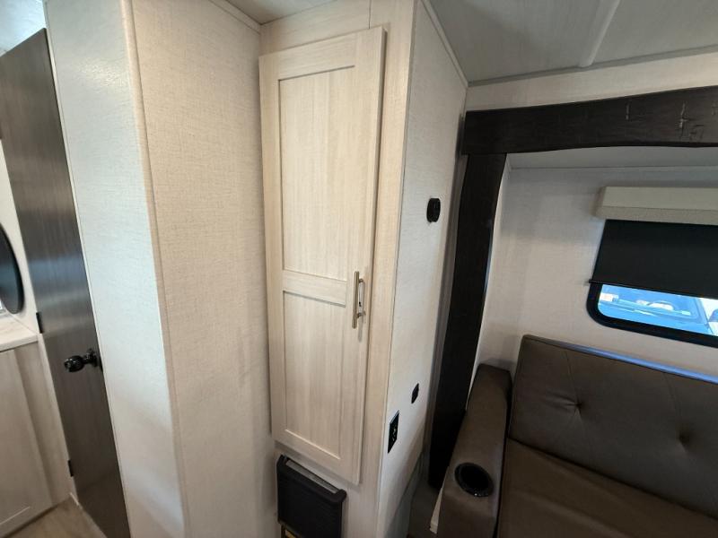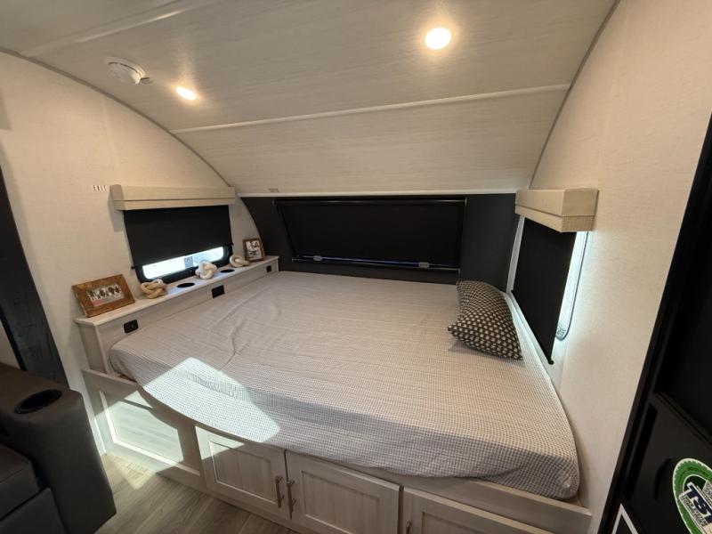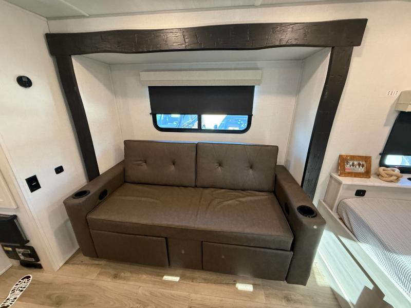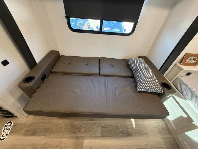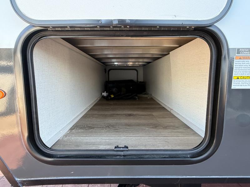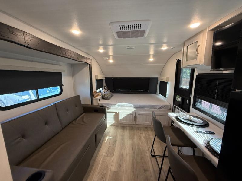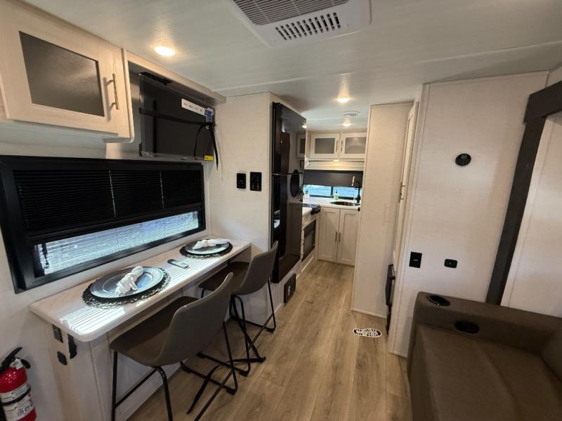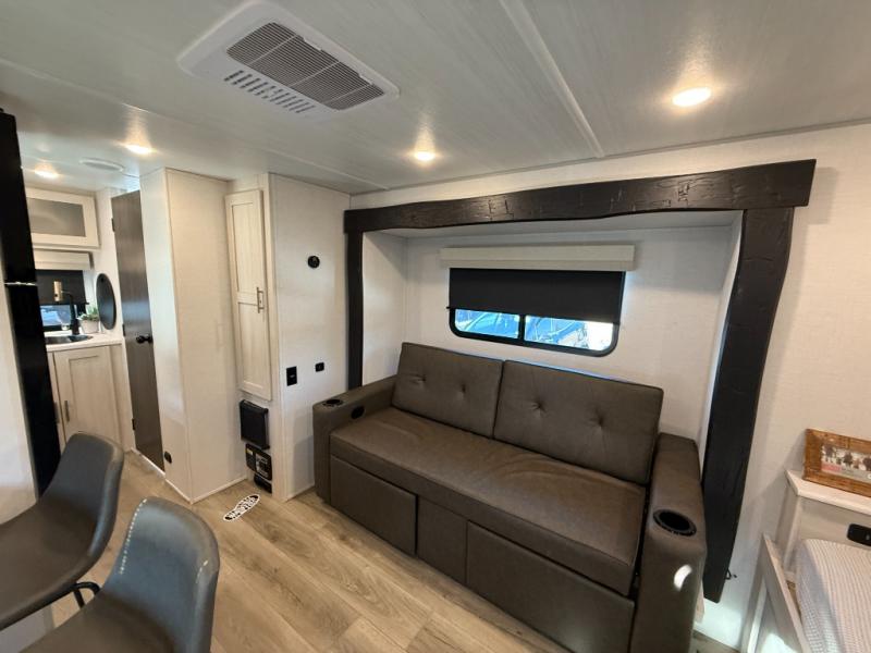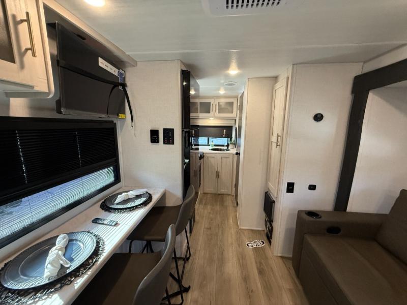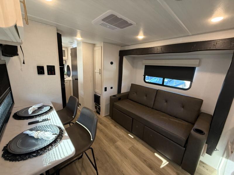 This travel trailer makes time at the campground easier than ever. Once you arrive at your site, you can put out the 14' awning, unload the exterior storage, then stretch your legs on a trail. The rear corner kitchen will let you make lunch when you return, and there is a bar top with two chairs where you can dine at. The jackknife sofa with leg rests is within a slide out so you can enjoy more floor space, and the front queen bed is sure to make you feel right at home.