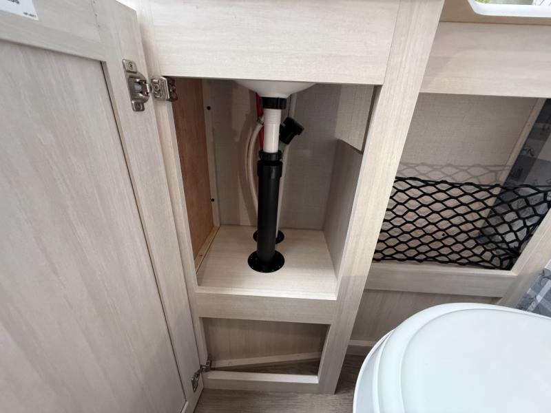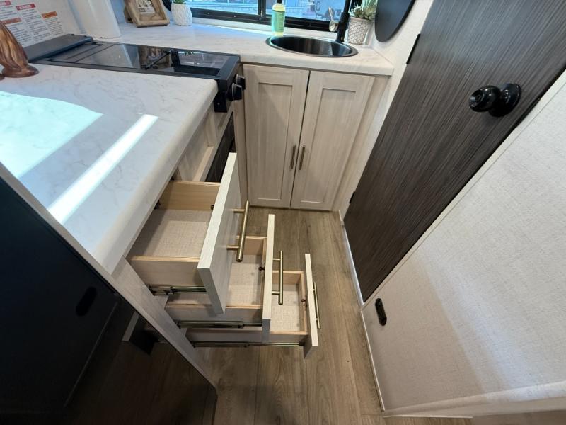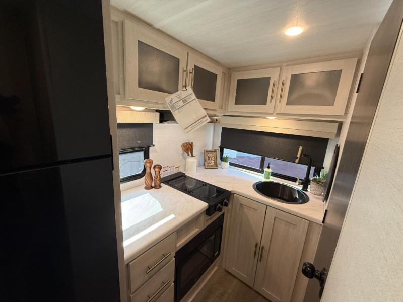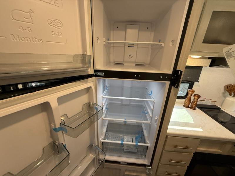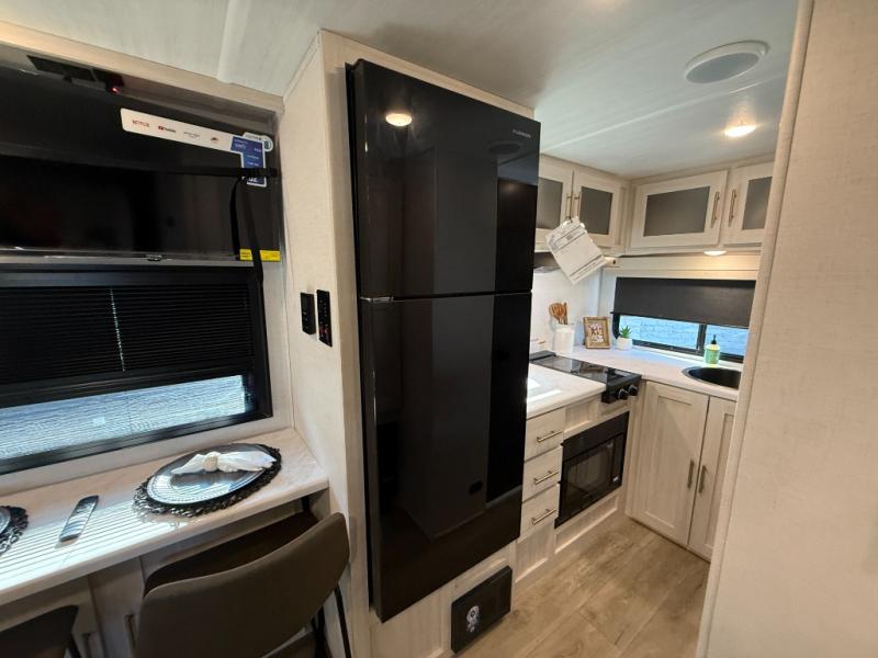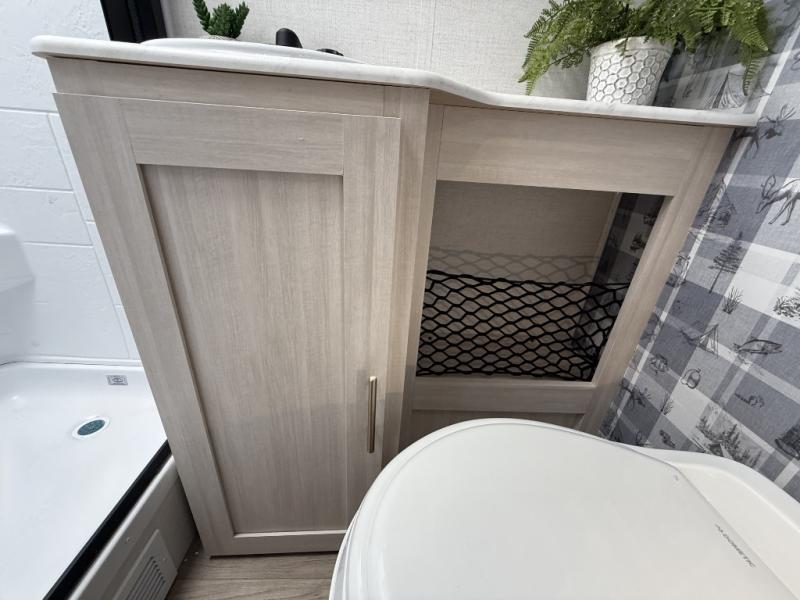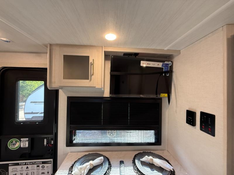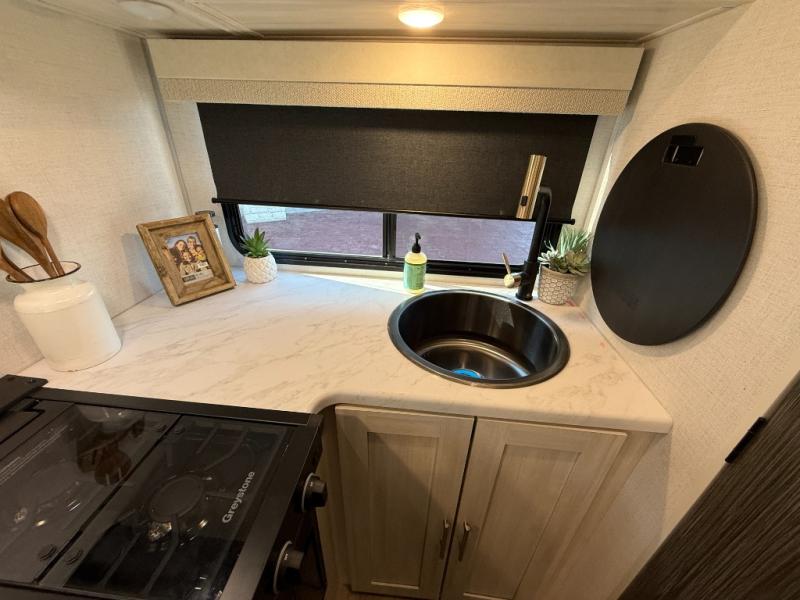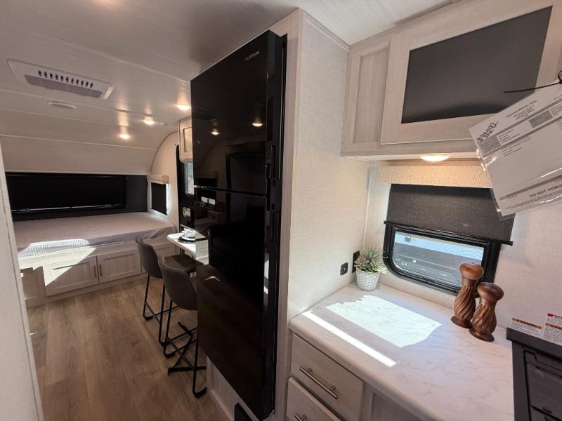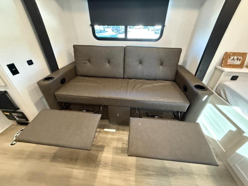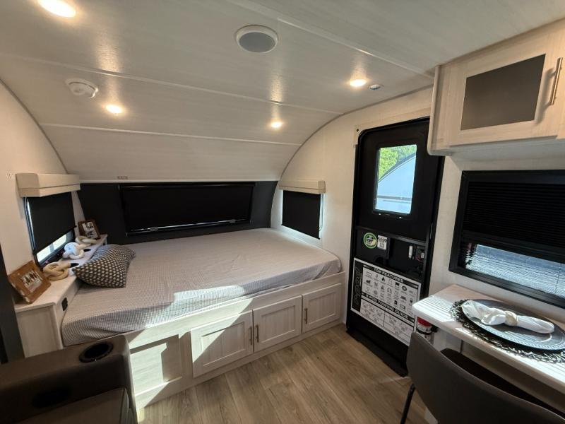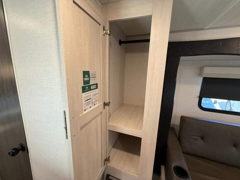 This travel trailer makes time at the campground easier than ever. Once you arrive at your site, you can put out the 14' awning, unload the exterior storage, then stretch your legs on a trail. The rear corner kitchen will let you make lunch when you return, and there is a bar top with two chairs where you can dine at. The jackknife sofa with leg rests is within a slide out so you can enjoy more floor space, and the front queen bed is sure to make you feel right at home.