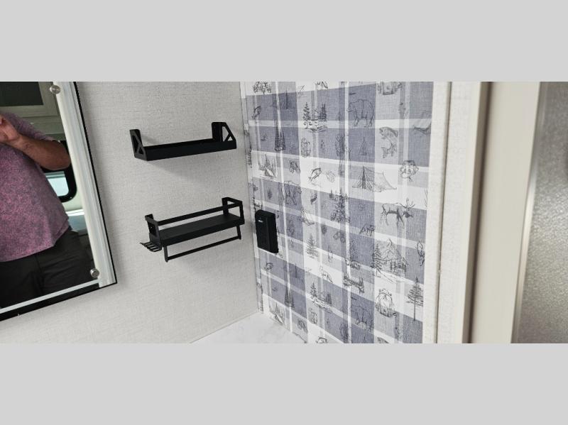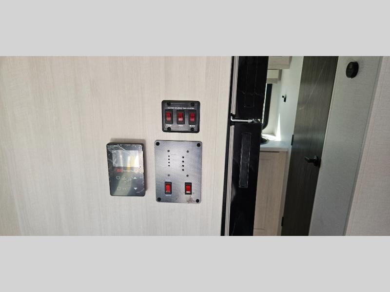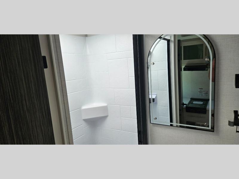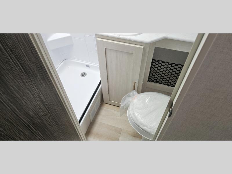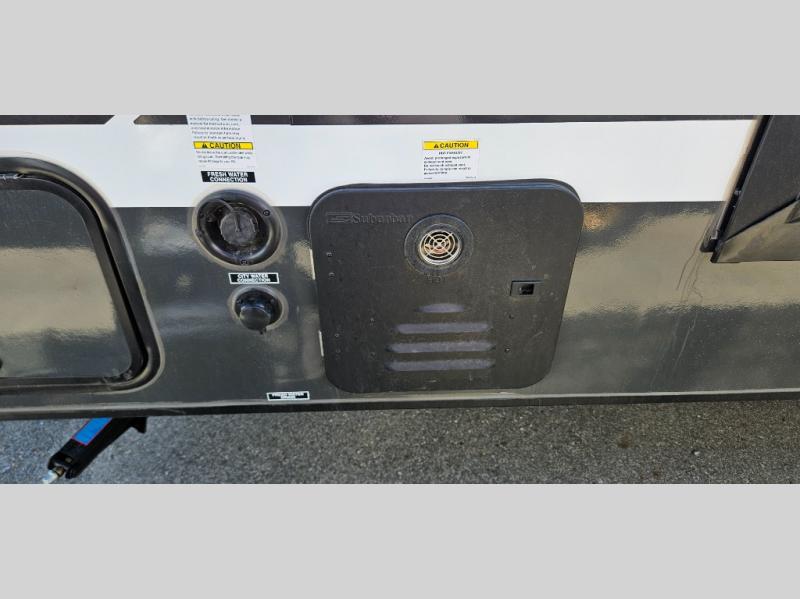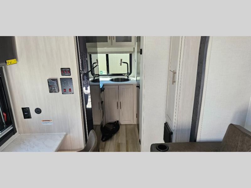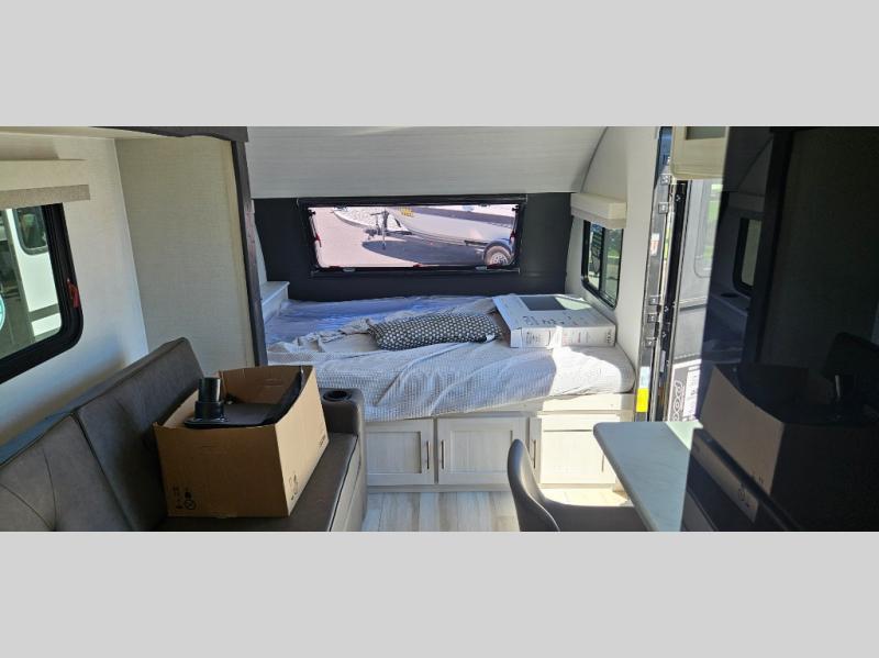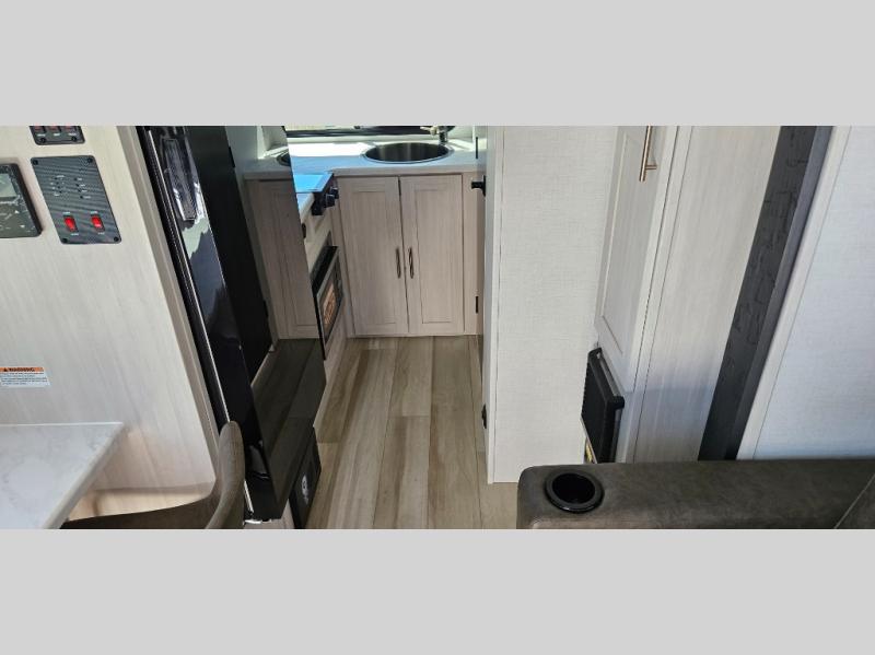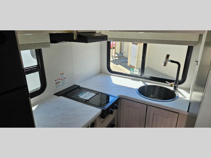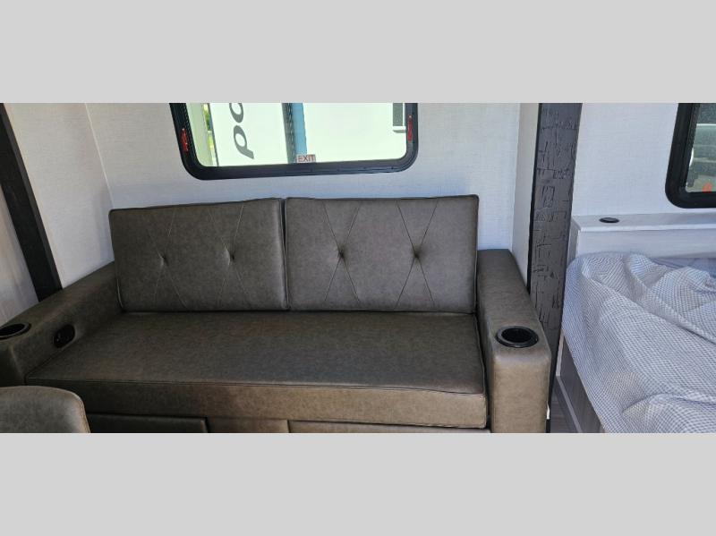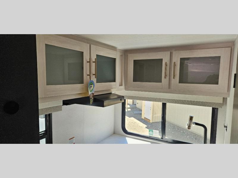 This travel trailer makes time at the campground easier than ever. Once you arrive at your site, you can put out the 14' awning, unload the exterior storage, then stretch your legs on a trail. The rear corner kitchen will let you make lunch when you return, and there is a bar top with two chairs where you can dine at. The jackknife sofa with leg rests is within a slide out so you can enjoy more floor space, and the front queen bed is sure to make you feel right at home.