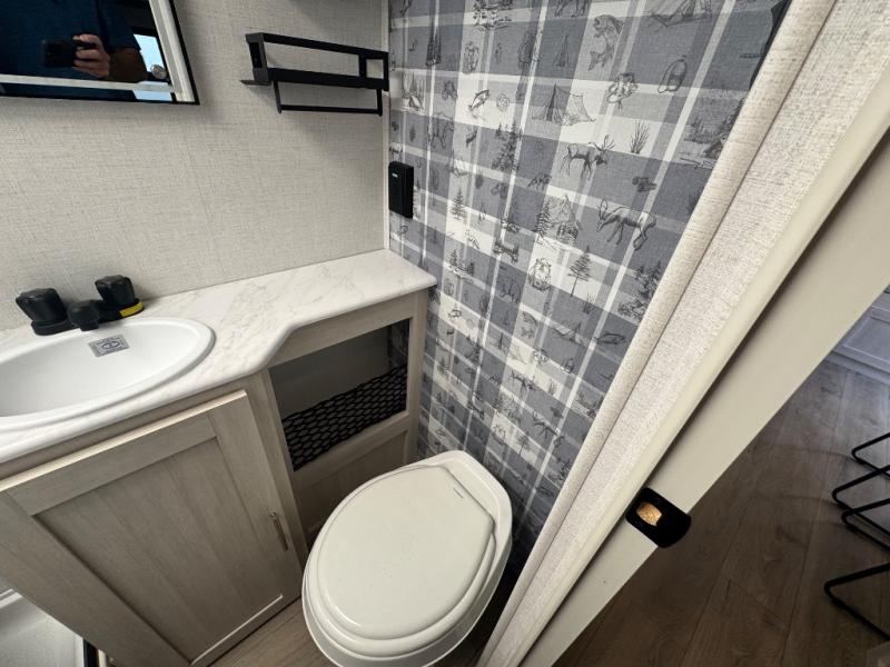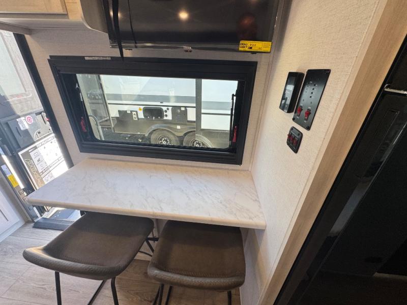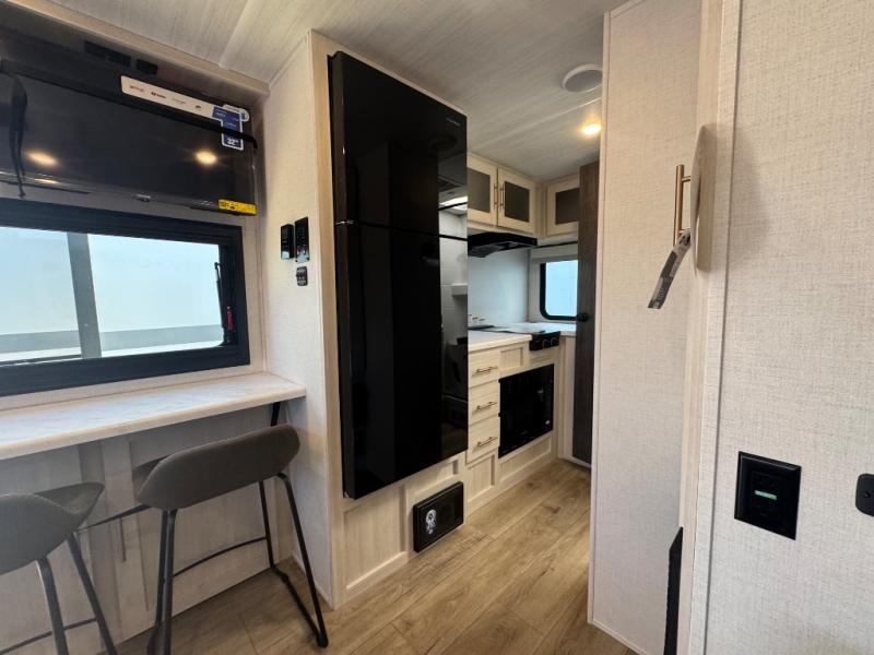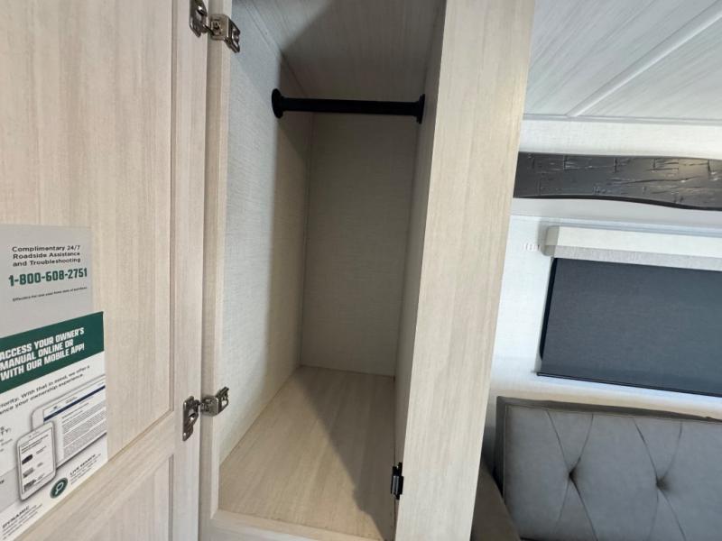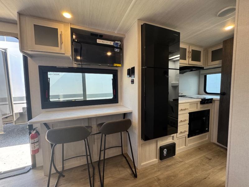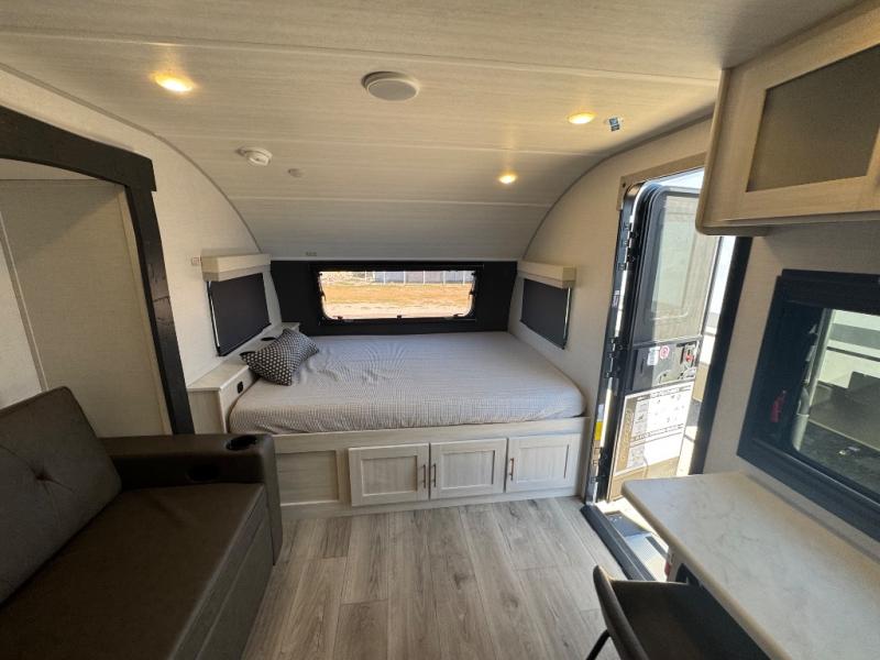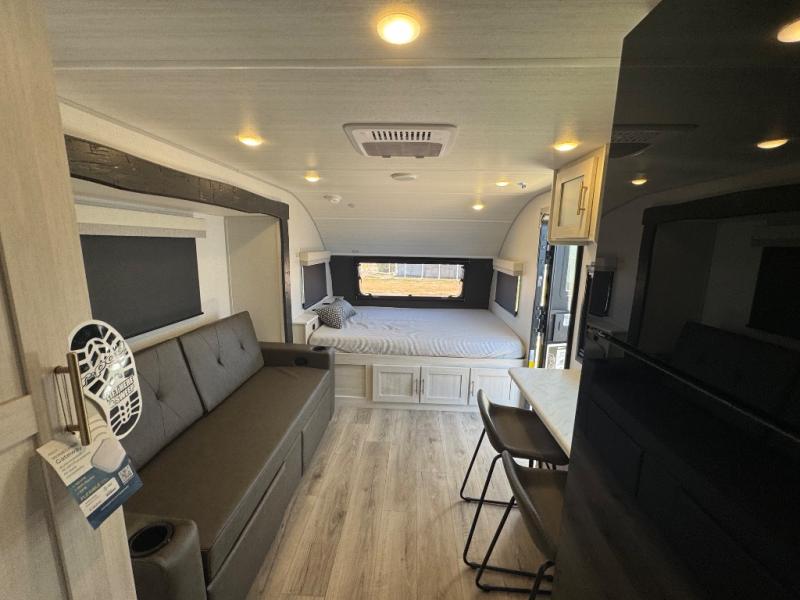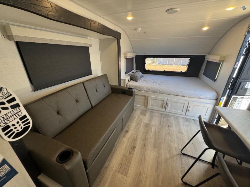 This travel trailer makes time at the campground easier than ever. Once you arrive at your site, you can put out the 14' awning, unload the exterior storage, then stretch your legs on a trail. The rear corner kitchen will let you make lunch when you return, and there is a bar top with two chairs where you can dine at. The jackknife sofa with leg rests is within a slide out so you can enjoy more floor space, and the front queen bed is sure to make you feel right at home.