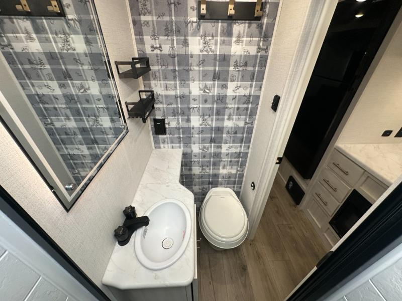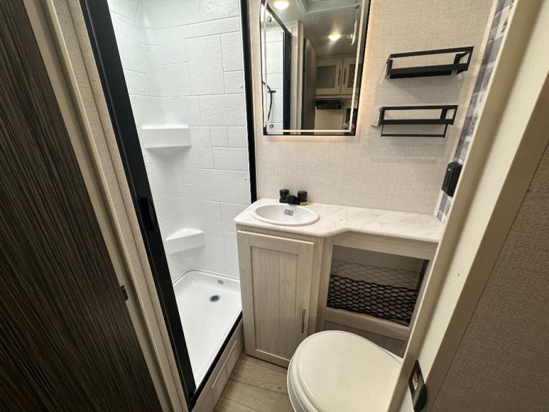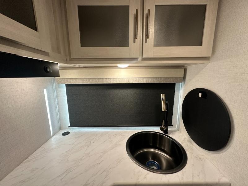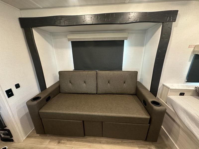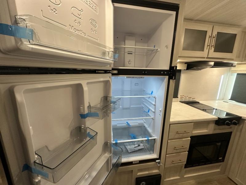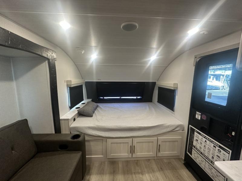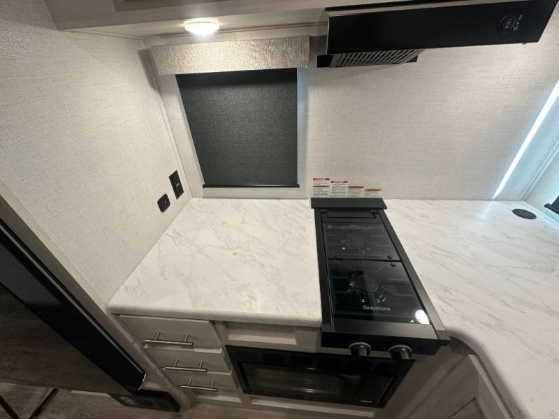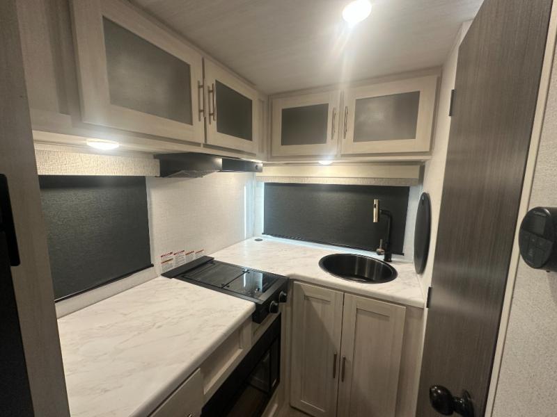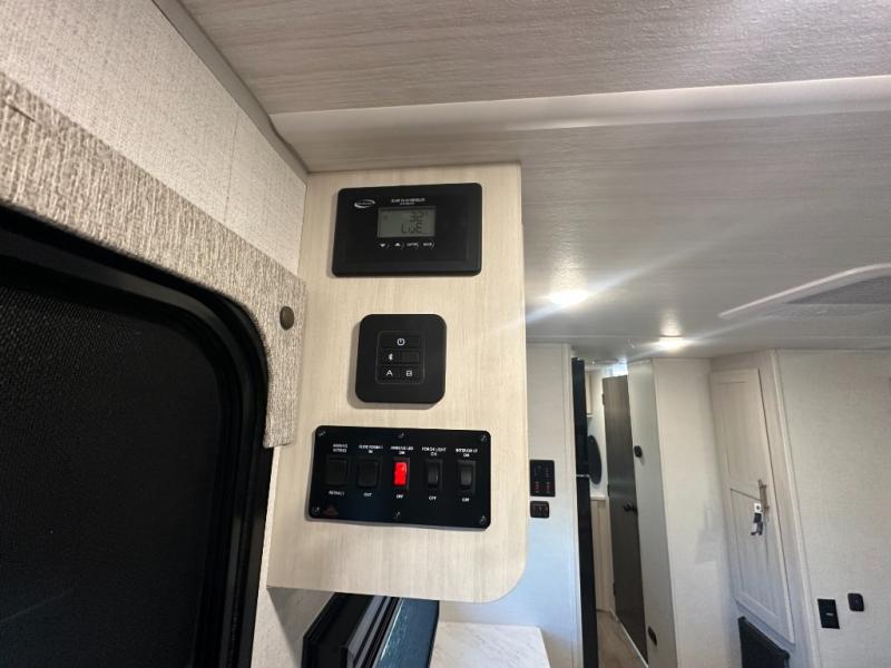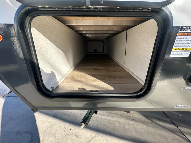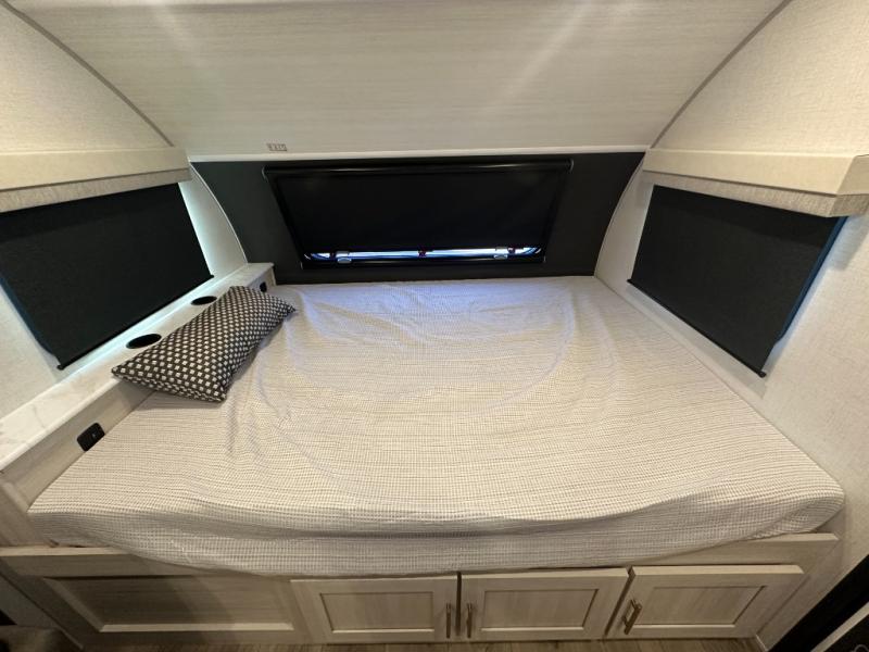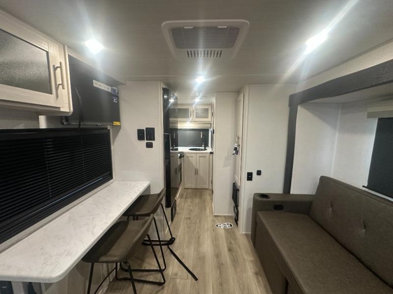 This travel trailer makes time at the campground easier than ever. Once you arrive at your site, you can put out the 14' awning, unload the exterior storage, then stretch your legs on a trail. The rear corner kitchen will let you make lunch when you return, and there is a bar top with two chairs where you can dine at. The jackknife sofa with leg rests is within a slide out so you can enjoy more floor space, and the front queen bed is sure to make you feel right at home.
