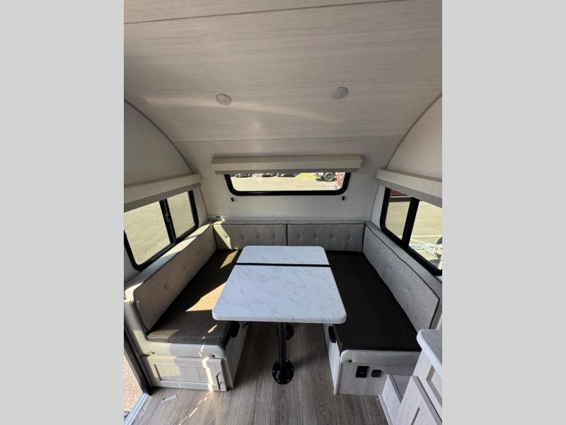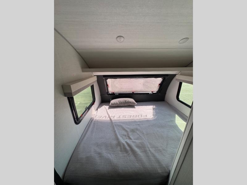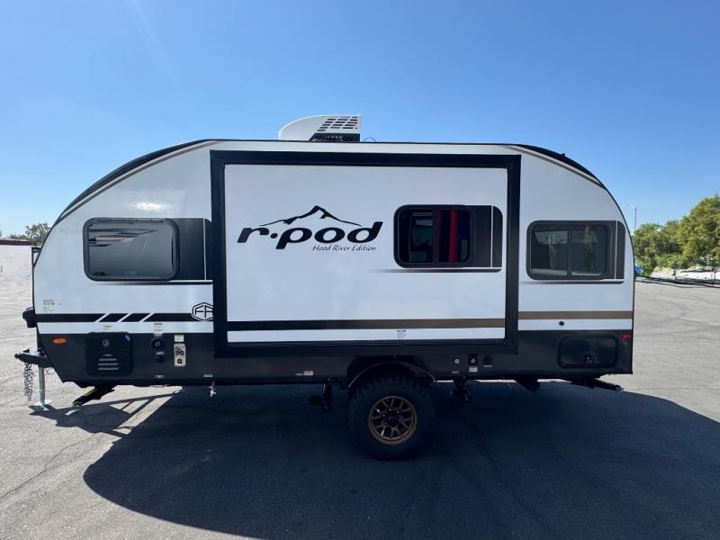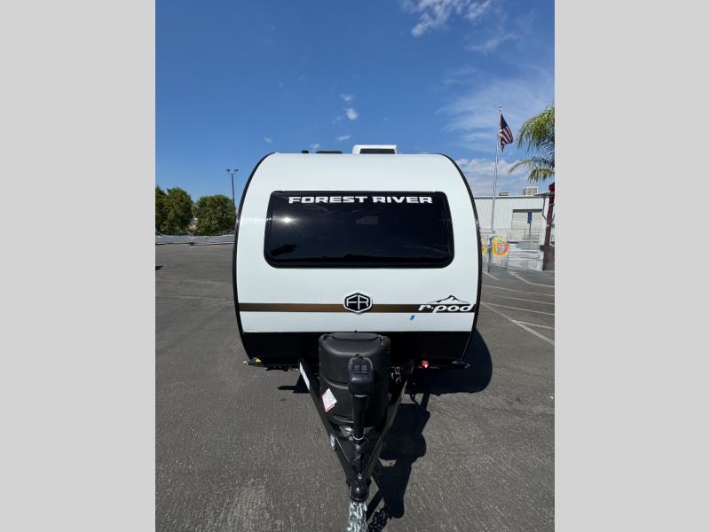 With any R-Pod travel trailer by Forest River, you will enjoy affordable luxury at the lowest tow weight in its class! There is a sealed underbelly with forced heat, a curved dual-pane acrylic front window with a bug screen and night shade, plus a large roof mounted solar panel for off-grid capabilities. The 15K A/C unit will keep you comfortable during the summer camping months, and the tankless water heater will provide endless hot showers after hiking, biking, swimming and more! Each model also includes a black glass friction hinge entrance door, roof ladder prep, exterior motion lighting, plus a hot and cold exterior spray port to wash off sand from the beach. Inside, you'll enjoy seamless Surf-X kitchen countertops, blackout roller shades, and a central vacuum system for hassle-free cleaning!