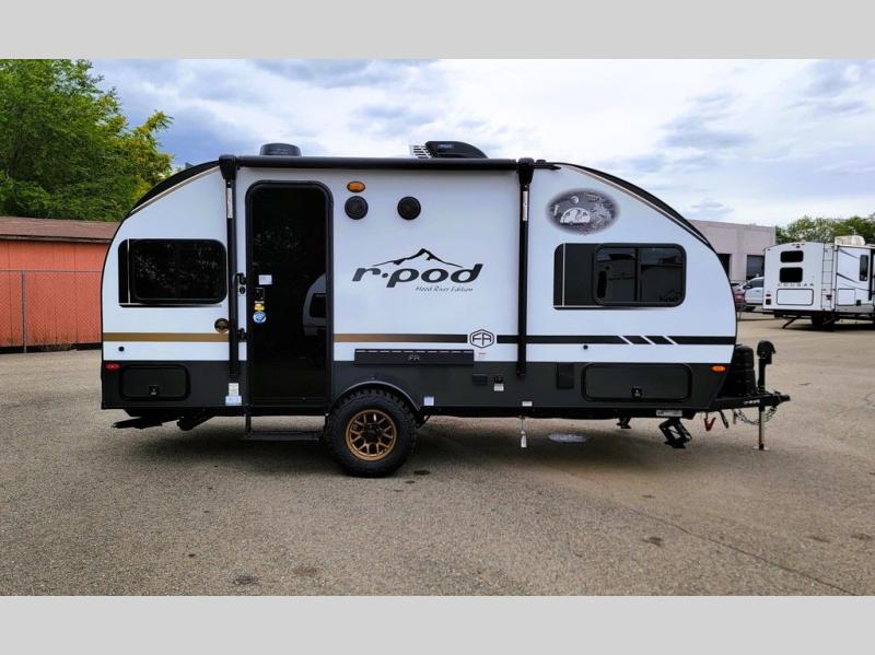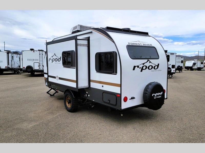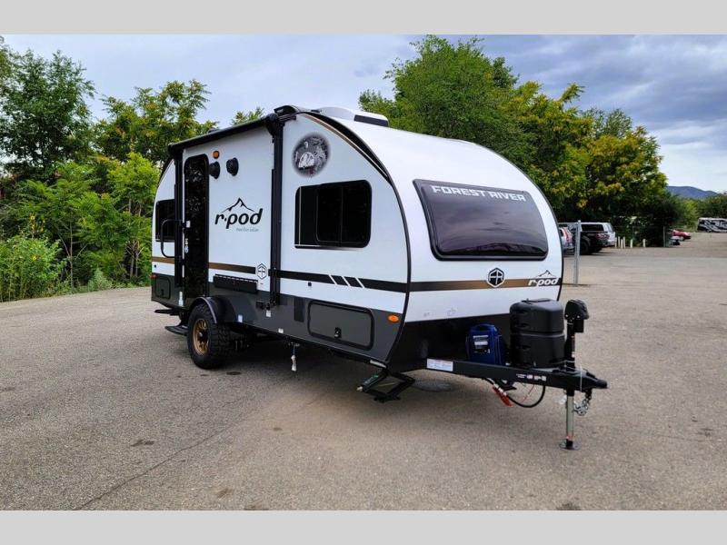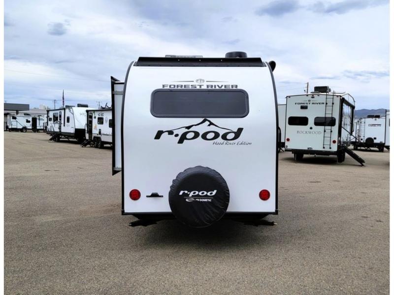 With any R-Pod travel trailer by Forest River, you will enjoy affordable luxury at the lowest tow weight in its class! There is a sealed underbelly with forced heat, a curved dual-pane acrylic front window with a bug screen and night shade, plus a large roof mounted solar panel for off-grid capabilities. The 15K A/C unit will keep you comfortable during the summer camping months, and the tankless water heater will provide endless hot showers after hiking, biking, swimming and more! Each model also includes a black glass friction hinge entrance door, roof ladder prep, exterior motion lighting, plus a hot and cold exterior spray port to wash off sand from the beach. Inside, you'll enjoy seamless Surf-X kitchen countertops, blackout roller shades, and a central vacuum system for hassle-free cleaning!
