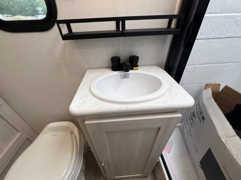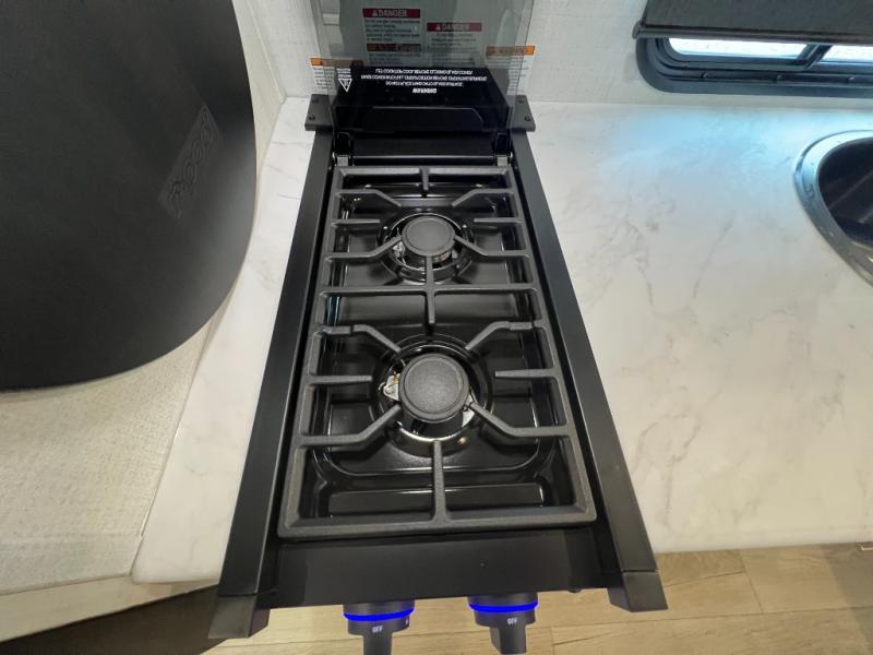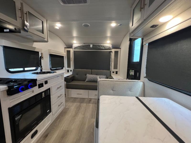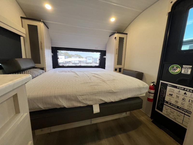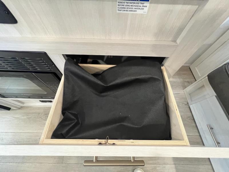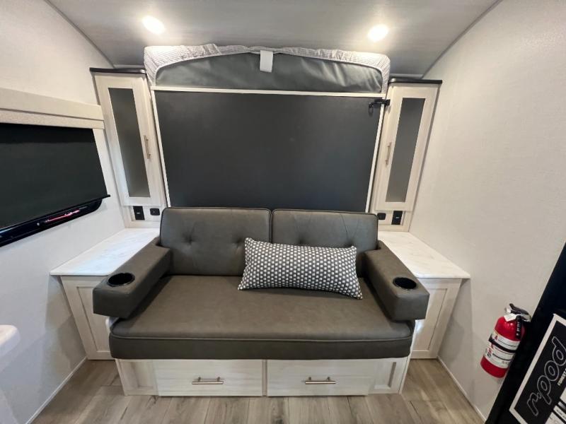 With any R-Pod travel trailer by Forest River, you will enjoy affordable luxury at the lowest tow weight in its class! There is a sealed underbelly with forced heat, a curved dual-pane acrylic front window with a bug screen and night shade, plus a large roof mounted solar panel for off-grid capabilities. The 15K A/C unit will keep you comfortable during the summer camping months, and the tankless water heater will provide endless hot showers after hiking, biking, swimming and more! Each model also includes a black glass friction hinge entrance door, roof ladder prep, exterior motion lighting, plus a hot and cold exterior spray port to wash off sand from the beach. Inside, you'll enjoy seamless Surf-X kitchen countertops, blackout roller shades, and a central vacuum system for hassle-free cleaning!