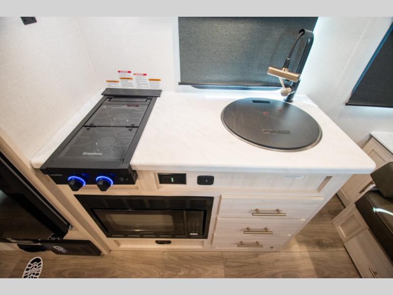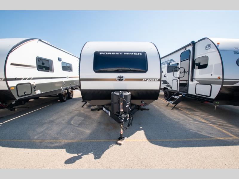 With any R-Pod travel trailer by Forest River, you will enjoy affordable luxury at the lowest tow weight in its class! There is a sealed underbelly with forced heat, a curved dual-pane acrylic front window with a bug screen and night shade, plus a large roof mounted solar panel for off-grid capabilities. The 15K A/C unit will keep you comfortable during the summer camping months, and the tankless water heater will provide endless hot showers after hiking, biking, swimming and more! Each model also includes a black glass friction hinge entrance door, roof ladder prep, exterior motion lighting, plus a hot and cold exterior spray port to wash off sand from the beach. Inside, you'll enjoy seamless Surf-X kitchen countertops, blackout roller shades, and a central vacuum system for hassle-free cleaning!