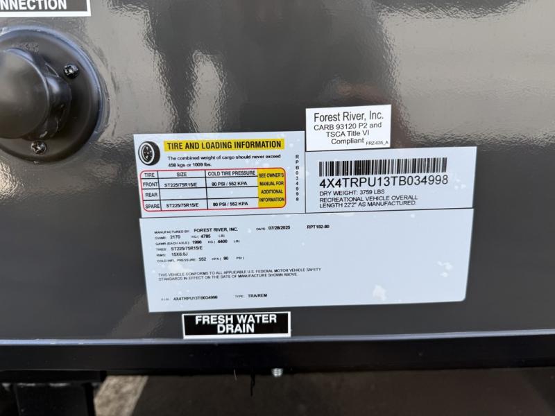 With any R-Pod travel trailer by Forest River, you will enjoy affordable luxury at the lowest tow weight in its class! There is a sealed underbelly with forced heat, a curved dual-pane acrylic front window with a bug screen and night shade, plus a large roof mounted solar panel for off-grid capabilities. The 15K A/C unit will keep you comfortable during the summer camping months, and the tankless water heater will provide endless hot showers after hiking, biking, swimming and more! Each model also includes a black glass friction hinge entrance door, roof ladder prep, exterior motion lighting, plus a hot and cold exterior spray port to wash off sand from the beach. Inside, you'll enjoy seamless Surf-X kitchen countertops, blackout roller shades, and a central vacuum system for hassle-free cleaning!
