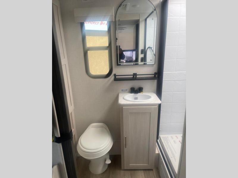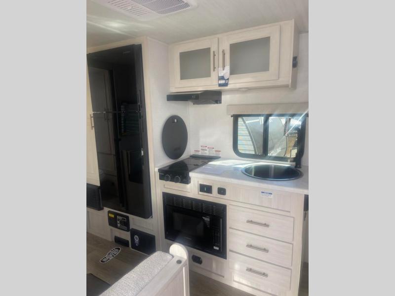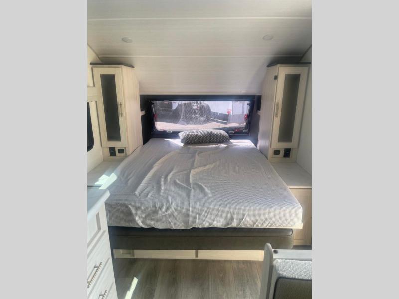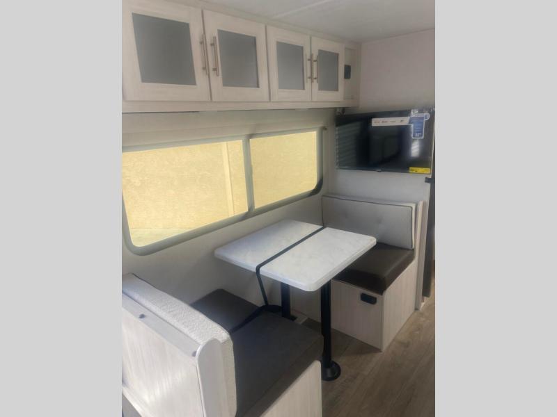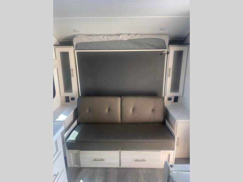 You're going to love all of the conveniences and versatility of this travel trailer! The front Murphy bed can fold away to reveal a sofa which gives you a comfortable place to sit during the day and to sleep at night too. The rear full bath features everything you will need to get squeaky clean each morning, as well as a large wardrobe for you to store your linens. After you have whipped up your best meal with the two-burner cooktop or convection microwave, you can head to the booth dinette and enjoy eating it there comfortably.