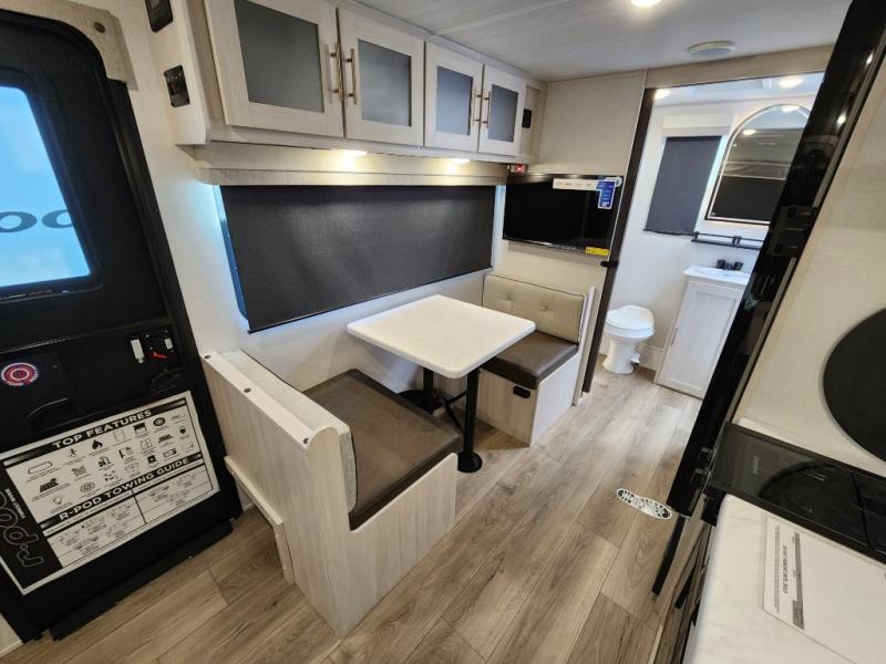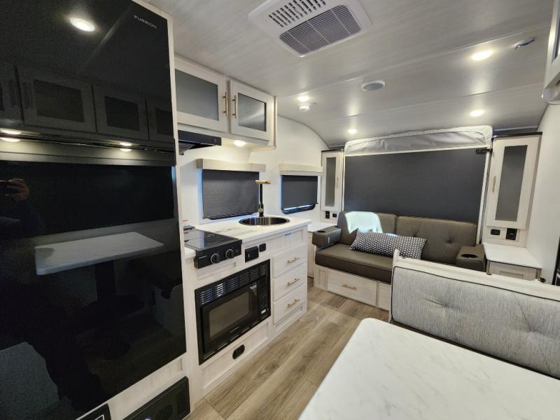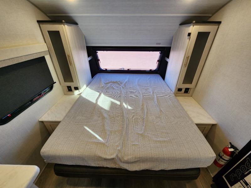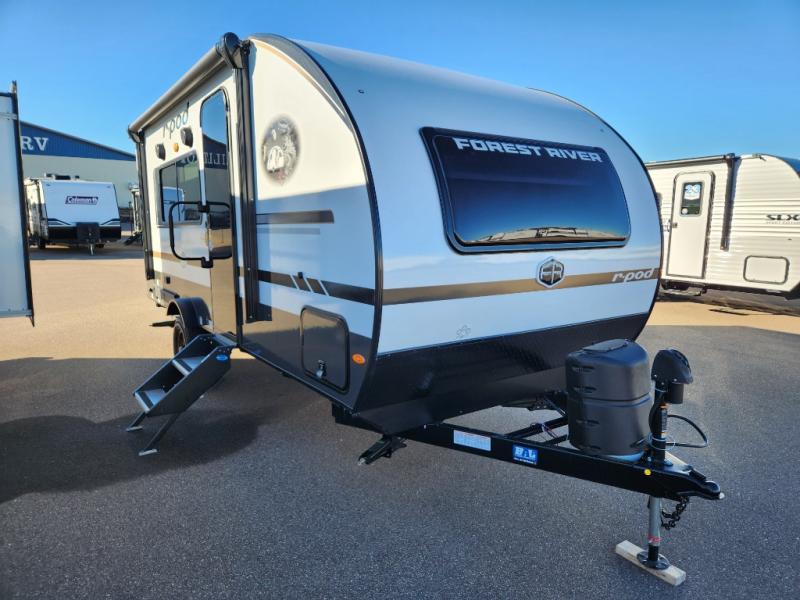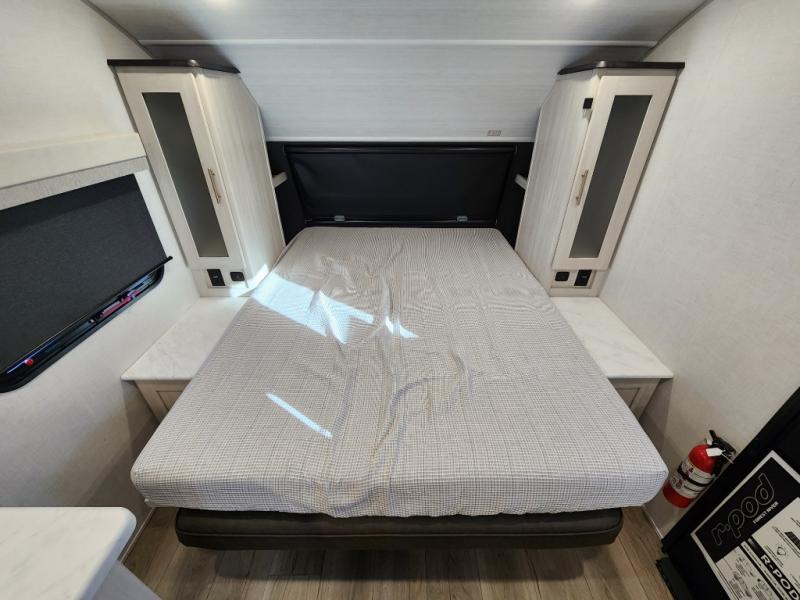 With any R-Pod travel trailer by Forest River, you will enjoy affordable luxury at the lowest tow weight in its class! There is a sealed underbelly with forced heat, a curved dual-pane acrylic front window with a bug screen and night shade, plus a large roof mounted solar panel for off-grid capabilities. The 15K A/C unit will keep you comfortable during the summer camping months, and the tankless water heater will provide endless hot showers after hiking, biking, swimming and more! Each model also includes a black glass friction hinge entrance door, roof ladder prep, exterior motion lighting, plus a hot and cold exterior spray port to wash off sand from the beach. Inside, you'll enjoy seamless Surf-X kitchen countertops, blackout roller shades, and a central vacuum system for hassle-free cleaning!