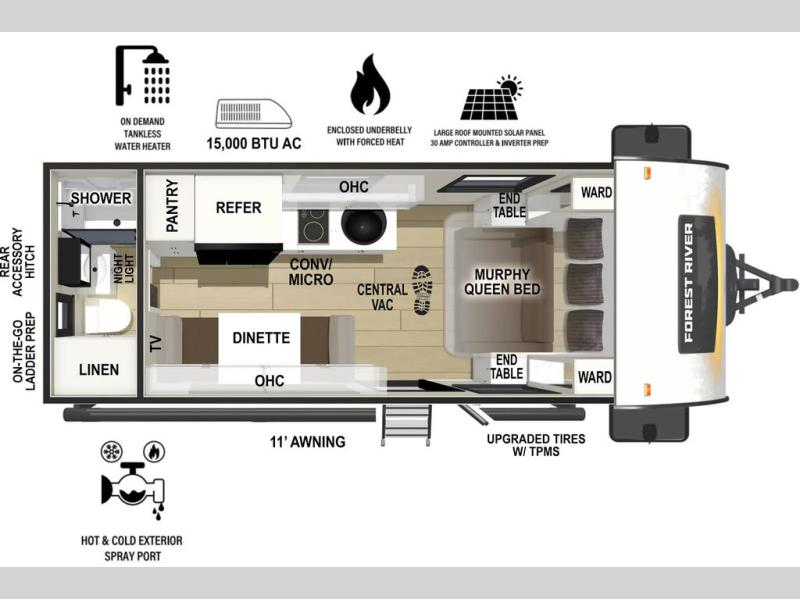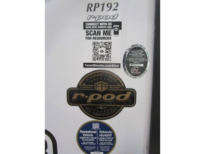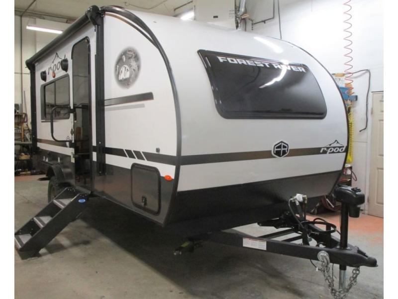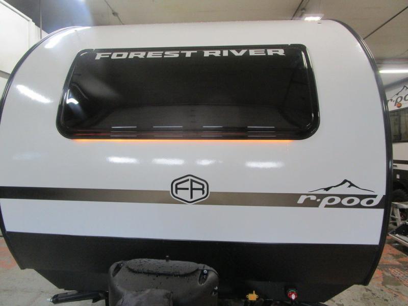 With any R-Pod travel trailer by Forest River, you will enjoy affordable luxury at the lowest tow weight in its class! There is a sealed underbelly with forced heat, a curved dual-pane acrylic front window with a bug screen and night shade, plus a large roof mounted solar panel for off-grid capabilities. The 15K A/C unit will keep you comfortable during the summer camping months, and the tankless water heater will provide endless hot showers after hiking, biking, swimming and more! Each model also includes a black glass friction hinge entrance door, roof ladder prep, exterior motion lighting, plus a hot and cold exterior spray port to wash off sand from the beach. Inside, you'll enjoy seamless Surf-X kitchen countertops, blackout roller shades, and a central vacuum system for hassle-free cleaning!