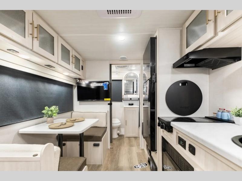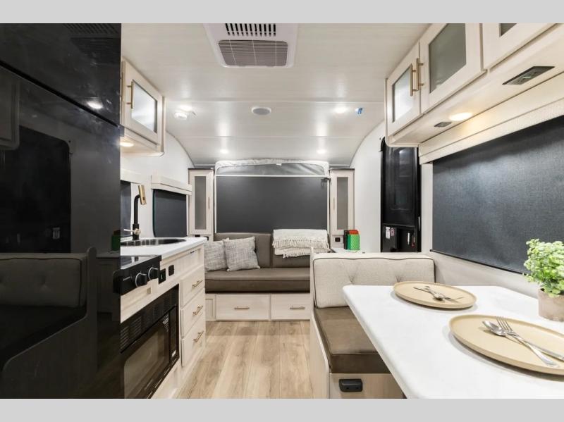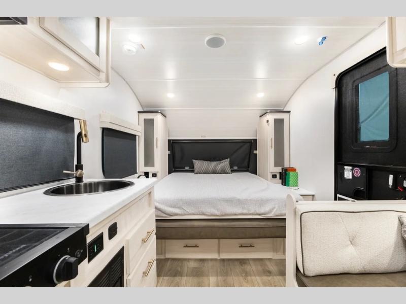 With any R-Pod travel trailer by Forest River, you will enjoy affordable luxury at the lowest tow weight in its class! There is a sealed underbelly with forced heat, a curved dual-pane acrylic front window with a bug screen and night shade, plus a large roof mounted solar panel for off-grid capabilities. The 15K A/C unit will keep you comfortable during the summer camping months, and the tankless water heater will provide endless hot showers after hiking, biking, swimming and more! Each model also includes a black glass friction hinge entrance door, roof ladder prep, exterior motion lighting, plus a hot and cold exterior spray port to wash off sand from the beach. Inside, you'll enjoy seamless Surf-X kitchen countertops, blackout roller shades, and a central vacuum system for hassle-free cleaning!
